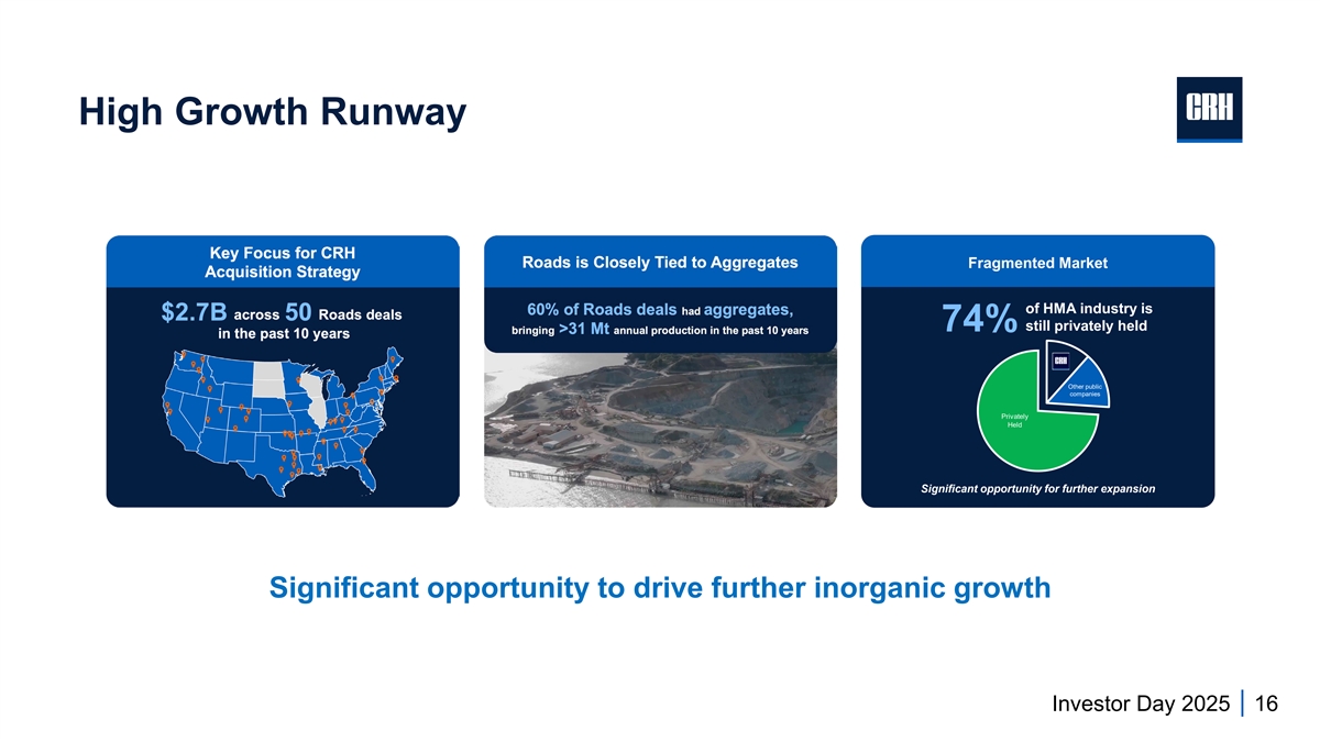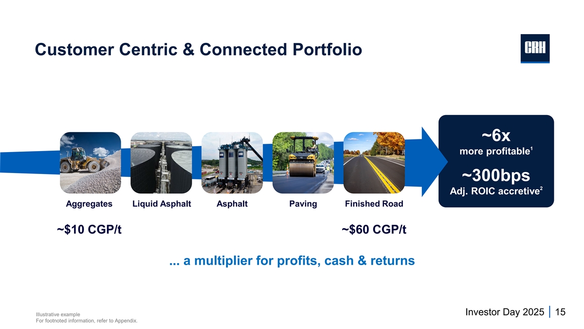 Customer Centric & Connected Portfolio ~6x 1 more profitable ~300bps 2 Adj. ROIC accretive Aggregates Liquid Asphalt Asphalt Paving Finished Road ~$10 CGP/t ~$60 CGP/t ... a multiplier for profits, cash & returns Investor Day 2025 15 Illustrative example For footnoted information, refer to Appendix.