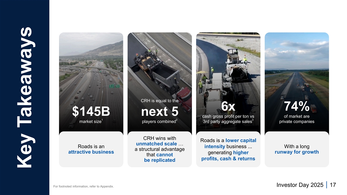 CRH is equal to the 6x 74% $145B next 5 cash gross profit per ton vs of market are 1 2 3 market size players combined 3rd party aggregate sales private companies CRH wins with Roads is a lower capital unmatched scale … Roads is an intensity business ... With a long a structural advantage attractive business runway for growth generating higher that cannot profits, cash & returns be replicated Investor Day 2025 17 For footnoted information, refer to Appendix. Key Takeaways