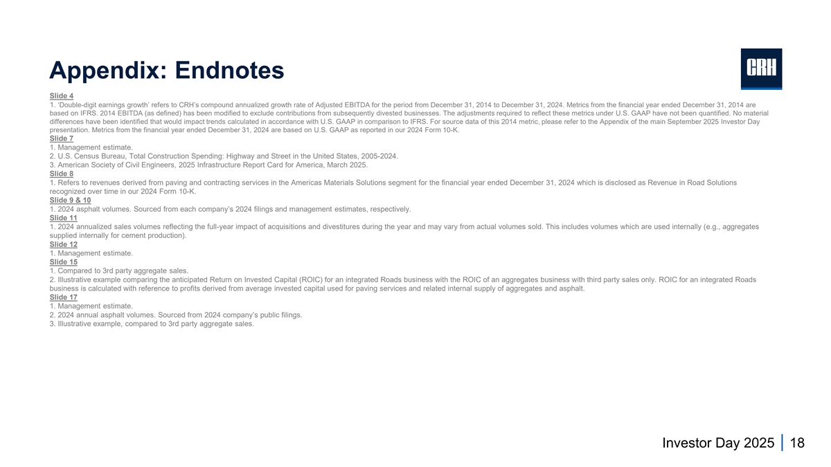 Appendix: Endnotes Slide 4 1. ‘Double-digit earnings growth’ refers to CRH’s compound annualized growth rate of Adjusted EBITDA for the period from December 31, 2014 to December 31, 2024. Metrics from the financial year ended December 31, 2014 are based on IFRS. 2014 EBITDA (as defined) has been modified to exclude contributions from subsequently divested businesses. The adjustments required to reflect these metrics under U.S. GAAP have not been quantified. No material differences have been identified that would impact trends calculated in accordance with U.S. GAAP in comparison to IFRS. For source data of this 2014 metric, please refer to the Appendix of the main September 2025 Investor Day presentation. Metrics from the financial year ended December 31, 2024 are based on U.S. GAAP as reported in our 2024 Form 10-K. Slide 7 1. Management estimate. 2. U.S. Census Bureau, Total Construction Spending: Highway and Street in the United States, 2005-2024. 3. American Society of Civil Engineers, 2025 Infrastructure Report Card for America, March 2025. Slide 8 1. Refers to revenues derived from paving and contracting services in the Americas Materials Solutions segment for the financial year ended December 31, 2024 which is disclosed as Revenue in Road Solutions recognized over time in our 2024 Form 10-K. Slide 9 & 10 1. 2024 asphalt volumes. Sourced from each company’s 2024 filings and management estimates, respectively. Slide 11 1. 2024 annualized sales volumes reflecting the full-year impact of acquisitions and divestitures during the year and may vary from actual volumes sold. This includes volumes which are used internally (e.g., aggregates supplied internally for cement production). Slide 12 1. Management estimate. Slide 15 1. Compared to 3rd party aggregate sales. 2. Illustrative example comparing the anticipated Return on Invested Capital (ROIC) for an integrated Roads business with the ROIC of an aggregates business with third party sales only. ROIC for an integrated Roads business is calculated with reference to profits derived from average invested capital used for paving services and related internal supply of aggregates and asphalt. Slide 17 1. Management estimate. 2. 2024 annual asphalt volumes. Sourced from 2024 company’s public filings. 3. Illustrative example, compared to 3rd party aggregate sales. Investor Day 2025 18