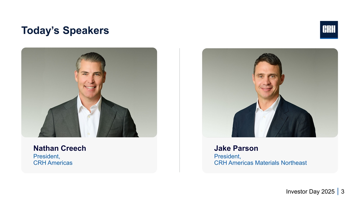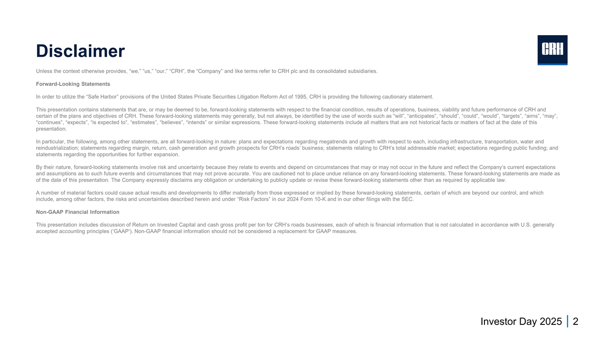 Disclaimer Unless the context otherwise provides, “we,” “us,” “our,” “CRH”, the “Company” and like terms refer to CRH plc and its consolidated subsidiaries. Forward-Looking Statements In order to utilize the “Safe Harbor” provisions of the United States Private Securities Litigation Reform Act of 1995, CRH is providing the following cautionary statement. This presentation contains statements that are, or may be deemed to be, forward-looking statements with respect to the financial condition, results of operations, business, viability and future performance of CRH and certain of the plans and objectives of CRH. These forward-looking statements may generally, but not always, be identified by the use of words such as “will”, “anticipates”, “should”, “could”, “would”, “targets”, “aims”, “may”, “continues”, “expects”, “is expected to”, “estimates”, “believes”, “intends” or similar expressions. These forward-looking statements include all matters that are not historical facts or matters of fact at the date of this presentation. In particular, the following, among other statements, are all forward-looking in nature: plans and expectations regarding megatrends and growth with respect to each, including infrastructure, transportation, water and reindustrialization; statements regarding margin, return, cash generation and growth prospects for CRH’s roads’ business; statements relating to CRH’s total addressable market; expectations regarding public funding; and statements regarding the opportunities for further expansion. By their nature, forward-looking statements involve risk and uncertainty because they relate to events and depend on circumstances that may or may not occur in the future and reflect the Company’s current expectations and assumptions as to such future events and circumstances that may not prove accurate. You are cautioned not to place undue reliance on any forward-looking statements. These forward-looking statements are made as of the date of this presentation. The Company expressly disclaims any obligation or undertaking to publicly update or revise these forward-looking statements other than as required by applicable law. A number of material factors could cause actual results and developments to differ materially from those expressed or implied by these forward-looking statements, certain of which are beyond our control, and which include, among other factors, the risks and uncertainties described herein and under “Risk Factors” in our 2024 Form 10-K and in our other filings with the SEC. Non-GAAP Financial Information This presentation includes discussion of Return on Invested Capital and cash gross profit per ton for CRH’s roads businesses, each of which is financial information that is not calculated in accordance with U.S. generally accepted accounting principles (‘GAAP’). Non-GAAP financial information should not be considered a replacement for GAAP measures. Investor Day 2025 2