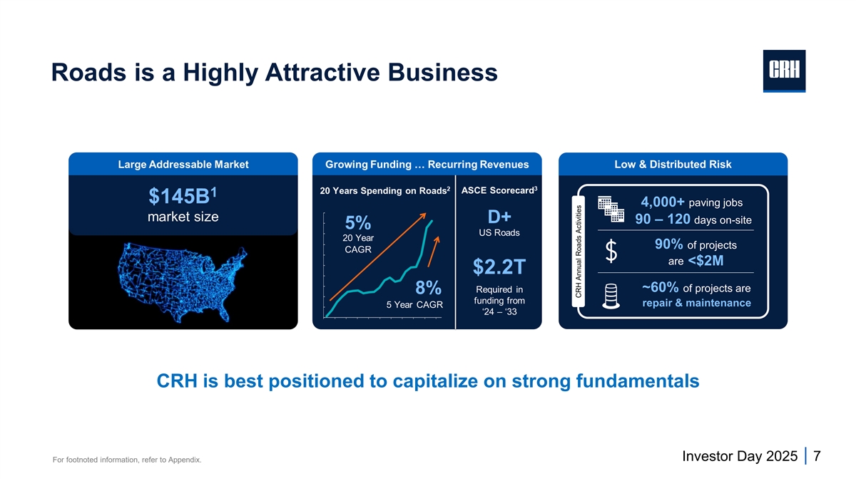 Driving Value at Scale in our US Roads Platform CRH wins with Roads is a lower capital unmatched scale … Roads is an intensity business ... With a long a structural advantage attractive business runway for growth generating higher that cannot profits, cash & returns be replicated Investor Day 2025 6