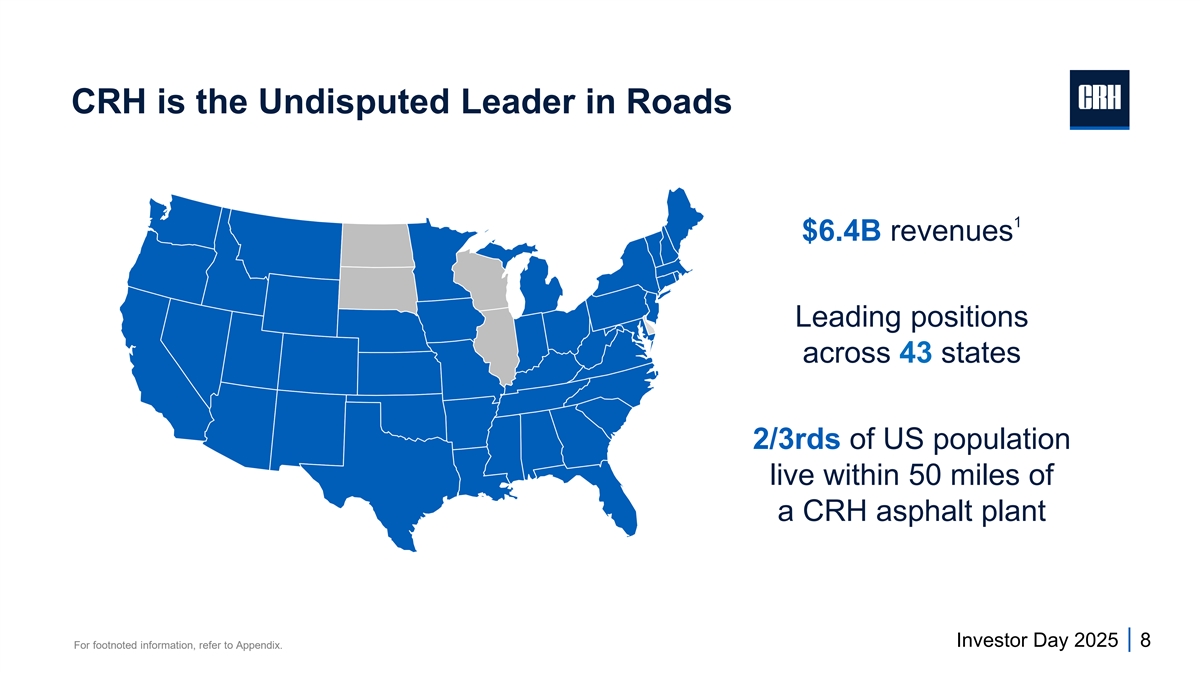 Roads is a Highly Attractive Business Low & Distributed Risk 4,000+ paving jobs 90 – 120 days on-site 90% of projects are <$2M ~60% of projects are repair & maintenance CRH is best positioned to capitalize on strong fundamentals Investor Day 2025 7 For footnoted information, refer to Appendix. CRH Annual Roads Activities