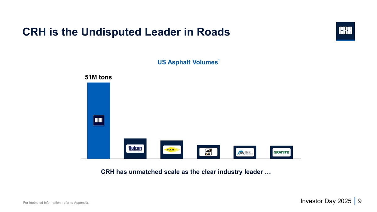 CRH is the Undisputed Leader in Roads 1 $6.4B revenues Leading positions across 43 states 2/3rds of US population live within 50 miles of a CRH asphalt plant Investor Day 2025 8 For footnoted information, refer to Appendix.