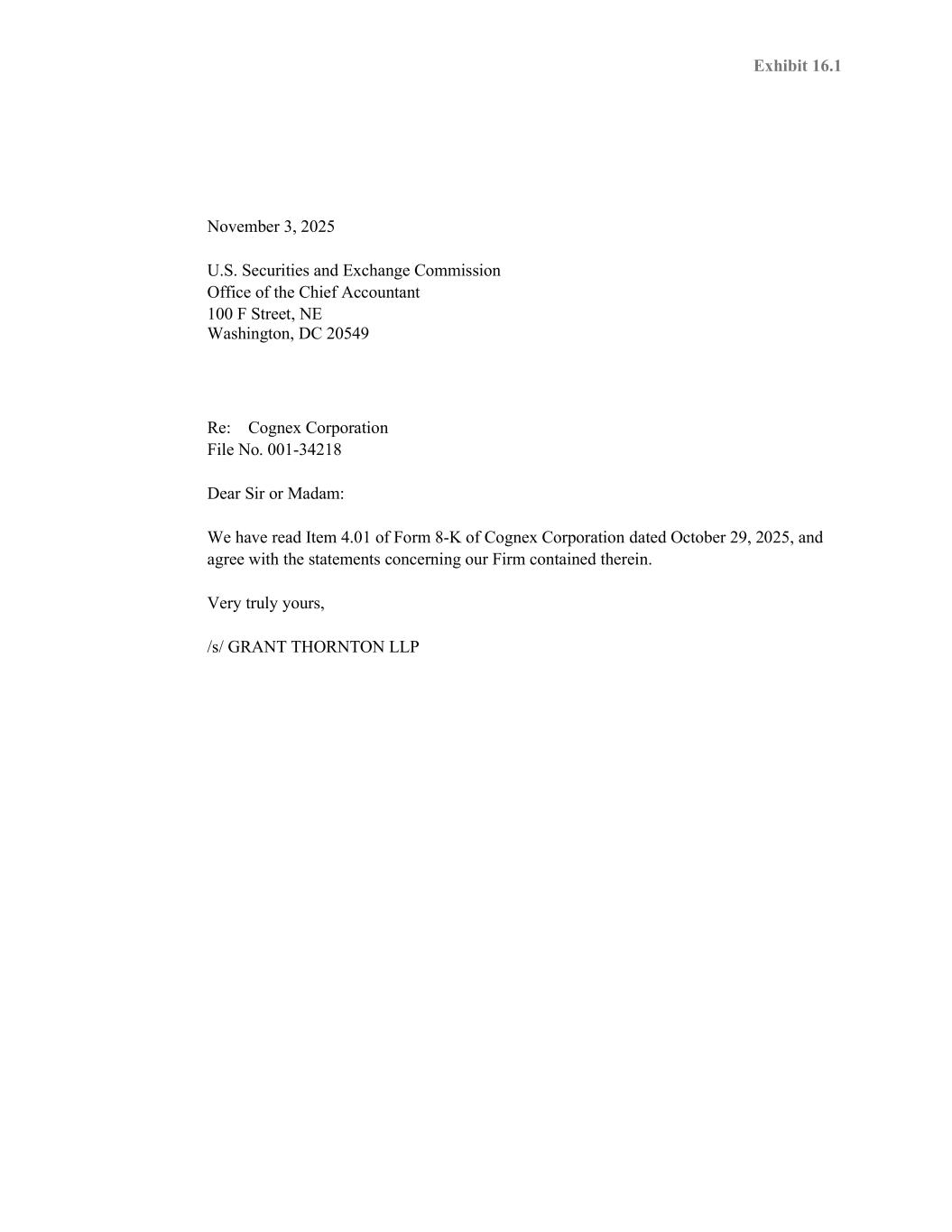Exhibit 16.1 Re: Cognex Corporation File No. 001-34218 Dear Sir or Madam: We have read Item 4.01 of Form 8-K of Cognex Corporation dated October 29, 2025, and agree with the statements concerning our Firm contained therein. Very truly yours, /s/ GRANT THORNTON LLP November 3, 2025 U.S. Securities and Exchange Commission Office of the Chief Accountant 100 F Street, NE Washington, DC 20549