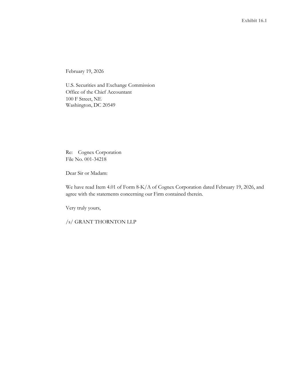 Exhibit 16.1 Re: Cognex Corporation File No. 001-34218 Dear Sir or Madam: We have read Item 4.01 of Form 8-K/A of Cognex Corporation dated February 19, 2026, and agree with the statements concerning our Firm contained therein. Very truly yours, /s/ GRANT THORNTON LLP February 19, 2026 U.S. Securities and Exchange Commission Office of the Chief Accountant 100 F Street, NE Washington, DC 20549