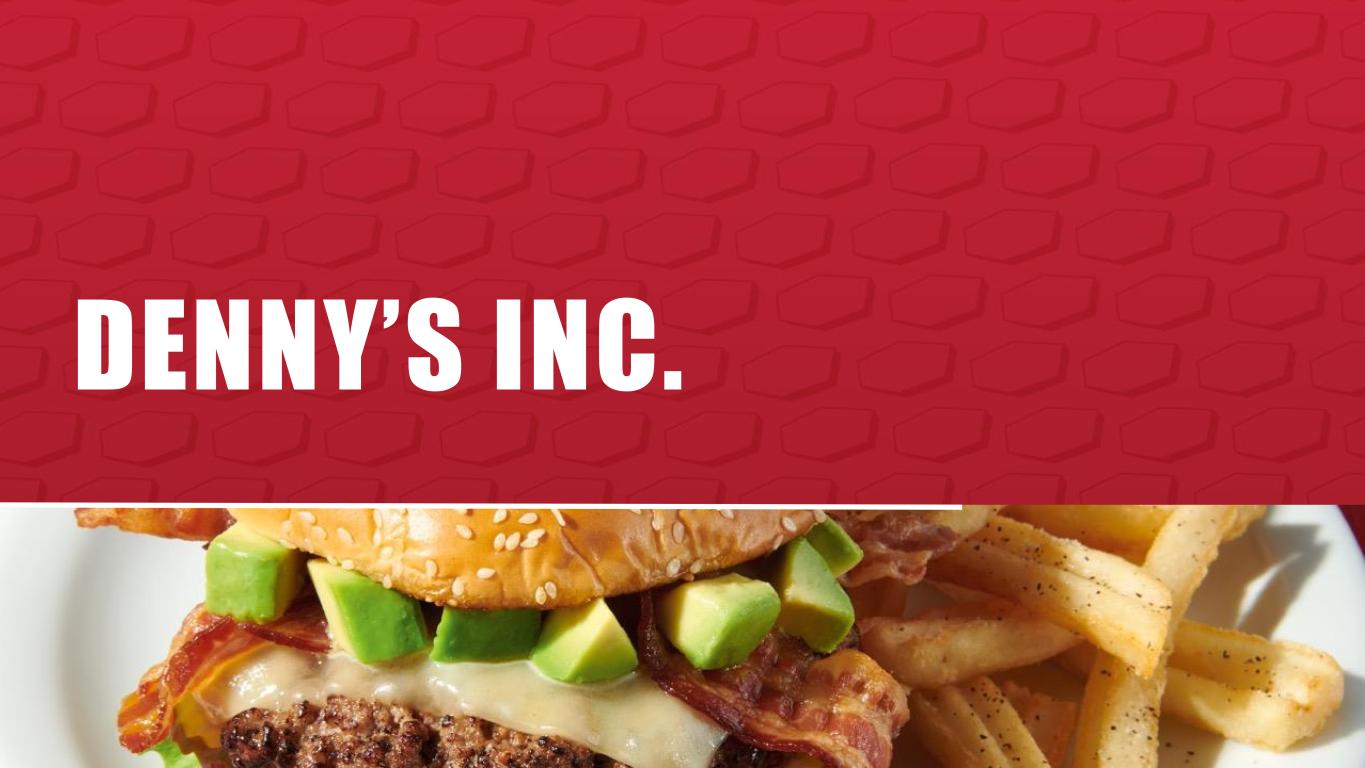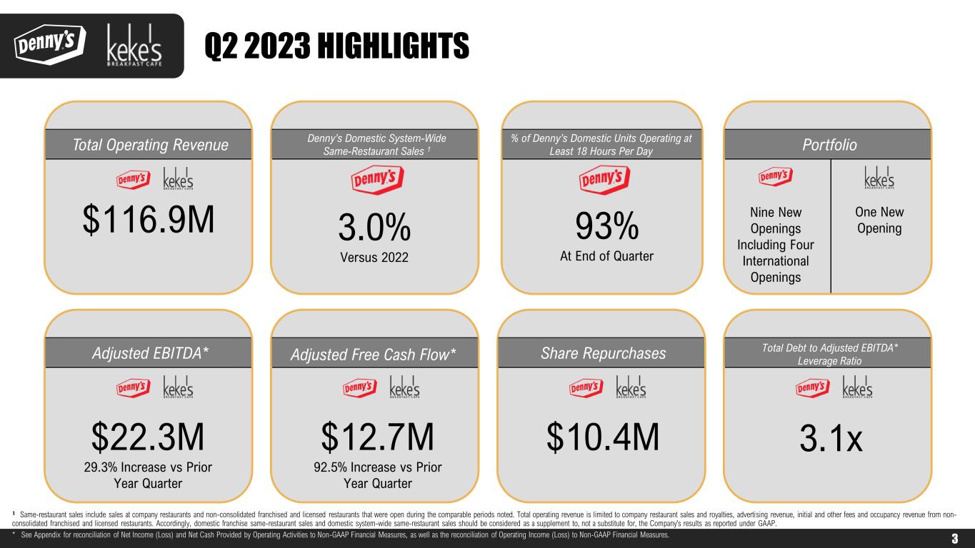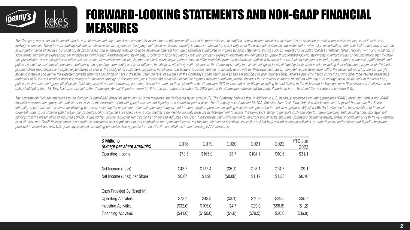 FORWARD-LOOKING STATEMENTS AND NON-GAAP FINANCIAL MEASURES The Company urges caution in considering its current trends and any outlook on earnings disclosed either in this presentation or in its press releases. In addition, certain matters discussed in either this presentation or related press releases may constitute forward- looking statements. These forward-looking statements, which reflect management's best judgment based on factors currently known, are intended to speak only as of the date such statements are made and involve risks, uncertainties, and other factors that may cause the actual performance of Denny’s Corporation, its subsidiaries, and underlying restaurants to be materially different from the performance indicated or implied by such statements. Words such as “expect”, “anticipate”, “believe”, “intend”, “plan”, “hope”, "will", and variations of such words and similar expressions are intended to identify such forward-looking statements. Except as may be required by law, the Company expressly disclaims any obligation to update these forward-looking statements to reflect events or circumstances after the date this presentation was published or to reflect the occurrence of unanticipated events. Factors that could cause actual performance to differ materially from the performance indicated by these forward-looking statements include, among others: economic, public health and political conditions that impact consumer confidence and spending; commodity and labor inflation; the ability to effectively staff restaurants; the Company's ability to maintain adequate levels of liquidity for its cash needs, including debt obligations, payment of dividends, planned share repurchases and capital expenditures as well as the ability of its customers, suppliers, franchisees and lenders to access sources of liquidity to provide for their own cash needs; competitive pressures from within the restaurant industry; the Company's ability to integrate and derive the expected benefits from its acquisition of Keke's Breakfast Cafe; the level of success of the Company’s operating initiatives and advertising and promotional efforts; adverse publicity; health concerns arising from food-related pandemics, outbreaks of flu viruses or other diseases; changes in business strategy or development plans; terms and availability of capital; regional weather conditions; overall changes in the general economy (including with regard to energy costs), particularly at the retail level; political environment and geopolitical events (including acts of war and terrorism); and other factors from time to time set forth in the Company’s SEC reports and other filings, including but not limited to the discussion in Management’s Discussion and Analysis and the risks identified in Item 1A. Risk Factors contained in the Company’s Annual Report on Form 10-K for the year ended December 28, 2022 (and in the Company’s subsequent Quarterly Reports on Form 10-Q and Current Reports on Form 8-K). The presentation includes references to the Company’s non-GAAP financials measures. All such measures are designated by an asterisk (*). The Company believes that, in addition to U.S. generally accepted accounting principles (GAAP) measures, certain non-GAAP financial measures are appropriate indicators to assist in the evaluation of operating performance and liquidity on a period-to-period basis. The Company uses Adjusted EBITDA, Adjusted Free Cash Flow, Adjusted Net Income and Adjusted Net Income Per Share internally as performance measures for planning purposes, including the preparation of annual operating budgets, and for compensation purposes, including incentive compensation for certain employees. Adjusted EBITDA is also used in the calculation of financial covenant ratios in accordance with the Company’s credit facility. Adjusted Free Cash Flow is also used as a non-GAAP liquidity measure by Management to assess the Company’s ability to generate cash and plan for future operating and capital actions. Management believes that the presentation of Adjusted EBITDA, Adjusted Net Income, Adjusted Net Income Per Share and Adjusted Free Cash Flow provide useful information to investors and analysts about the Company’s operating results, financial condition or cash flows. However, each of these non-GAAP financial measures should be considered as a supplement to, not a substitute for, operating income, net income, net income per share, net cash provided by (used in) operating activities, or other financial performance and liquidity measures prepared in accordance with U.S. generally accepted accounting principles. See Appendix for non-GAAP reconciliations to the following GAAP measures: $ Millions (except per share amounts) 2018 2019 2020 2021 2022 YTD Jun 2023 Operating Income $73.6 $165.0 $6.7 $104.1 $60.6 $31.1 Net Income (Loss) $43.7 $117.4 ($5.1) $78.1 $74.7 $9.1 Net Income (Loss) per Share $0.67 $1.90 ($0.08) $1.19 $1.23 $0.16 Cash Provided By (Used In): Operating Activities $73.7 $43.3 ($3.1) $76.2 $39.5 $35.7 Investing Activities ($32.0) $105.0 $4.7 $29.0 ($86.6) ($1.2) Financing Activities ($41.6) ($150.0) ($1.0) ($78.5) $20.0 ($36.9) 2