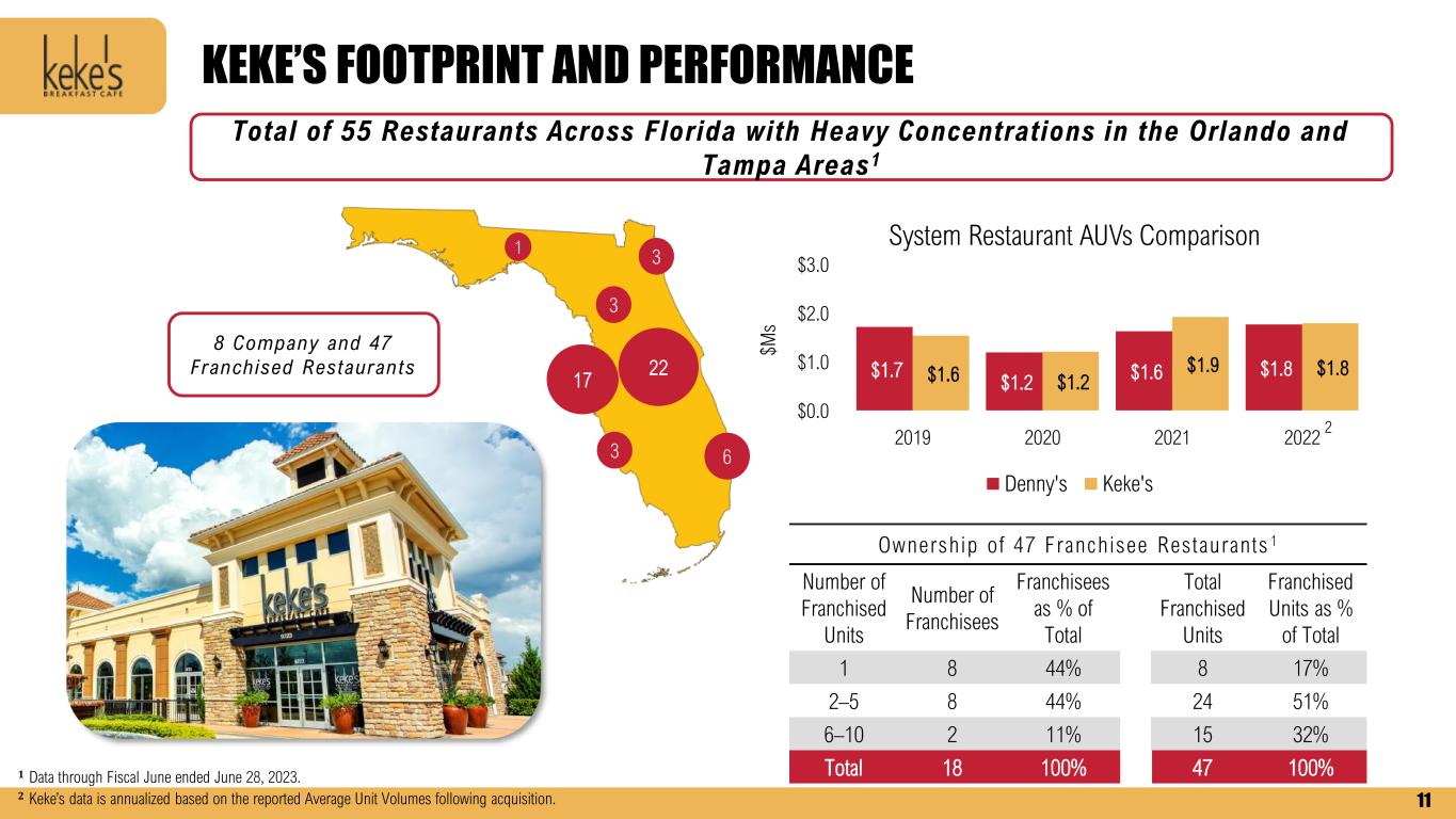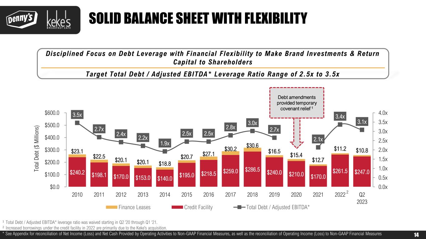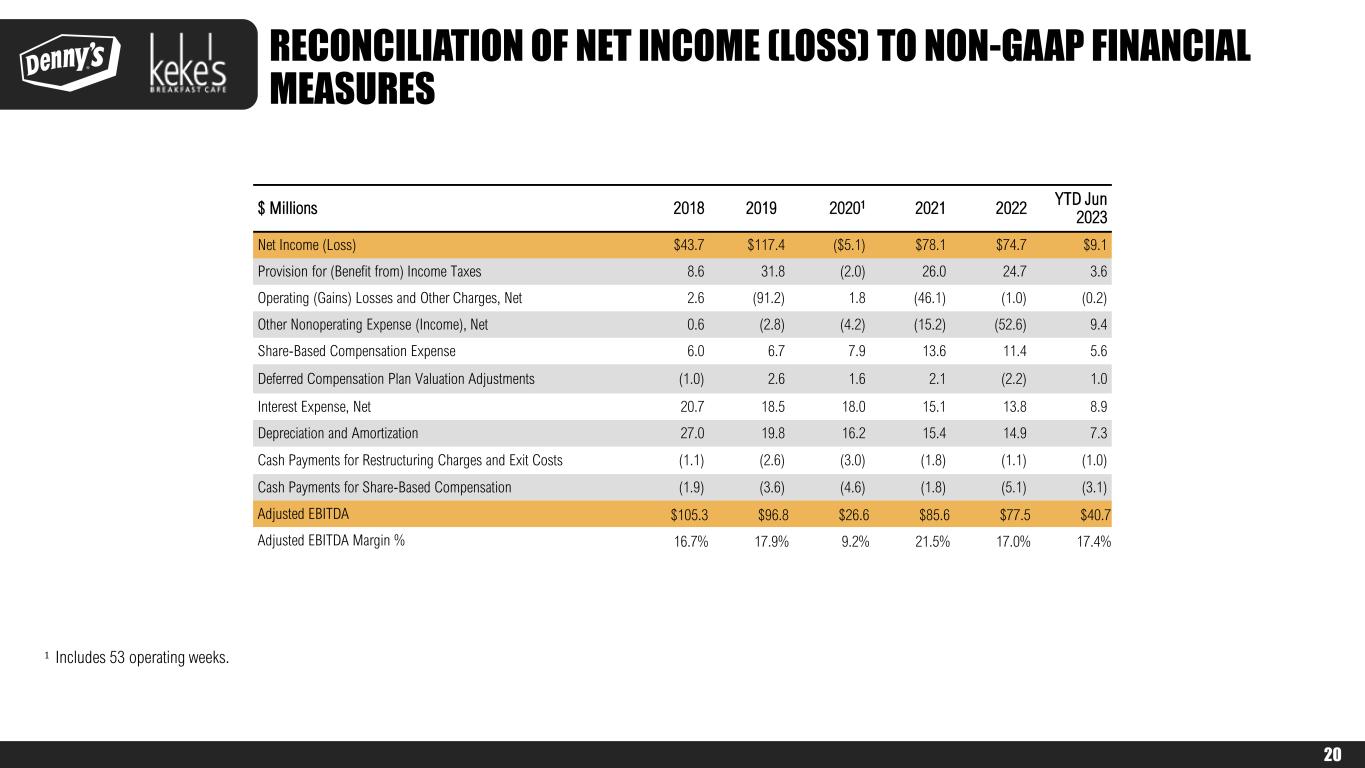 FORWARD-LOOKING STATEMENTS AND NON-GAAP FINANCIAL MEASURES The Company urges caution in considering its current trends and any outlook on earnings disclosed either in this presentation or in its press releases. In addition, certain matters discussed in either this presentation or related press releases may constitute forward- looking statements. These forward-looking statements, which reflect management's best judgment based on factors currently known, are intended to speak only as of the date such statements are made and involve risks, uncertainties, and other factors that may cause the actual performance of Denny’s Corporation, its subsidiaries, and underlying restaurants to be materially different from the performance indicated or implied by such statements. Words such as “expect”, “anticipate”, “believe”, “intend”, “plan”, “hope”, "will", and variations of such words and similar expressions are intended to identify such forward-looking statements. Except as may be required by law, the Company expressly disclaims any obligation to update these forward-looking statements to reflect events or circumstances after the date this presentation was published or to reflect the occurrence of unanticipated events. Factors that could cause actual performance to differ materially from the performance indicated by these forward-looking statements include, among others: economic, public health and political conditions that impact consumer confidence and spending; commodity and labor inflation; the ability to effectively staff restaurants; the Company's ability to maintain adequate levels of liquidity for its cash needs, including debt obligations, payment of dividends, planned share repurchases and capital expenditures as well as the ability of its customers, suppliers, franchisees and lenders to access sources of liquidity to provide for their own cash needs; competitive pressures from within the restaurant industry; the Company's ability to integrate and derive the expected benefits from its acquisition of Keke's Breakfast Cafe; the level of success of the Company’s operating initiatives and advertising and promotional efforts; adverse publicity; health concerns arising from food-related pandemics, outbreaks of flu viruses or other diseases; changes in business strategy or development plans; terms and availability of capital; regional weather conditions; overall changes in the general economy (including with regard to energy costs), particularly at the retail level; political environment and geopolitical events (including acts of war and terrorism); and other factors from time to time set forth in the Company’s SEC reports and other filings, including but not limited to the discussion in Management’s Discussion and Analysis and the risks identified in Item 1A. Risk Factors contained in the Company’s Annual Report on Form 10-K for the year ended December 28, 2022 (and in the Company’s subsequent Quarterly Reports on Form 10-Q and Current Reports on Form 8-K). The presentation includes references to the Company’s non-GAAP financials measures. All such measures are designated by an asterisk (*). The Company believes that, in addition to U.S. generally accepted accounting principles (GAAP) measures, certain non-GAAP financial measures are appropriate indicators to assist in the evaluation of operating performance and liquidity on a period-to-period basis. The Company uses Adjusted EBITDA, Adjusted Free Cash Flow, Adjusted Net Income and Adjusted Net Income Per Share internally as performance measures for planning purposes, including the preparation of annual operating budgets, and for compensation purposes, including incentive compensation for certain employees. Adjusted EBITDA is also used in the calculation of financial covenant ratios in accordance with the Company’s credit facility. Adjusted Free Cash Flow is also used as a non-GAAP liquidity measure by Management to assess the Company’s ability to generate cash and plan for future operating and capital actions. Management believes that the presentation of Adjusted EBITDA, Adjusted Net Income, Adjusted Net Income Per Share and Adjusted Free Cash Flow provide useful information to investors and analysts about the Company’s operating results, financial condition or cash flows. However, each of these non-GAAP financial measures should be considered as a supplement to, not a substitute for, operating income, net income, net income per share, net cash provided by (used in) operating activities, or other financial performance and liquidity measures prepared in accordance with U.S. generally accepted accounting principles. See Appendix for non-GAAP reconciliations to the following GAAP measures: $ Millions (except per share amounts) 2018 2019 2020 2021 2022 YTD Jun 2023 Operating Income $73.6 $165.0 $6.7 $104.1 $60.6 $31.1 Net Income (Loss) $43.7 $117.4 ($5.1) $78.1 $74.7 $9.1 Net Income (Loss) per Share $0.67 $1.90 ($0.08) $1.19 $1.23 $0.16 Cash Provided By (Used In): Operating Activities $73.7 $43.3 ($3.1) $76.2 $39.5 $35.7 Investing Activities ($32.0) $105.0 $4.7 $29.0 ($86.6) ($1.2) Financing Activities ($41.6) ($150.0) ($1.0) ($78.5) $20.0 ($36.9) 2
