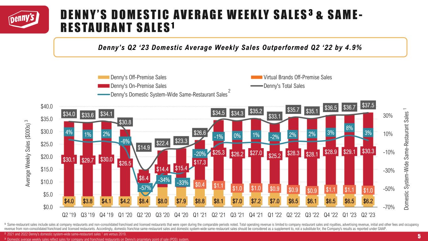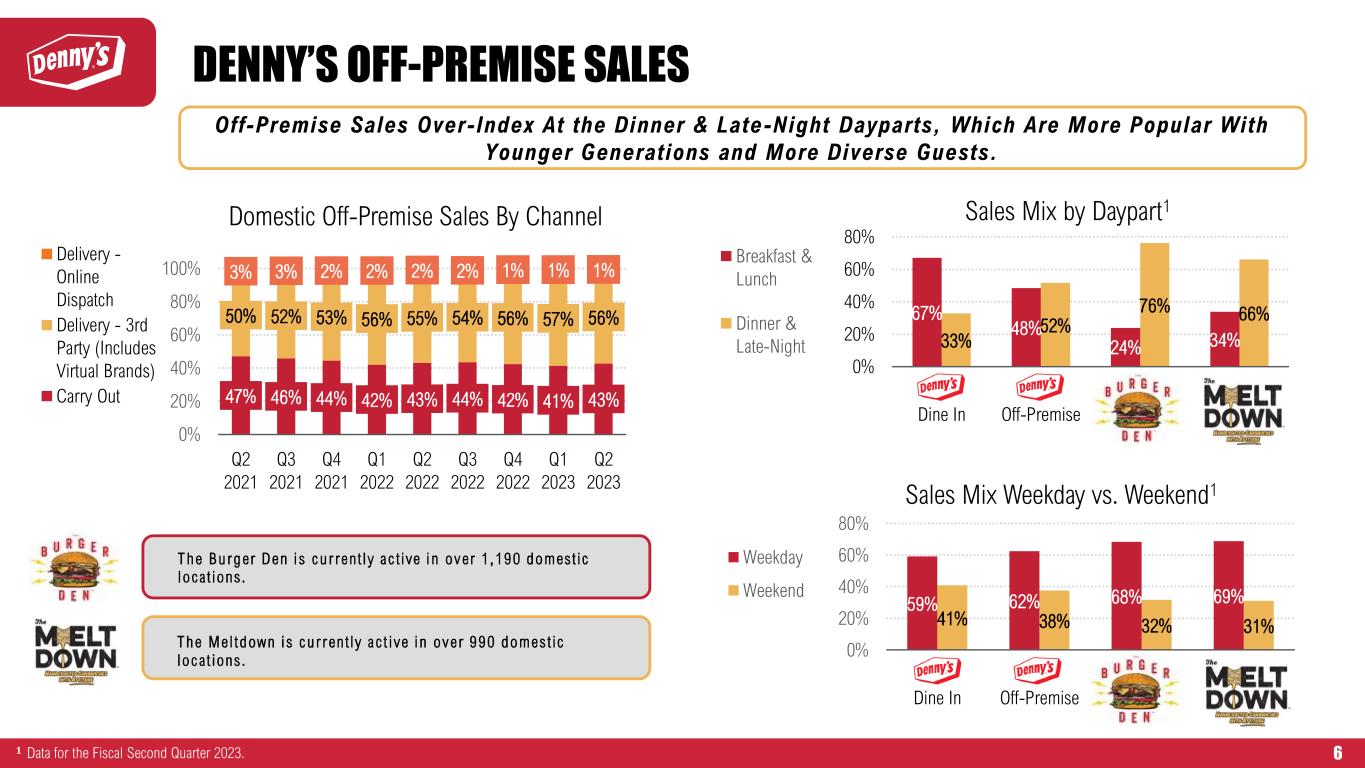 D E N N Y ’ S D O M E S T I C A V E R A G E W E E K LY S A L E S 3 & S A M E - R E S TA U R A N T S A L E S 1 $4.0 $3.8 $4.1 $4.2 $8.4 $8.0 $7.9 $8.8 $8.1 $7.0 $7.2 $7.0 $6.5 $6.1 $6.5 $6.5 $6.2 $0.4 $1.1 $1.0 $1.0 $0.9 $0.9 $0.9 $1.1 $1.1 $1.0 $30.1 $29.7 $30.0 $26.5 $6.4 $14.4 $15.4 $17.3 $25.3 $26.2 $27.0 $25.2 $28.3 $28.1 $28.9 $29.1 $30.3 $34.0 $33.6 $34.1 $30.8 $14.9 $22.4 $23.3 $26.6 $34.5 $34.3 $35.2 $33.1 $35.7 $35.1 $36.5 $36.7 $37.5 4% 1% 2% -6% -57% -34% -33% -20% -1% 0% 1% -2% 2% 2% 3% 8% 3% -70% -50% -30% -10% 10% 30% $0.0 $5.0 $10.0 $15.0 $20.0 $25.0 $30.0 $35.0 $40.0 Q2 '19 Q3 '19 Q4 '19 Q1 '20 Q2 '20 Q3 '20 Q4 '20 Q1 '21 Q2 '21 Q3 '21 Q4 '21 Q1 '22 Q2 '22 Q3 '22 Q4 '22 Q1 '23 Q2 '23 D om es tic S ys te m -W id e S am e- R es ta ur an t S al es 1 A ve ra ge W ee kl y S al es ( $0 00 s) 3 Denny's Off-Premise Sales Virtual Brands Off-Premise Sales Denny's On-Premise Sales Denny's Total Sales Denny's Domestic System-Wide Same-Restaurant Sales 𝟏 Same-restaurant sales include sales at company restaurants and non-consolidated franchised and licensed restaurants that were open during the comparable periods noted. Total operating revenue is limited to company restaurant sales and royalties, advertising revenue, initial and other fees and occupancy revenue from non-consolidated franchised and licensed restaurants. Accordingly, domestic franchise same-restaurant sales and domestic system-wide same-restaurant sales should be considered as a supplement to, not a substitute for, the Company’s results as reported under GAAP. 𝟐 2021 and 2022 Denny’s domestic system-wide same-restaurant sales 1 are versus 2019. 𝟑 Domestic average weekly sales reflect sales for company and franchised restaurants on Denny’s proprietary point of sale (POS) system. Denny’s Q2 ‘23 Domestic Average Weekly Sales Outperformed Q2 ‘22 by 4.9% 2 5