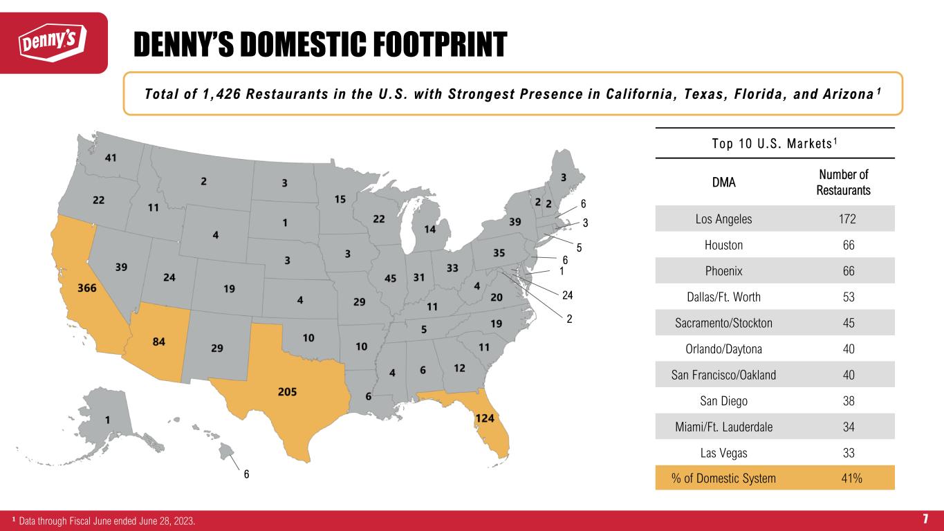 DENNY’S OFF-PREMISE SALES 47% 46% 44% 42% 43% 44% 42% 41% 43% 50% 52% 53% 56% 55% 54% 56% 57% 56% 3% 3% 2% 2% 2% 2% 1% 1% 1% 0% 20% 40% 60% 80% 100% Q2 2021 Q3 2021 Q4 2021 Q1 2022 Q2 2022 Q3 2022 Q4 2022 Q1 2023 Q2 2023 Domestic Off-Premise Sales By Channel Delivery - Online Dispatch Delivery - 3rd Party (Includes Virtual Brands) Carry Out 𝟏 Data for the Fiscal Second Quarter 2023. The Bu r ger Den i s cu r ren t l y a c t i ve i n o v er 1 , 190 domes t i c l o ca t ions . The Me l t down i s cu r r en t l y a c t i ve i n o v e r 990 domes t i c l o c a t ions . 67% 48% 24% 34%33% 52% 76% 66% 0% 20% 40% 60% 80% Dine In Off-Premise The Burger Den The Meltdown Sales Mix by Daypart1 Breakfast & Lunch Dinner & Late-Night 59% 62% 68% 69% 41% 38% 32% 31% 0% 20% 40% 60% 80% Dine In Off-Premise The Burger Den The Meltdown Sales Mix Weekday vs. Weekend1 Weekday Weekend Off-Premise Sales Over-Index At the Dinner & Late-Night Dayparts, Which Are More Popular With Younger Generations and More Diverse Guests. 6