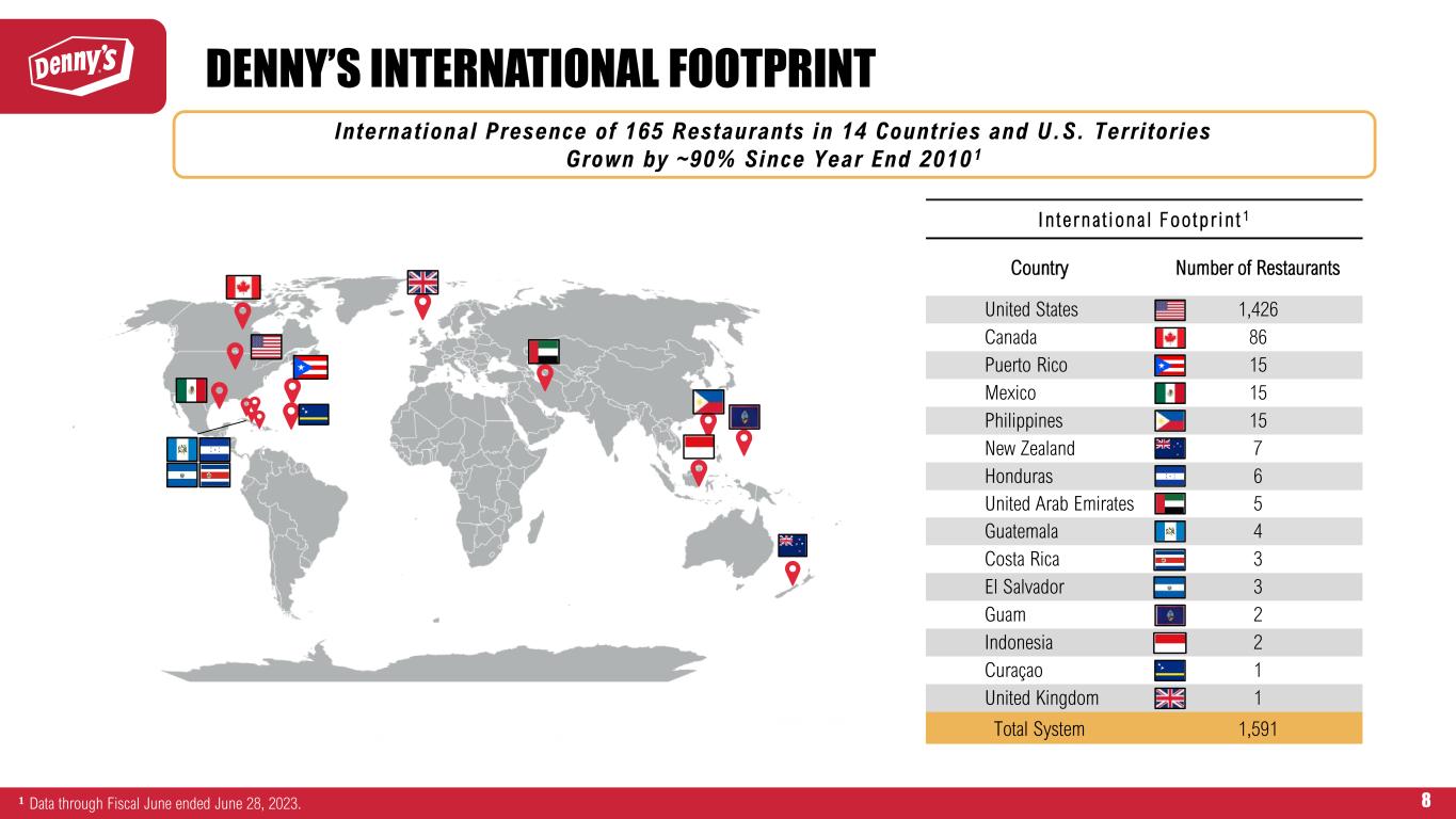 8 I n t e rna t i ona l Foo tp r i n t 1 Country Number of Restaurants United States 1,426 Canada 86 Puerto Rico 15 Mexico 15 Philippines 15 New Zealand 7 Honduras 6 United Arab Emirates 5 Guatemala 4 Costa Rica 3 El Salvador 3 Guam 2 Indonesia 2 Curaçao 1 United Kingdom 1 Total System 1,591 International Presence of 165 Restaurants in 14 Countries and U.S. Territories Grown by ~90% Since Year End 2010 1 𝟏 Data through Fiscal June ended June 28, 2023. DENNY’S INTERNATIONAL FOOTPRINT