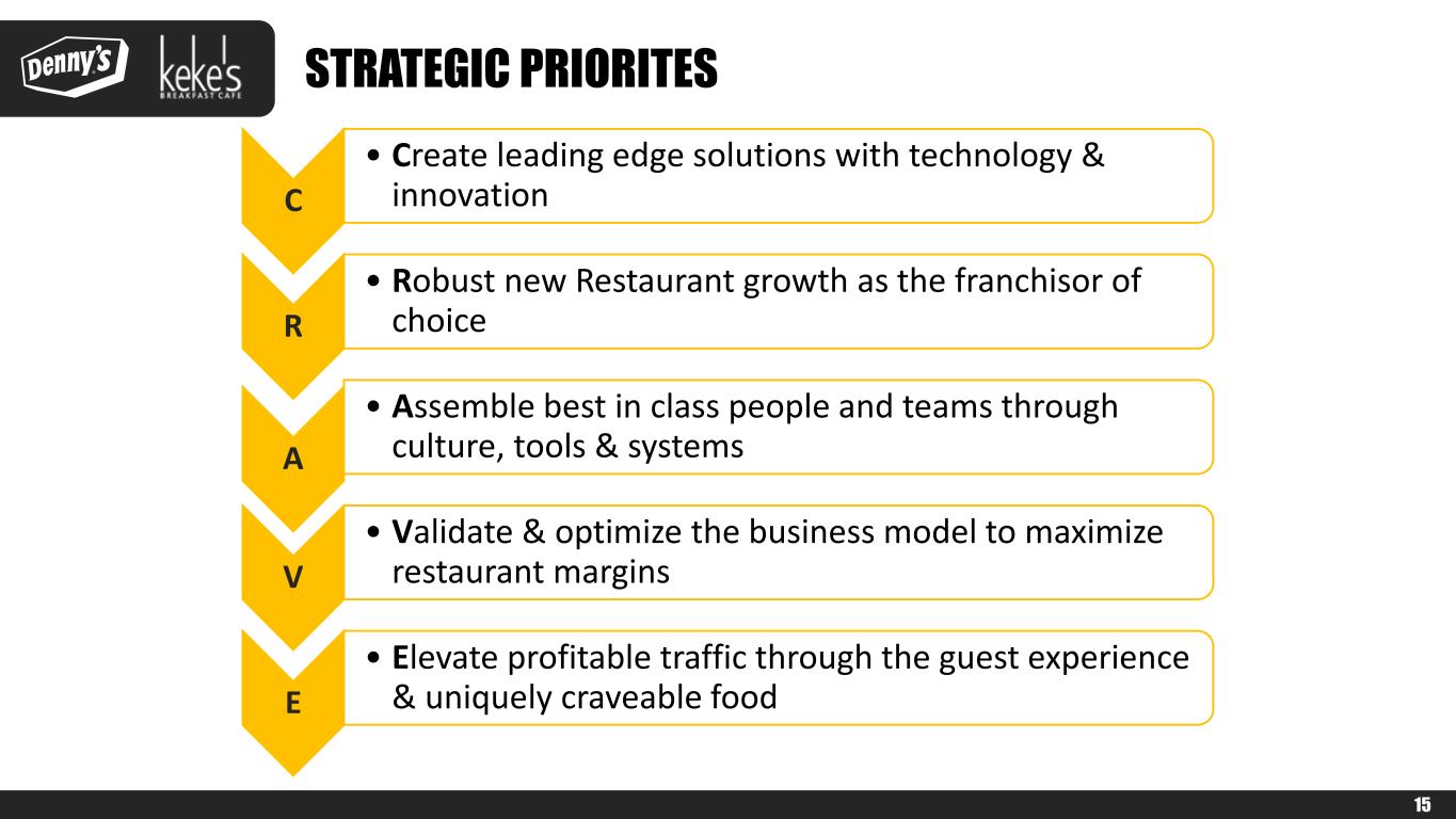 SOLID BALANCE SHEET WITH FLEXIBILITY $240.2 $198.1 $170.0 $153.0 $140.0 $195.0 $218.5 $259.0 $286.5 $240.0 $210.0 $170.0 $261.5 $247.0 $23.1 $22.5 $20.1 $20.1 $18.8 $20.7 $27.1 $30.2 $30.6 $16.5 $15.4 $12.7 $11.2 $10.8 3.5x 2.7x 2.4x 2.2x 1.9x 2.5x 2.5x 2.8x 3.0x 2.7x 2.1x 3.4x 3.1x 0.0x 0.5x 1.0x 1.5x 2.0x 2.5x 3.0x 3.5x 4.0x 2010 2011 2012 2013 2014 2015 2016 2017 2018 2019 2020 2021 2022 Q2 2023 $0.0 $100.0 $200.0 $300.0 $400.0 $500.0 $600.0 To ta l D eb t ($ M ill io ns ) Finance Leases Credit Facility Total Debt / Adjusted EBITDA* 2 Disciplined Focus on Debt Leverage with Financial Flexibility to Make Brand Investments & Return Capital to Shareholders Target Total Debt / Adjusted EBITDA* Leverage Ratio Range of 2.5x to 3.5x 1 Total Debt / Adjusted EBITDA* leverage ratio was waived starting in Q2 ’20 through Q1 ‘21. 2 Increased borrowings under the credit facility in 2022 are primarily due to the Keke’s acquisition. * See Appendix for reconciliation of Net Income (Loss) and Net Cash Provided by Operating Activities to Non-GAAP Financial Measures, as well as the reconciliation of Operating Income (Loss) to Non-GAAP Financial Measures 14 Debt amendments provided temporary covenant relief 1