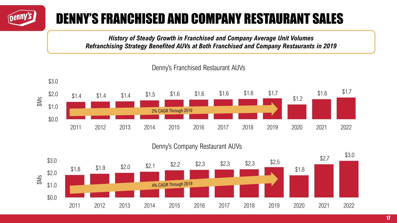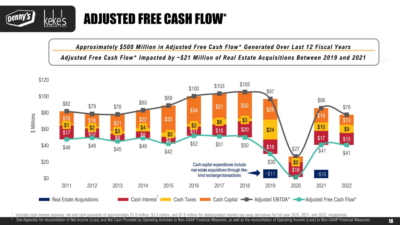 17 $1.8 $1.9 $2.0 $2.1 $2.2 $2.3 $2.3 $2.3 $2.5 $1.8 $2.7 $3.0 $0.0 $1.0 $2.0 $3.0 2011 2012 2013 2014 2015 2016 2017 2018 2019 2020 2021 2022 $M s Denny’s Company Restaurant AUVs $1.4 $1.4 $1.4 $1.5 $1.6 $1.6 $1.6 $1.6 $1.7 $1.2 $1.6 $1.7 $0.0 $1.0 $2.0 $3.0 2011 2012 2013 2014 2015 2016 2017 2018 2019 2020 2021 2022 $M s Denny’s Franchised Restaurant AUVs History of Steady Growth in Franchised and Company Average Unit Volumes Refranchising Strategy Benefited AUVs at Both Franchised and Company Restaurants in 2019 DENNY’S FRANCHISED AND COMPANY RESTAURANT SALES