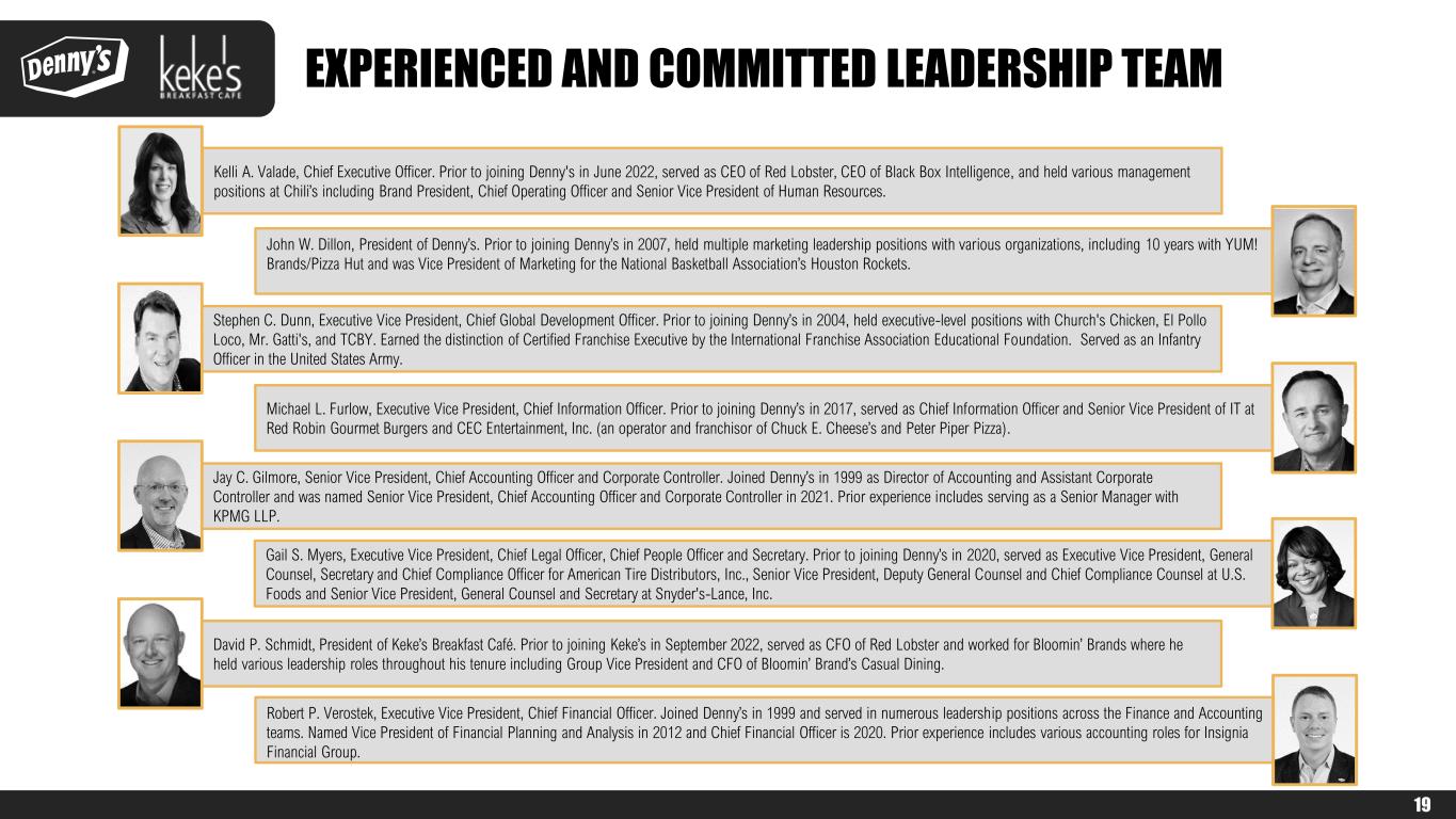 19 Michael L. Furlow, Executive Vice President, Chief Information Officer. Prior to joining Denny’s in 2017, served as Chief Information Officer and Senior Vice President of IT at Red Robin Gourmet Burgers and CEC Entertainment, Inc. (an operator and franchisor of Chuck E. Cheese’s and Peter Piper Pizza). Jay C. Gilmore, Senior Vice President, Chief Accounting Officer and Corporate Controller. Joined Denny’s in 1999 as Director of Accounting and Assistant Corporate Controller and was named Senior Vice President, Chief Accounting Officer and Corporate Controller in 2021. Prior experience includes serving as a Senior Manager with KPMG LLP. John W. Dillon, President of Denny’s. Prior to joining Denny’s in 2007, held multiple marketing leadership positions with various organizations, including 10 years with YUM! Brands/Pizza Hut and was Vice President of Marketing for the National Basketball Association’s Houston Rockets. Robert P. Verostek, Executive Vice President, Chief Financial Officer. Joined Denny’s in 1999 and served in numerous leadership positions across the Finance and Accounting teams. Named Vice President of Financial Planning and Analysis in 2012 and Chief Financial Officer is 2020. Prior experience includes various accounting roles for Insignia Financial Group. Kelli A. Valade, Chief Executive Officer. Prior to joining Denny's in June 2022, served as CEO of Red Lobster, CEO of Black Box Intelligence, and held various management positions at Chili’s including Brand President, Chief Operating Officer and Senior Vice President of Human Resources. Gail S. Myers, Executive Vice President, Chief Legal Officer, Chief People Officer and Secretary. Prior to joining Denny’s in 2020, served as Executive Vice President, General Counsel, Secretary and Chief Compliance Officer for American Tire Distributors, Inc., Senior Vice President, Deputy General Counsel and Chief Compliance Counsel at U.S. Foods and Senior Vice President, General Counsel and Secretary at Snyder's-Lance, Inc. David P. Schmidt, President of Keke’s Breakfast Café. Prior to joining Keke’s in September 2022, served as CFO of Red Lobster and worked for Bloomin’ Brands where he held various leadership roles throughout his tenure including Group Vice President and CFO of Bloomin’ Brand’s Casual Dining. Stephen C. Dunn, Executive Vice President, Chief Global Development Officer. Prior to joining Denny’s in 2004, held executive-level positions with Church's Chicken, El Pollo Loco, Mr. Gatti's, and TCBY. Earned the distinction of Certified Franchise Executive by the International Franchise Association Educational Foundation. Served as an Infantry Officer in the United States Army. EXPERIENCED AND COMMITTED LEADERSHIP TEAM