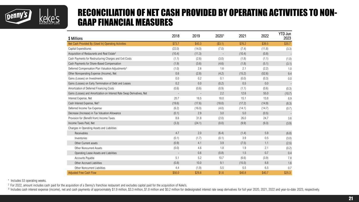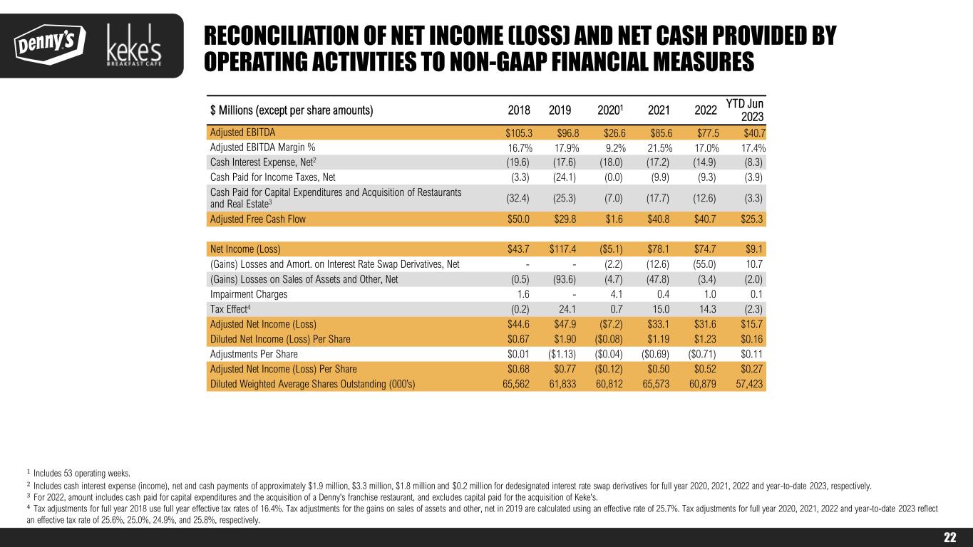 21 $ Millions 2018 2019 20201 2021 2022 YTD Jun 2023 Net Cash Provided By (Used In) Operating Activities $73.7 $43.3 ($3.1) $76.2 $39.5 $35.7 Capital Expenditures (22.0) (14.0) (7.0) (7.4) (11.8) (3.3) Acquisition of Restaurants and Real Estate2 (10.4) (11.3) - (10.4) (0.8) - Cash Payments for Restructuring Charges and Exit Costs (1.1) (2.6) (3.0) (1.8) (1.1) (1.0) Cash Payments for Share‐Based Compensation (1.9) (3.6) (4.6) (1.8) (5.1) (3.1) Deferred Compensation Plan Valuation Adjustments3 (1.0) 2.6 1.6 2.1 (2.2) 1.0 Other Nonoperating Expense (Income), Net 0.6 (2.8) (4.2) (15.2) (52.6) 9.4 Gains (Losses) on Investments 0.0 0.2 0.1 (0.0) (0.3) 0.0 Gains (Losses) on Early Termination of Debt and Leases 0.2 0.0 (0.2) 0.5 0.0 - Amortization of Deferred Financing Costs (0.6) (0.6) (0.9) (1.1) (0.6) (0.3) Gains (Losses) and Amortization on Interest Rate Swap Derivatives, Net - - 2.2 12.6 55.0 (10.7) Interest Expense, Net 20.7 18.5 18.0 15.1 13.8 8.9 Cash Interest Expense, Net3 (19.6) (17.6) (18.0) (17.2) (14.9) (8.3) Deferred Income Tax Expense (6.2) (16.0) (4.0) (14.1) (14.7) (0.7) Decrease (Increase) in Tax Valuation Allowance (0.1) 2.9 3.0 5.0 (0.5) - Provision for (Benefit from) Income Taxes 8.6 31.8 (2.0) 26.0 24.7 3.6 Income Taxes Paid, Net (3.3) (24.1) (0.0) (9.9) (9.3) (3.9) Changes in Operating Assets and Liabilities Receivables 4.7 2.0 (6.4) (1.4) 5.9 (6.8) Inventories (0.1) (1.7) (0.1) 3.9 0.5 (3.0) Other Current assets (0.9) 4.1 3.9 (7.5) 1.1 (2.5) Other Noncurrent Assets (0.0) 4.6 1.8 1.9 2.1 (0.2) Operating Lease Assets and Liabilities - 0.6 (0.8) 1.5 0.7 0.4 Accounts Payable 5.1 5.2 10.7 (6.6) (3.9) 7.8 Other Accrued Liabilities (0.8) 10.0 9.1 (15.5) 8.8 1.6 Other Noncurrent Liabilities 4.4 (1.9) 5.5 5.5 6.5 0.7 Adjusted Free Cash Flow $50.0 $29.8 $1.6 $40.8 $40.7 $25.3 ¹ Includes 53 operating weeks. 2 For 2022, amount includes cash paid for the acquisition of a Denny's franchise restaurant and excludes capital paid for the acquisition of Keke’s. 3 Includes cash interest expense (income), net and cash payments of approximately $1.9 million, $3.3 million, $1.8 million and $0.2 million for dedesignated interest rate swap derivatives for full year 2020, 2021, 2022 and year-to-date 2023, respectively. RECONCILIATION OF NET CASH PROVIDED BY OPERATING ACTIVITIES TO NON- GAAP FINANCIAL MEASURES