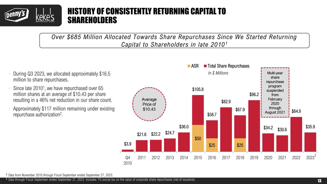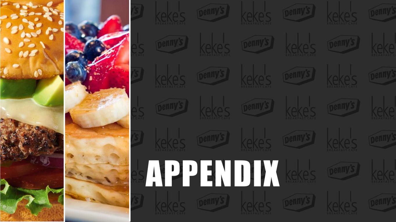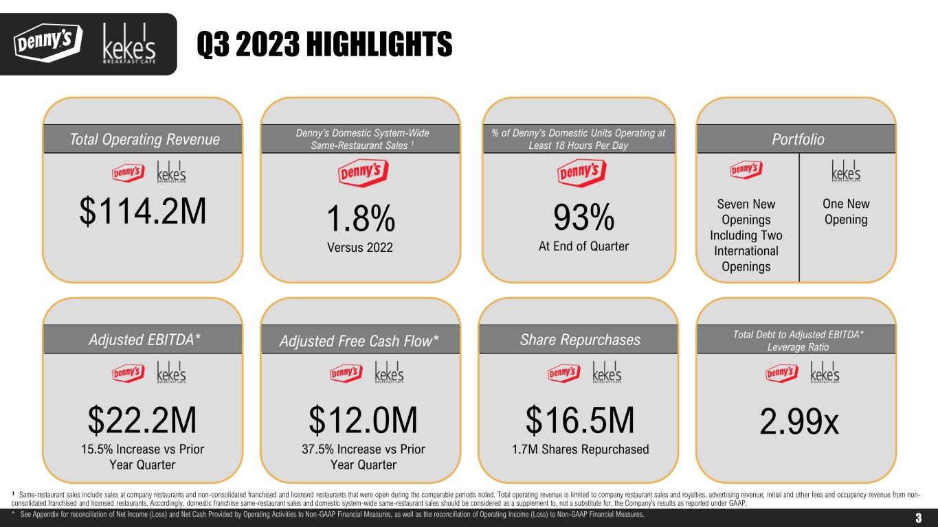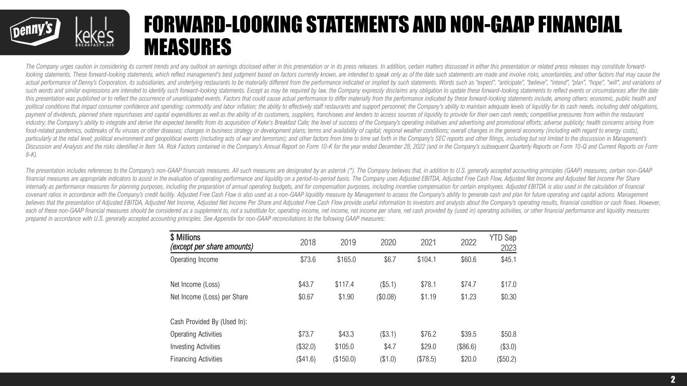 FORWARD-LOOKING STATEMENTS AND NON-GAAP FINANCIAL MEASURES The Company urges caution in considering its current trends and any outlook on earnings disclosed either in this presentation or in its press releases. In addition, certain matters discussed in either this presentation or related press releases may constitute forward- looking statements. These forward-looking statements, which reflect management's best judgment based on factors currently known, are intended to speak only as of the date such statements are made and involve risks, uncertainties, and other factors that may cause the actual performance of Denny’s Corporation, its subsidiaries, and underlying restaurants to be materially different from the performance indicated or implied by such statements. Words such as “expect”, “anticipate”, “believe”, “intend”, “plan”, “hope”, "will", and variations of such words and similar expressions are intended to identify such forward-looking statements. Except as may be required by law, the Company expressly disclaims any obligation to update these forward-looking statements to reflect events or circumstances after the date this presentation was published or to reflect the occurrence of unanticipated events. Factors that could cause actual performance to differ materially from the performance indicated by these forward-looking statements include, among others: economic, public health and political conditions that impact consumer confidence and spending; commodity and labor inflation; the ability to effectively staff restaurants and support personnel; the Company's ability to maintain adequate levels of liquidity for its cash needs, including debt obligations, payment of dividends, planned share repurchases and capital expenditures as well as the ability of its customers, suppliers, franchisees and lenders to access sources of liquidity to provide for their own cash needs; competitive pressures from within the restaurant industry; the Company's ability to integrate and derive the expected benefits from its acquisition of Keke's Breakfast Cafe; the level of success of the Company’s operating initiatives and advertising and promotional efforts; adverse publicity; health concerns arising from food-related pandemics, outbreaks of flu viruses or other diseases; changes in business strategy or development plans; terms and availability of capital; regional weather conditions; overall changes in the general economy (including with regard to energy costs), particularly at the retail level; political environment and geopolitical events (including acts of war and terrorism); and other factors from time to time set forth in the Company’s SEC reports and other filings, including but not limited to the discussion in Management’s Discussion and Analysis and the risks identified in Item 1A. Risk Factors contained in the Company’s Annual Report on Form 10-K for the year ended December 28, 2022 (and in the Company’s subsequent Quarterly Reports on Form 10-Q and Current Reports on Form 8-K). The presentation includes references to the Company’s non-GAAP financials measures. All such measures are designated by an asterisk (*). The Company believes that, in addition to U.S. generally accepted accounting principles (GAAP) measures, certain non-GAAP financial measures are appropriate indicators to assist in the evaluation of operating performance and liquidity on a period-to-period basis. The Company uses Adjusted EBITDA, Adjusted Free Cash Flow, Adjusted Net Income and Adjusted Net Income Per Share internally as performance measures for planning purposes, including the preparation of annual operating budgets, and for compensation purposes, including incentive compensation for certain employees. Adjusted EBITDA is also used in the calculation of financial covenant ratios in accordance with the Company’s credit facility. Adjusted Free Cash Flow is also used as a non-GAAP liquidity measure by Management to assess the Company’s ability to generate cash and plan for future operating and capital actions. Management believes that the presentation of Adjusted EBITDA, Adjusted Net Income, Adjusted Net Income Per Share and Adjusted Free Cash Flow provide useful information to investors and analysts about the Company’s operating results, financial condition or cash flows. However, each of these non-GAAP financial measures should be considered as a supplement to, not a substitute for, operating income, net income, net income per share, net cash provided by (used in) operating activities, or other financial performance and liquidity measures prepared in accordance with U.S. generally accepted accounting principles. See Appendix for non-GAAP reconciliations to the following GAAP measures: $ Millions (except per share amounts) 2018 2019 2020 2021 2022 YTD Sep 2023 Operating Income $73.6 $165.0 $6.7 $104.1 $60.6 $45.1 Net Income (Loss) $43.7 $117.4 ($5.1) $78.1 $74.7 $17.0 Net Income (Loss) per Share $0.67 $1.90 ($0.08) $1.19 $1.23 $0.30 Cash Provided By (Used In): Operating Activities $73.7 $43.3 ($3.1) $76.2 $39.5 $50.8 Investing Activities ($32.0) $105.0 $4.7 $29.0 ($86.6) ($3.0) Financing Activities ($41.6) ($150.0) ($1.0) ($78.5) $20.0 ($50.2) 2
