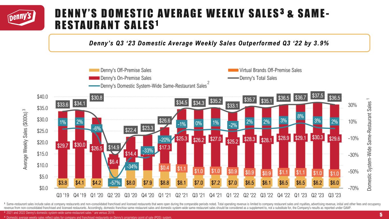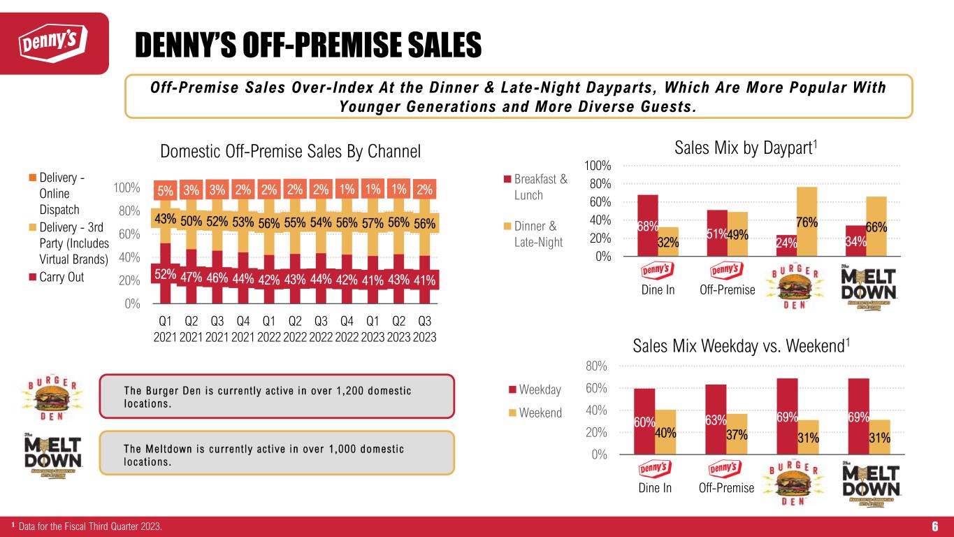 D E N N Y ’ S D O M E S T I C AV E R A G E W E E K LY S A L E S 3 & S A M E - R E S TA U R A N T S A L E S 1 $3.8 $4.1 $4.2 $8.4 $8.0 $7.9 $8.8 $8.1 $7.0 $7.2 $7.0 $6.5 $6.1 $6.5 $6.5 $6.2 $6.0 $0.4 $1.1 $1.0 $1.0 $0.9 $0.9 $0.9 $1.1 $1.1 $1.0 $1.0 $29.7 $30.0 $26.5 $6.4 $14.4 $15.4 $17.3 $25.3 $26.2 $27.0 $25.2 $28.3 $28.1 $28.9 $29.1 $30.3 $29.6 $33.6 $34.1 $30.8 $14.9 $22.4 $23.3 $26.6 $34.5 $34.3 $35.2 $33.1 $35.7 $35.1 $36.5 $36.7 $37.5 $36.5 1% 2% -6% -57% -34% -33% -20% -1% 0% 1% -2% 2% 2% 3% 8% 3% 2% -70% -50% -30% -10% 10% 30% $0.0 $5.0 $10.0 $15.0 $20.0 $25.0 $30.0 $35.0 $40.0 Q3 '19 Q4 '19 Q1 '20 Q2 '20 Q3 '20 Q4 '20 Q1 '21 Q2 '21 Q3 '21 Q4 '21 Q1 '22 Q2 '22 Q3 '22 Q4 '22 Q1 '23 Q2 '23 Q3 '23 D om es tic S ys te m -W id e S am e- R es ta ur an t S al es 1 A ve ra ge W ee kl y S al es ( $0 00 s) 3 Denny's Off-Premise Sales Virtual Brands Off-Premise Sales Denny's On-Premise Sales Denny's Total Sales Denny's Domestic System-Wide Same-Restaurant Sales 𝟏 Same-restaurant sales include sales at company restaurants and non-consolidated franchised and licensed restaurants that were open during the comparable periods noted. Total operating revenue is limited to company restaurant sales and royalties, advertising revenue, initial and other fees and occupancy revenue from non-consolidated franchised and licensed restaurants. Accordingly, domestic franchise same-restaurant sales and domestic system-wide same-restaurant sales should be considered as a supplement to, not a substitute for, the Company’s results as reported under GAAP. 𝟐 2021 and 2022 Denny’s domestic system-wide same-restaurant sales 1 are versus 2019. 𝟑 Domestic average weekly sales reflect sales for company and franchised restaurants on Denny’s proprietary point of sale (POS) system. Denny’s Q3 ‘23 Domestic Average Weekly Sales Outperformed Q3 ‘22 by 3.9% 2 5