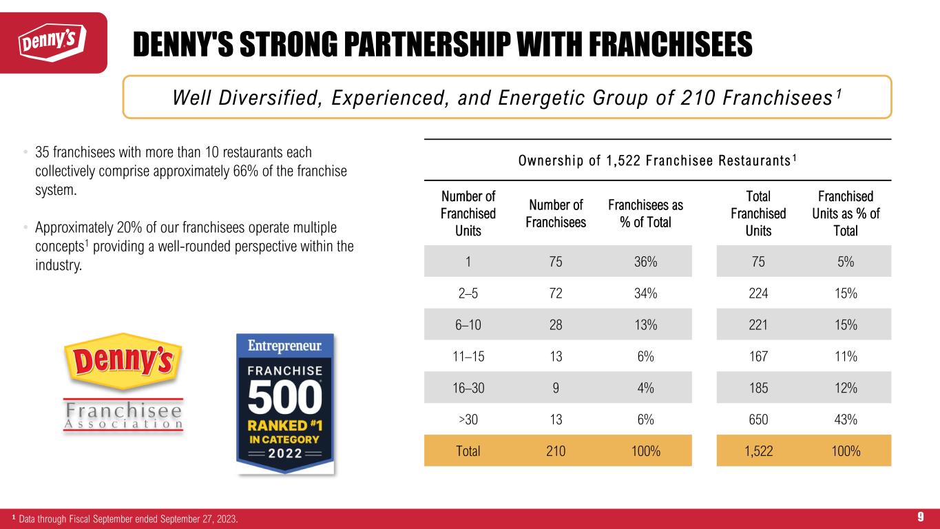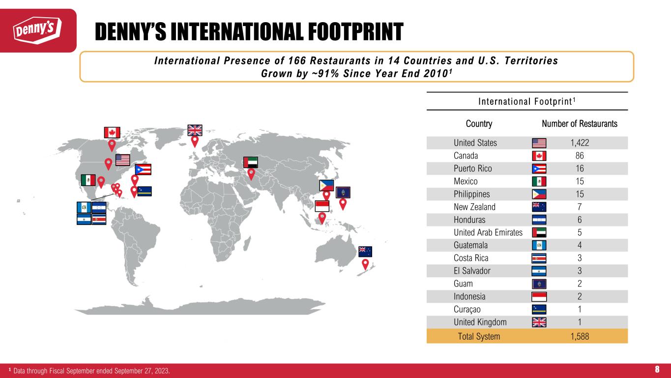 8 I n t e rna t iona l Foo tp r in t 1 Country Number of Restaurants United States 1,422 Canada 86 Puerto Rico 16 Mexico 15 Philippines 15 New Zealand 7 Honduras 6 United Arab Emirates 5 Guatemala 4 Costa Rica 3 El Salvador 3 Guam 2 Indonesia 2 Curaçao 1 United Kingdom 1 Total System 1,588 International Presence of 166 Restaurants in 14 Countries and U.S. Territories Grown by ~91% Since Year End 2010 1 𝟏 Data through Fiscal September ended September 27, 2023. DENNY’S INTERNATIONAL FOOTPRINT
