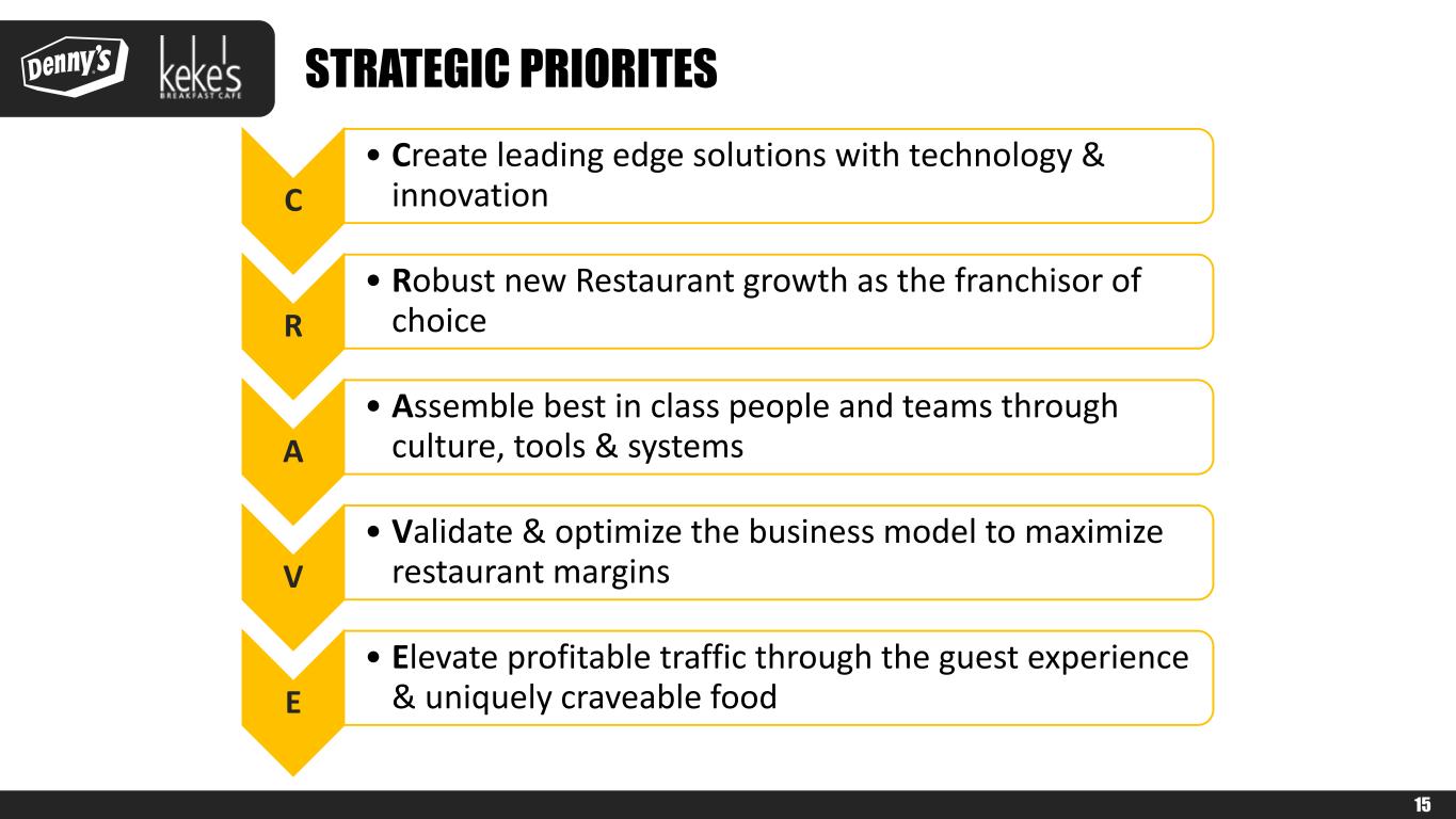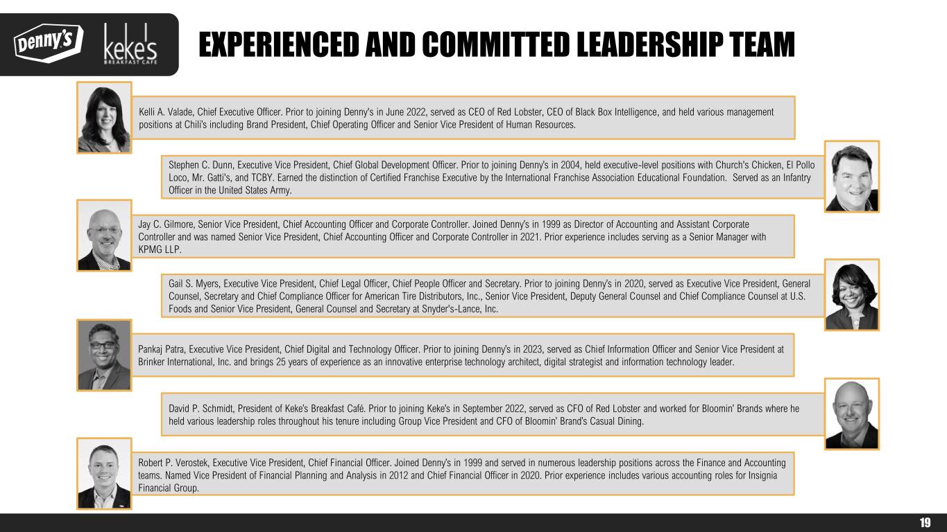 19 Robert P. Verostek, Executive Vice President, Chief Financial Officer. Joined Denny’s in 1999 and served in numerous leadership positions across the Finance and Accounting teams. Named Vice President of Financial Planning and Analysis in 2012 and Chief Financial Officer in 2020. Prior experience includes various accounting roles for Insignia Financial Group. Kelli A. Valade, Chief Executive Officer. Prior to joining Denny's in June 2022, served as CEO of Red Lobster, CEO of Black Box Intelligence, and held various management positions at Chili’s including Brand President, Chief Operating Officer and Senior Vice President of Human Resources. Jay C. Gilmore, Senior Vice President, Chief Accounting Officer and Corporate Controller. Joined Denny’s in 1999 as Director of Accounting and Assistant Corporate Controller and was named Senior Vice President, Chief Accounting Officer and Corporate Controller in 2021. Prior experience includes serving as a Senior Manager with KPMG LLP. Gail S. Myers, Executive Vice President, Chief Legal Officer, Chief People Officer and Secretary. Prior to joining Denny’s in 2020, served as Executive Vice President, General Counsel, Secretary and Chief Compliance Officer for American Tire Distributors, Inc., Senior Vice President, Deputy General Counsel and Chief Compliance Counsel at U.S. Foods and Senior Vice President, General Counsel and Secretary at Snyder's-Lance, Inc. David P. Schmidt, President of Keke’s Breakfast Café. Prior to joining Keke’s in September 2022, served as CFO of Red Lobster and worked for Bloomin’ Brands where he held various leadership roles throughout his tenure including Group Vice President and CFO of Bloomin’ Brand’s Casual Dining. Stephen C. Dunn, Executive Vice President, Chief Global Development Officer. Prior to joining Denny’s in 2004, held executive-level positions with Church's Chicken, El Pollo Loco, Mr. Gatti's, and TCBY. Earned the distinction of Certified Franchise Executive by the International Franchise Association Educational Foundation. Served as an Infantry Officer in the United States Army. EXPERIENCED AND COMMITTED LEADERSHIP TEAM Pankaj Patra, Executive Vice President, Chief Digital and Technology Officer. Prior to joining Denny’s in 2023, served as Chief Information Officer and Senior Vice President at Brinker International, Inc. and brings 25 years of experience as an innovative enterprise technology architect, digital strategist and information technology leader.
