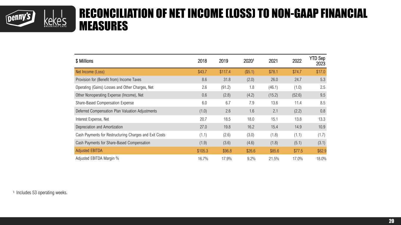 22 $ Millions (except per share amounts) 2018 2019 20201 2021 2022 YTD Sep 2023 Adjusted EBITDA $105.3 $96.8 $26.6 $85.6 $77.5 $62.9 Adjusted EBITDA Margin % 16.7% 17.9% 9.2% 21.5% 17.0% 18.0% Cash Interest Expense, Net2 (19.6) (17.6) (18.0) (17.2) (14.9) (12.4) Cash Paid for Income Taxes, Net (3.3) (24.1) (0.0) (9.9) (9.3) (6.5) Cash Paid for Capital Expenditures and Acquisition of Restaurants and Real Estate3 (32.4) (25.3) (7.0) (17.7) (12.6) (6.7) Adjusted Free Cash Flow $50.0 $29.8 $1.6 $40.8 $40.7 $37.3 Net Income (Loss) $43.7 $117.4 ($5.1) $78.1 $74.7 $17.0 (Gains) Losses and Amort. on Interest Rate Swap Derivatives, Net - - (2.2) (12.6) (55.0) 10.8 (Gains) Losses on Sales of Assets and Other, Net (0.5) (93.6) (4.7) (47.8) (3.4) (2.1) Impairment Charges 1.6 - 4.1 0.4 1.0 1.8 Tax Effect4 (0.2) 24.1 0.7 15.0 14.3 (2.5) Adjusted Net Income (Loss) $44.6 $47.9 ($7.2) $33.1 $31.6 $25.1 Diluted Net Income (Loss) Per Share $0.67 $1.90 ($0.08) $1.19 $1.23 $0.30 Adjustments Per Share $0.01 ($1.13) ($0.04) ($0.69) ($0.71) $0.14 Adjusted Net Income (Loss) Per Share $0.68 $0.77 ($0.12) $0.50 $0.52 $0.44 Diluted Weighted Average Shares Outstanding (000’s) 65,562 61,833 60,812 65,573 60,879 56,973 1 Includes 53 operating weeks. 2 Includes cash interest expense (income), net and cash (receipts) payments of approximately $1.9 million, $3.3 million, $1.8 million and ($0.2) million for dedesignated interest rate swap derivatives for full year 2020, 2021, 2022 and year-to-date 2023, respectively. 3 For 2022, amount includes cash paid for capital expenditures and the acquisition of a Denny's franchise restaurant, and excludes capital paid for the acquisition of Keke's. For the year-to-date period ended September 27, 2023, amounts include cash paid for capital expenditures and the acquisition of a piece of real estate. 4 Tax adjustments for full year 2018 use full year effective tax rates of 16.4%. Tax adjustments for the gains on sales of assets and other, net in 2019 are calculated using an effective rate of 25.7%. Tax adjustments for full year 2020, 2021, 2022 and year-to-date 2023 reflect an effective tax rate of 25.6%, 25.0%, 24.9%, and 23.3%, respectively. RECONCILIATION OF NET INCOME (LOSS) AND NET CASH PROVIDED BY OPERATING ACTIVITIES TO NON-GAAP FINANCIAL MEASURES