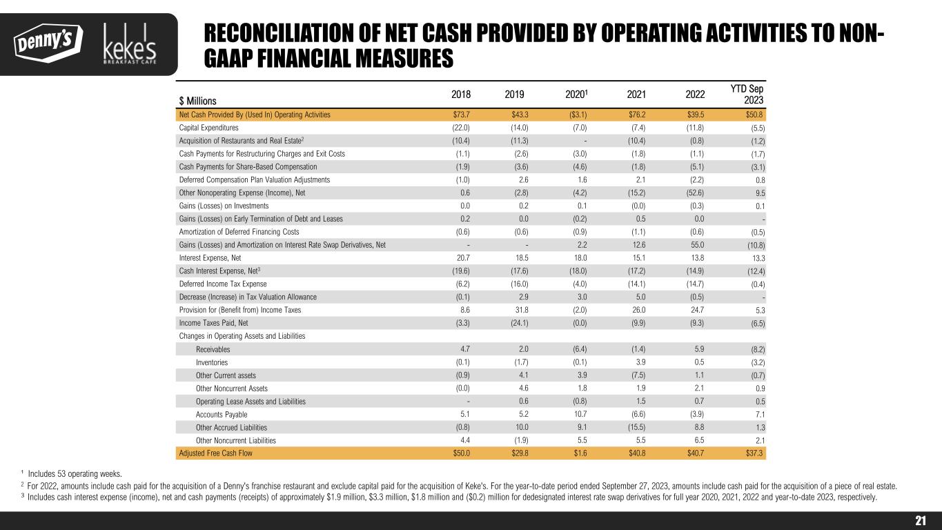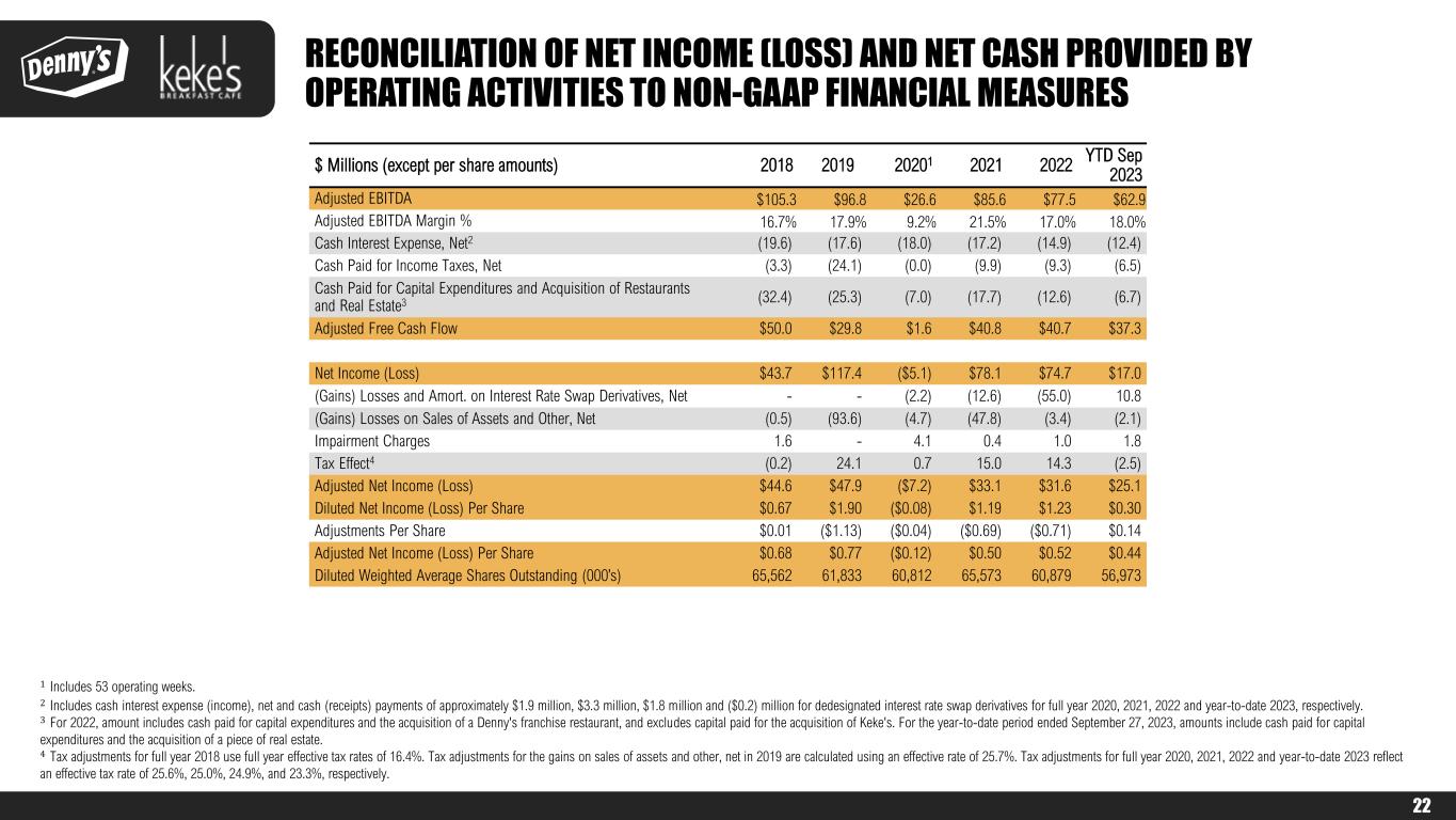 21 $ Millions 2018 2019 20201 2021 2022 YTD Sep 2023 Net Cash Provided By (Used In) Operating Activities $73.7 $43.3 ($3.1) $76.2 $39.5 $50.8 Capital Expenditures (22.0) (14.0) (7.0) (7.4) (11.8) (5.5) Acquisition of Restaurants and Real Estate2 (10.4) (11.3) - (10.4) (0.8) (1.2) Cash Payments for Restructuring Charges and Exit Costs (1.1) (2.6) (3.0) (1.8) (1.1) (1.7) Cash Payments for Share‐Based Compensation (1.9) (3.6) (4.6) (1.8) (5.1) (3.1) Deferred Compensation Plan Valuation Adjustments (1.0) 2.6 1.6 2.1 (2.2) 0.8 Other Nonoperating Expense (Income), Net 0.6 (2.8) (4.2) (15.2) (52.6) 9.5 Gains (Losses) on Investments 0.0 0.2 0.1 (0.0) (0.3) 0.1 Gains (Losses) on Early Termination of Debt and Leases 0.2 0.0 (0.2) 0.5 0.0 - Amortization of Deferred Financing Costs (0.6) (0.6) (0.9) (1.1) (0.6) (0.5) Gains (Losses) and Amortization on Interest Rate Swap Derivatives, Net - - 2.2 12.6 55.0 (10.8) Interest Expense, Net 20.7 18.5 18.0 15.1 13.8 13.3 Cash Interest Expense, Net3 (19.6) (17.6) (18.0) (17.2) (14.9) (12.4) Deferred Income Tax Expense (6.2) (16.0) (4.0) (14.1) (14.7) (0.4) Decrease (Increase) in Tax Valuation Allowance (0.1) 2.9 3.0 5.0 (0.5) - Provision for (Benefit from) Income Taxes 8.6 31.8 (2.0) 26.0 24.7 5.3 Income Taxes Paid, Net (3.3) (24.1) (0.0) (9.9) (9.3) (6.5) Changes in Operating Assets and Liabilities Receivables 4.7 2.0 (6.4) (1.4) 5.9 (8.2) Inventories (0.1) (1.7) (0.1) 3.9 0.5 (3.2) Other Current assets (0.9) 4.1 3.9 (7.5) 1.1 (0.7) Other Noncurrent Assets (0.0) 4.6 1.8 1.9 2.1 0.9 Operating Lease Assets and Liabilities - 0.6 (0.8) 1.5 0.7 0.5 Accounts Payable 5.1 5.2 10.7 (6.6) (3.9) 7.1 Other Accrued Liabilities (0.8) 10.0 9.1 (15.5) 8.8 1.3 Other Noncurrent Liabilities 4.4 (1.9) 5.5 5.5 6.5 2.1 Adjusted Free Cash Flow $50.0 $29.8 $1.6 $40.8 $40.7 $37.3 ¹ Includes 53 operating weeks. 2 For 2022, amounts include cash paid for the acquisition of a Denny's franchise restaurant and exclude capital paid for the acquisition of Keke's. For the year-to-date period ended September 27, 2023, amounts include cash paid for the acquisition of a piece of real estate. 3 Includes cash interest expense (income), net and cash payments (receipts) of approximately $1.9 million, $3.3 million, $1.8 million and ($0.2) million for dedesignated interest rate swap derivatives for full year 2020, 2021, 2022 and year-to-date 2023, respectively. RECONCILIATION OF NET CASH PROVIDED BY OPERATING ACTIVITIES TO NON- GAAP FINANCIAL MEASURES