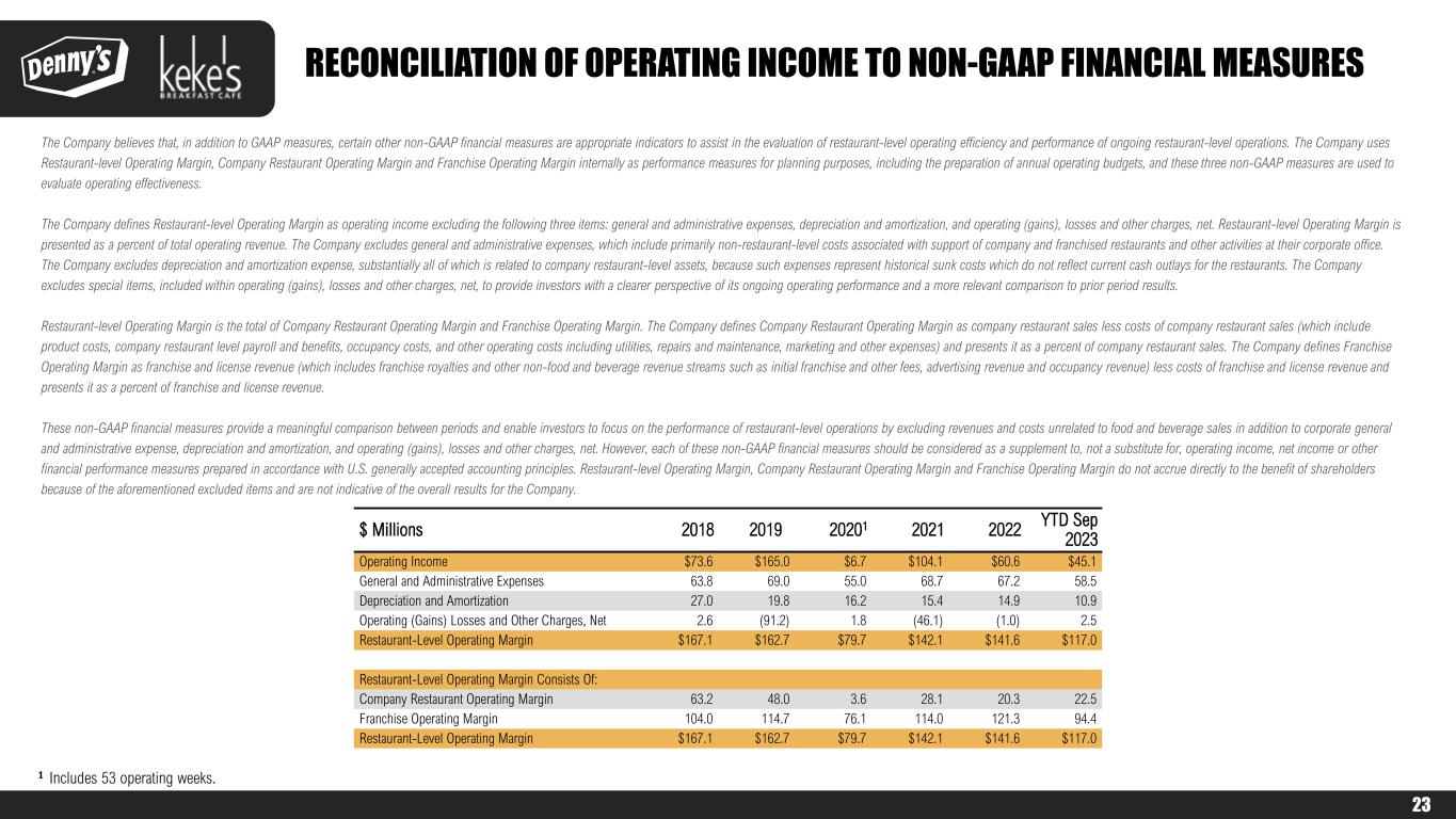 23 $ Millions 2018 2019 20201 2021 2022 YTD Sep 2023 Operating Income $73.6 $165.0 $6.7 $104.1 $60.6 $45.1 General and Administrative Expenses 63.8 69.0 55.0 68.7 67.2 58.5 Depreciation and Amortization 27.0 19.8 16.2 15.4 14.9 10.9 Operating (Gains) Losses and Other Charges, Net 2.6 (91.2) 1.8 (46.1) (1.0) 2.5 Restaurant-Level Operating Margin $167.1 $162.7 $79.7 $142.1 $141.6 $117.0 Restaurant-Level Operating Margin Consists Of: Company Restaurant Operating Margin 63.2 48.0 3.6 28.1 20.3 22.5 Franchise Operating Margin 104.0 114.7 76.1 114.0 121.3 94.4 Restaurant-Level Operating Margin $167.1 $162.7 $79.7 $142.1 $141.6 $117.0 𝟏 Includes 53 operating weeks. The Company believes that, in addition to GAAP measures, certain other non-GAAP financial measures are appropriate indicators to assist in the evaluation of restaurant-level operating efficiency and performance of ongoing restaurant-level operations. The Company uses Restaurant-level Operating Margin, Company Restaurant Operating Margin and Franchise Operating Margin internally as performance measures for planning purposes, including the preparation of annual operating budgets, and these three non-GAAP measures are used to evaluate operating effectiveness. The Company defines Restaurant-level Operating Margin as operating income excluding the following three items: general and administrative expenses, depreciation and amortization, and operating (gains), losses and other charges, net. Restaurant-level Operating Margin is presented as a percent of total operating revenue. The Company excludes general and administrative expenses, which include primarily non-restaurant-level costs associated with support of company and franchised restaurants and other activities at their corporate office. The Company excludes depreciation and amortization expense, substantially all of which is related to company restaurant-level assets, because such expenses represent historical sunk costs which do not reflect current cash outlays for the restaurants. The Company excludes special items, included within operating (gains), losses and other charges, net, to provide investors with a clearer perspective of its ongoing operating performance and a more relevant comparison to prior period results. Restaurant-level Operating Margin is the total of Company Restaurant Operating Margin and Franchise Operating Margin. The Company defines Company Restaurant Operating Margin as company restaurant sales less costs of company restaurant sales (which include product costs, company restaurant level payroll and benefits, occupancy costs, and other operating costs including utilities, repairs and maintenance, marketing and other expenses) and presents it as a percent of company restaurant sales. The Company defines Franchise Operating Margin as franchise and license revenue (which includes franchise royalties and other non-food and beverage revenue streams such as initial franchise and other fees, advertising revenue and occupancy revenue) less costs of franchise and license revenue and presents it as a percent of franchise and license revenue. These non-GAAP financial measures provide a meaningful comparison between periods and enable investors to focus on the performance of restaurant-level operations by excluding revenues and costs unrelated to food and beverage sales in addition to corporate general and administrative expense, depreciation and amortization, and operating (gains), losses and other charges, net. However, each of these non-GAAP financial measures should be considered as a supplement to, not a substitute for, operating income, net income or other financial performance measures prepared in accordance with U.S. generally accepted accounting principles. Restaurant-level Operating Margin, Company Restaurant Operating Margin and Franchise Operating Margin do not accrue directly to the benefit of shareholders because of the aforementioned excluded items and are not indicative of the overall results for the Company. RECONCILIATION OF OPERATING INCOME TO NON-GAAP FINANCIAL MEASURES