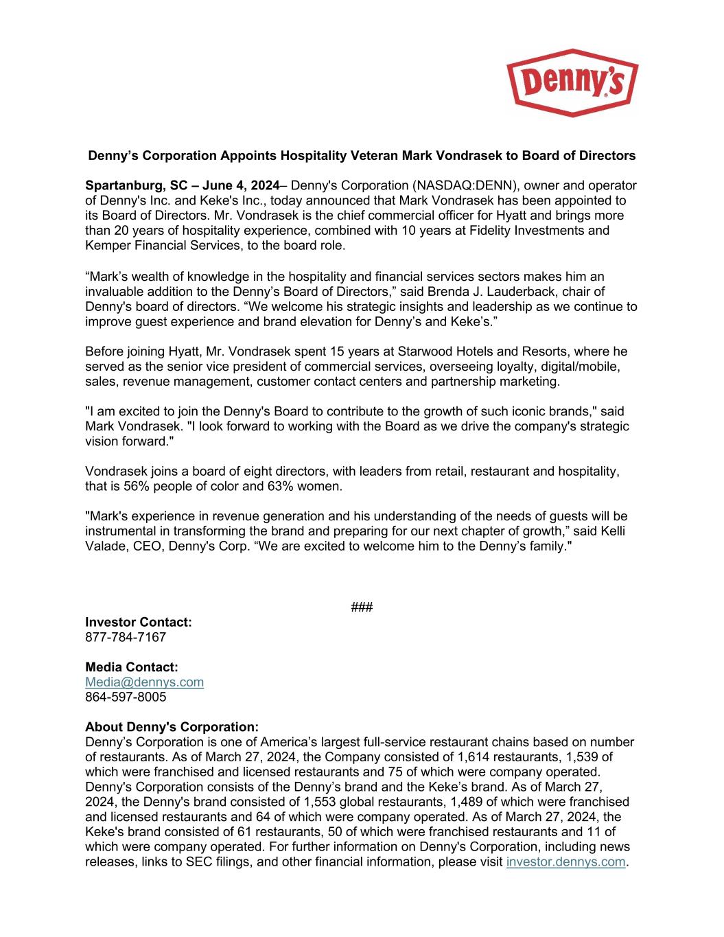Denny’s Corporation Appoints Hospitality Veteran Mark Vondrasek to Board of Directors Spartanburg, SC – June 4, 2024– Denny's Corporation (NASDAQ:DENN), owner and operator of Denny's Inc. and Keke's Inc., today announced that Mark Vondrasek has been appointed to its Board of Directors. Mr. Vondrasek is the chief commercial officer for Hyatt and brings more than 20 years of hospitality experience, combined with 10 years at Fidelity Investments and Kemper Financial Services, to the board role. “Mark’s wealth of knowledge in the hospitality and financial services sectors makes him an invaluable addition to the Denny’s Board of Directors,” said Brenda J. Lauderback, chair of Denny's board of directors. “We welcome his strategic insights and leadership as we continue to improve guest experience and brand elevation for Denny’s and Keke’s.” Before joining Hyatt, Mr. Vondrasek spent 15 years at Starwood Hotels and Resorts, where he served as the senior vice president of commercial services, overseeing loyalty, digital/mobile, sales, revenue management, customer contact centers and partnership marketing. "I am excited to join the Denny's Board to contribute to the growth of such iconic brands," said Mark Vondrasek. "I look forward to working with the Board as we drive the company's strategic vision forward." Vondrasek joins a board of eight directors, with leaders from retail, restaurant and hospitality, that is 56% people of color and 63% women. "Mark's experience in revenue generation and his understanding of the needs of guests will be instrumental in transforming the brand and preparing for our next chapter of growth,” said Kelli Valade, CEO, Denny's Corp. “We are excited to welcome him to the Denny’s family." ### Investor Contact: 877-784-7167 Media Contact: Media@dennys.com 864-597-8005 About Denny's Corporation: Denny’s Corporation is one of America’s largest full-service restaurant chains based on number of restaurants. As of March 27, 2024, the Company consisted of 1,614 restaurants, 1,539 of which were franchised and licensed restaurants and 75 of which were company operated. Denny's Corporation consists of the Denny’s brand and the Keke’s brand. As of March 27, 2024, the Denny's brand consisted of 1,553 global restaurants, 1,489 of which were franchised and licensed restaurants and 64 of which were company operated. As of March 27, 2024, the Keke's brand consisted of 61 restaurants, 50 of which were franchised restaurants and 11 of which were company operated. For further information on Denny's Corporation, including news releases, links to SEC filings, and other financial information, please visit investor.dennys.com.