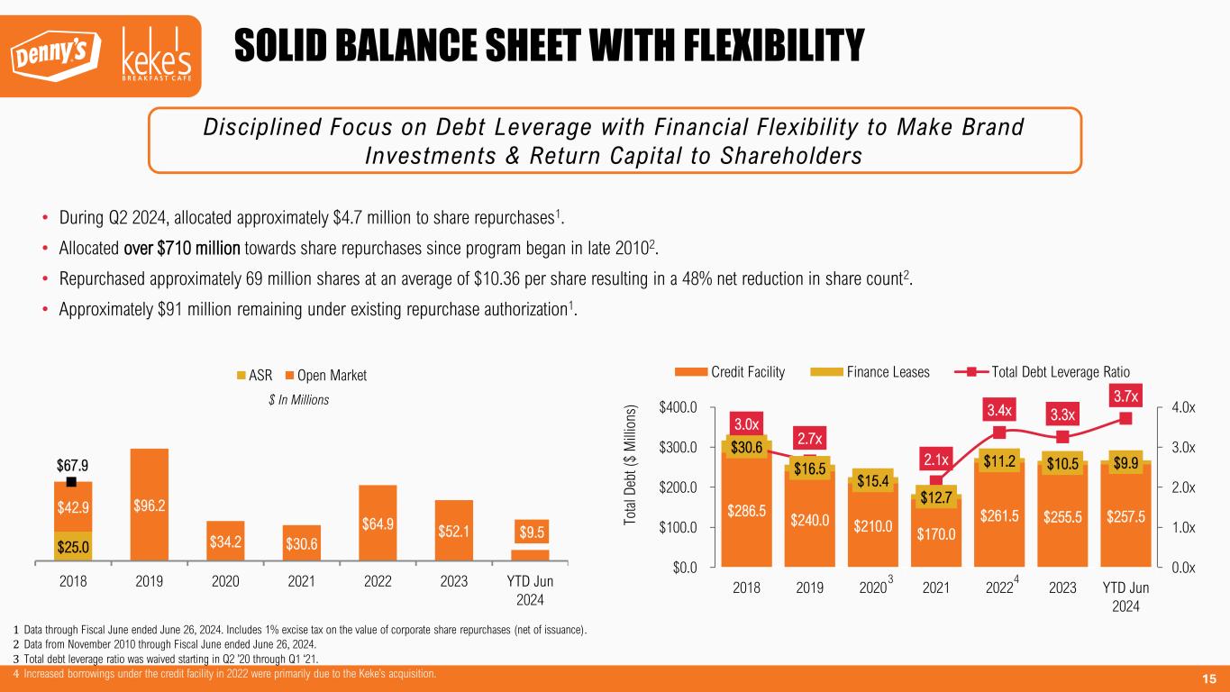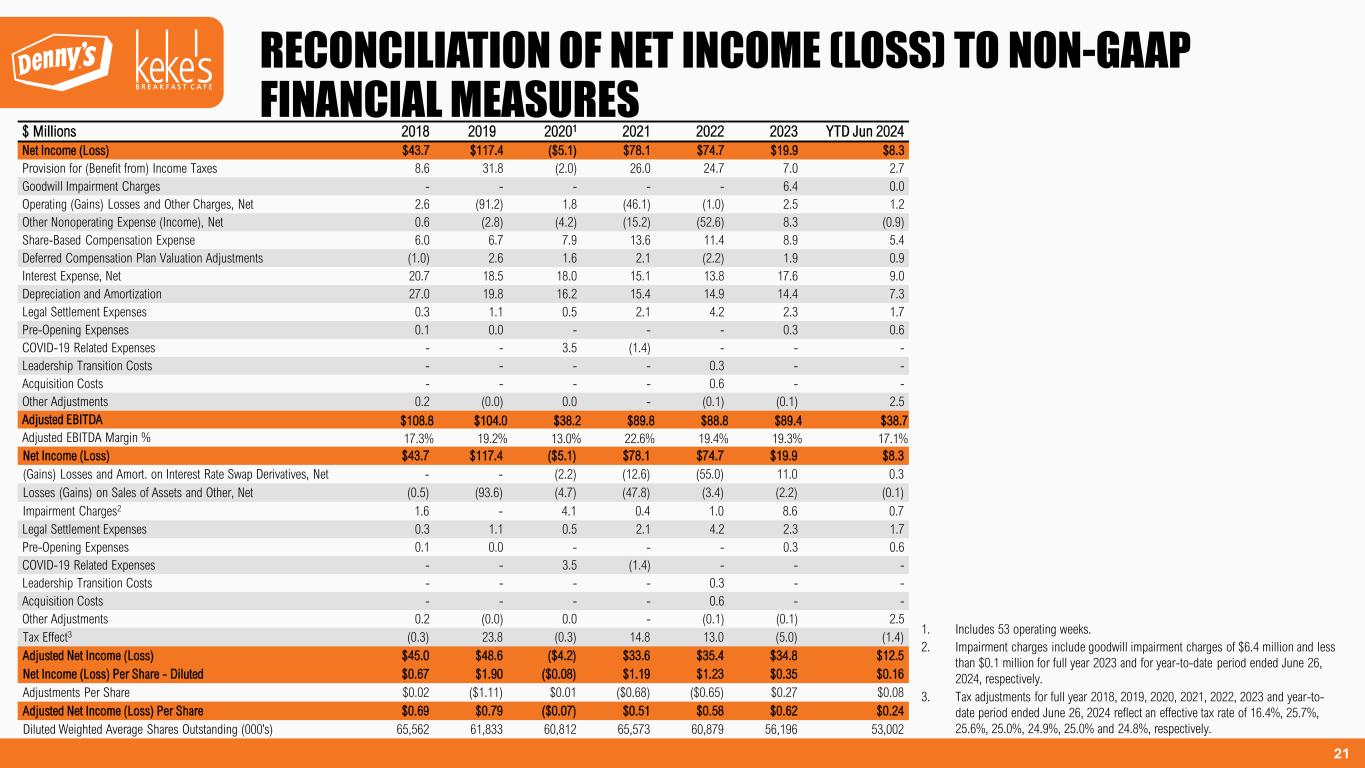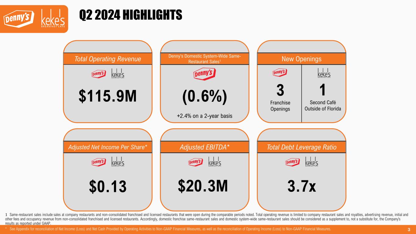 2 The Company urges caution in considering its current trends and any outlook on earnings disclosed either in this presentation or in its press releases. In addition, certain matters discussed in either this presentation or related press releases may constitute forward- looking statements. These forward-looking statements, which reflect management's best judgment based on factors currently known, are intended to speak only as of the date such statements are made and involve risks, uncertainties, and other factors that may cause the actual performance of Denny’s Corporation, its subsidiaries, and underlying restaurants to be materially different from the performance indicated or implied by such statements. Words such as “expect”, “anticipate”, “believe”, “intend”, “plan”, “hope”, "will", and variations of such words and similar expressions are intended to identify such forward-looking statements. Except as may be required by law, the Company expressly disclaims any obligation to update these forward-looking statements to reflect events or circumstances after the date this presentation was published or to reflect the occurrence of unanticipated events. Factors that could cause actual performance to differ materially from the performance indicated by these forward-looking statements include, among others: economic, public health and political conditions that impact consumer confidence and spending; commodity and labor inflation; the ability to effectively staff restaurants and support personnel; the Company's ability to maintain adequate levels of liquidity for its cash needs, including debt obligations, payment of dividends, planned share repurchases and capital expenditures as well as the ability of its customers, suppliers, franchisees and lenders to access sources of liquidity to provide for their own cash needs; competitive pressures from within the restaurant industry; the Company's ability to integrate and derive the expected benefits from its acquisition of Keke's Breakfast Cafe; the level of success of the Company’s operating initiatives and advertising and promotional efforts; adverse publicity; health concerns arising from food-related pandemics, outbreaks of flu viruses or other diseases; changes in business strategy or development plans; terms and availability of capital; regional weather conditions; overall changes in the general economy (including with regard to energy costs), particularly at the retail level; political environment and geopolitical events (including acts of war and terrorism); and other factors from time to time set forth in the Company’s SEC reports and other filings, including but not limited to the discussion in Management’s Discussion and Analysis and the risks identified in Item 1A. Risk Factors contained in the Company’s Annual Report on Form 10-K for the year ended December 27, 2023 (and in the Company’s subsequent Quarterly Reports on Form 10-Q and Current Reports on Form 8-K). The presentation includes references to the Company’s non-GAAP financials measures. All such measures are designated by an asterisk (*). The Company believes that, in addition to GAAP measures, certain non-GAAP financial measures are useful information to investors and analysts to assist in the evaluation of operating performance on a period-to-period basis. However, non-GAAP measures should be considered as a supplement to, not a substitute for, operating income, net income, and net income per share, or other financial performance measures prepared in accordance with GAAP. The Company uses adjusted EBITDA, adjusted net income and adjusted net income per share internally as performance measures for planning purposes, including the preparation of annual operating budgets, and for compensation purposes, including incentive compensation for certain employees. These non-GAAP measures are adjusted for certain items the Company does not consider in the evaluation of its ongoing core operating performance. These adjustments are either non-recurring in nature or vary from period to period without correlation to the Company's ongoing core operating performance. See Appendix for non-GAAP reconciliations to the following GAAP measures: FORWARD-LOOKING STATEMENTS AND NON-GAAP FINANCIAL MEASURES $ Millions (except per share amounts) 2018 2019 2020 2021 2022 2023 YTD Jun 2024 Operating Income $73.6 $165.0 $6.7 $104.1 $60.6 $52.8 $19.1 Net Income (Loss) $43.7 $117.4 ($5.1) $78.1 $74.7 $19.9 $8.3 Net Income (Loss) per Share $0.67 $1.90 ($0.08) $1.19 $1.23 $0.35 $0.16