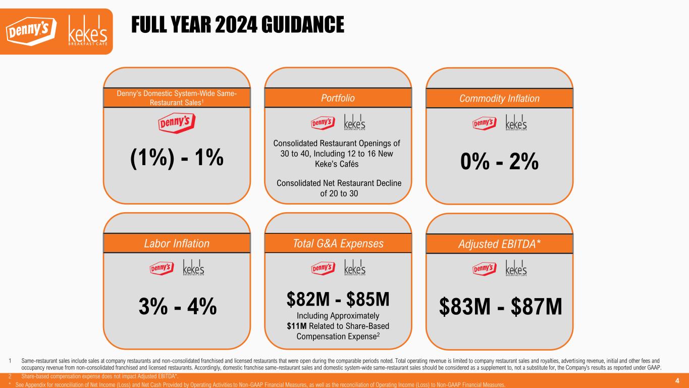 3 Q2 2024 HIGHLIGHTS 1 Same-restaurant sales include sales at company restaurants and non-consolidated franchised and licensed restaurants that were open during the comparable periods noted. Total operating revenue is limited to company restaurant sales and royalties, advertising revenue, initial and other fees and occupancy revenue from non-consolidated franchised and licensed restaurants. Accordingly, domestic franchise same-restaurant sales and domestic system-wide same-restaurant sales should be considered as a supplement to, not a substitute for, the Company’s results as reported under GAAP. * See Appendix for reconciliation of Net Income (Loss) and Net Cash Provided by Operating Activities to Non-GAAP Financial Measures, as well as the reconciliation of Operating Income (Loss) to Non-GAAP Financial Measures. $20.3M Adjusted EBITDA* Denny’s Domestic System-Wide Same- Restaurant Sales1 Adjusted Net Income Per Share* $0.13 Total Debt Leverage Ratio 3.7x New Openings 3 Franchise Openings 1 Second Café Outside of Florida $115.9M Total Operating Revenue (0.6%) +2.4% on a 2-year basis