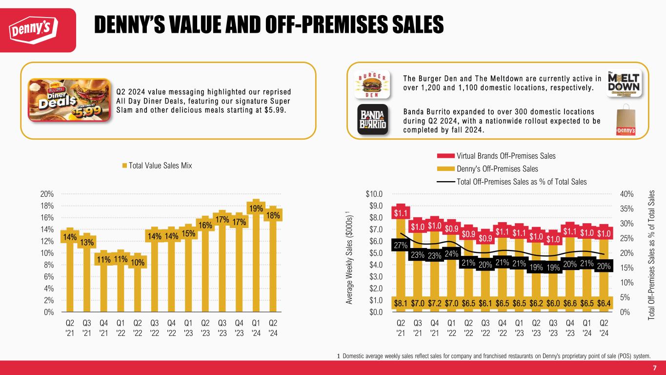 6 DENNY’S DOMESTIC SALES $9.2 $8.0 $8.1 $7.9 $7.4 $7.1 $7.6 $7.5 $7.2 $7.0 $7.6 $7.5 $7.5 $25.3 $26.2 $27.0 $25.2 $28.3 $28.1 $28.9 $29.1 $30.3 $29.6 $30.0 $29.2 $30.6 $34.5 $34.3 $35.2 $33.1 $35.7 $35.1 $36.5 $36.7 $37.5 $36.5 $37.7 $36.8 $38.1 -1% 0% 1% -2% 2% 2% 3% 8% 3% 2% 1% -1% -1% -5% -3% -1% 1% 3% 5% 7% 9% $0.0 $5.0 $10.0 $15.0 $20.0 $25.0 $30.0 $35.0 $40.0 Q2 '21 Q3 '21 Q4 '21 Q1 '22 Q2 '22 Q3 '22 Q4 '22 Q1 '23 Q2 '23 Q3 '23 Q4 '23 Q1 '24 Q2 '24 D om es tic S ys te m -W id e S am e- R es ta ur an t S al es 1 A ve ra ge W ee kl y S al es ( $0 00 s) 3 Denny's On-Premises Sales Denny's Total Off-Premises Sales Denny's Total Sales Denny's Domestic System-Wide Same-Restaurant Sales 1 Same-restaurant sales include sales at company restaurants and non-consolidated franchised and licensed restaurants that were open during the comparable periods noted. Total operating revenue is limited to company restaurant sales and royalties, advertising revenue, initial and other fees and occupancy revenue from non-consolidated franchised and licensed restaurants. Accordingly, domestic franchise same-restaurant sales and domestic system-wide same-restaurant sales should be considered as a supplement to, not a substitute for, the Company’s results as reported under GAAP. 2 2021 and 2022 Denny’s domestic system-wide same-restaurant sales1 are versus 2019. 3 Domestic average weekly sales reflect sales for company and franchised restaurants on Denny’s proprietary point of sale (POS) system. 4 Data for the Fiscal Second Quarter 2024. 1, 2 68% 52% 24% 37%32% 48% 76% 63% 0% 20% 40% 60% 80% Dine In Off-Premise The Burger Den The Meltdown Sales Mix by Daypart4 Breakfast & Lunch Dinner & Late-Night 59% 63% 69% 69% 41% 37% 31% 31% 0% 20% 40% 60% 80% Dine In Off-Premise The Burger Den The Meltdown Sales Mix Weekday vs. Weekend4 Weekday Weekend Denny’s Q2 2024 Domestic Average Weekly Sales of Approximately $38,100.