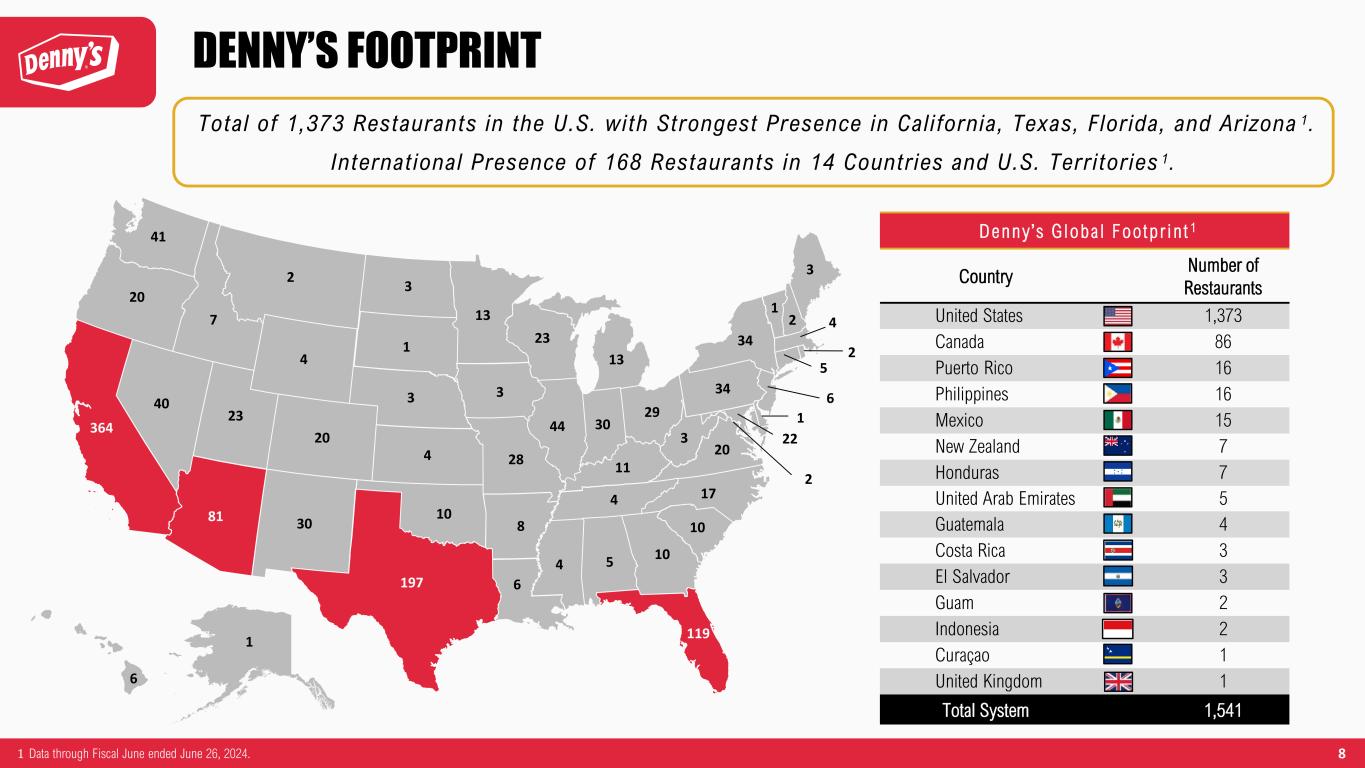 7 DENNY’S VALUE AND OFF-PREMISES SALES $8.1 $7.0 $7.2 $7.0 $6.5 $6.1 $6.5 $6.5 $6.2 $6.0 $6.6 $6.5 $6.4 $1.1 $1.0 $1.0 $0.9 $0.9 $0.9 $1.1 $1.1 $1.0 $1.0 $1.1 $1.0 $1.0 27% 23% 23% 24% 21% 20% 21% 21% 19% 19% 20% 21% 20% 0% 5% 10% 15% 20% 25% 30% 35% 40% $0.0 $1.0 $2.0 $3.0 $4.0 $5.0 $6.0 $7.0 $8.0 $9.0 $10.0 Q2 '21 Q3 '21 Q4 '21 Q1 '22 Q2 '22 Q3 '22 Q4 '22 Q1 '23 Q2 '23 Q3 '23 Q4 '23 Q1 '24 Q2 '24 To ta l O ff- P re m is es S al es a s % o f T ot al S al es A ve ra ge W ee kl y S al es ( $0 00 s) 1 Virtual Brands Off-Premises Sales Denny's Off-Premises Sales Total Off-Premises Sales as % of Total Sales The Bu r ger Den and The Me l t down a r e cu r ren t l y a c t i ve in o v e r 1 , 200 and 1 ,100 domes t i c l o c a t ions , r e spec t i ve l y . Banda Bu r r i to expanded t o o v er 300 domes t ic l o ca t ions du r ing Q2 2024 , w i th a n a t ionw ide r o l lou t expec ted t o be comple ted by f a l l 2024 . Q2 2024 v a lue messag ing h i gh l igh ted ou r r ep r i sed A l l D a y D i ner Dea l s , f e a tu r ing ou r s i gna tu re Super S l am and o t he r de l i c ious mea ls s t a r t i ng a t $5 .99 . 14% 13% 11% 11% 10% 14% 14% 15% 16% 17% 17% 19% 18% 0% 2% 4% 6% 8% 10% 12% 14% 16% 18% 20% Q2 '21 Q3 '21 Q4 '21 Q1 '22 Q2 '22 Q3 '22 Q4 '22 Q1 '23 Q2 '23 Q3 '23 Q4 '23 Q1 '24 Q2 '24 Total Value Sales Mix 1 Domestic average weekly sales reflect sales for company and franchised restaurants on Denny’s proprietary point of sale (POS) system.