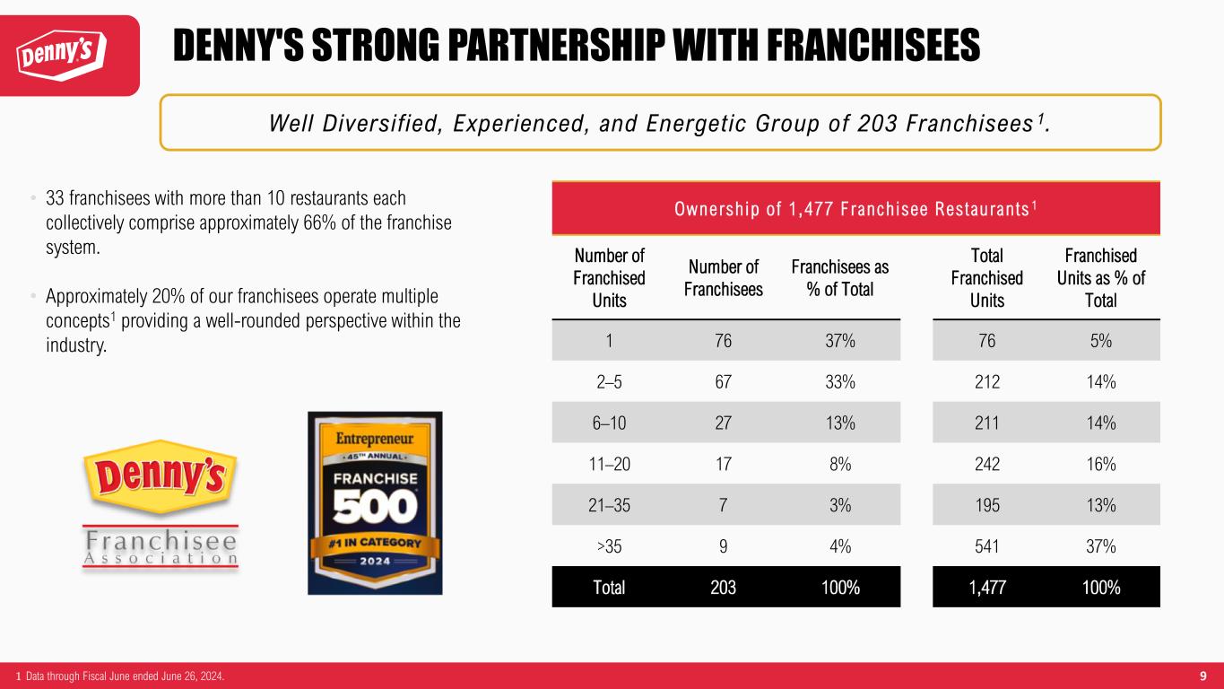 8 1 Total of 1,373 Restaurants in the U.S. with Strongest Presence in California, Texas, Florida, and Arizona 1. International Presence of 168 Restaurants in 14 Countries and U.S. Territories 1. 364 81 30 197 6 4 5 10 119 10 174 8 10 40 23 20 4 28 11 20 3 20 7 4 3 3 44 30 29 34 34 41 2 3 1 13 23 13 3 1 2 4 2 5 6 1 22 DENNY’S FOOTPRINT Denny ’ s G loba l Foo tp r i n t 1 Country Number of Restaurants United States 1,373 Canada 86 Puerto Rico 16 Philippines 16 Mexico 15 New Zealand 7 Honduras 7 United Arab Emirates 5 Guatemala 4 Costa Rica 3 El Salvador 3 Guam 2 Indonesia 2 Curaçao 1 United Kingdom 1 Total System 1,541 1 Data through Fiscal June ended June 26, 2024. 6 2