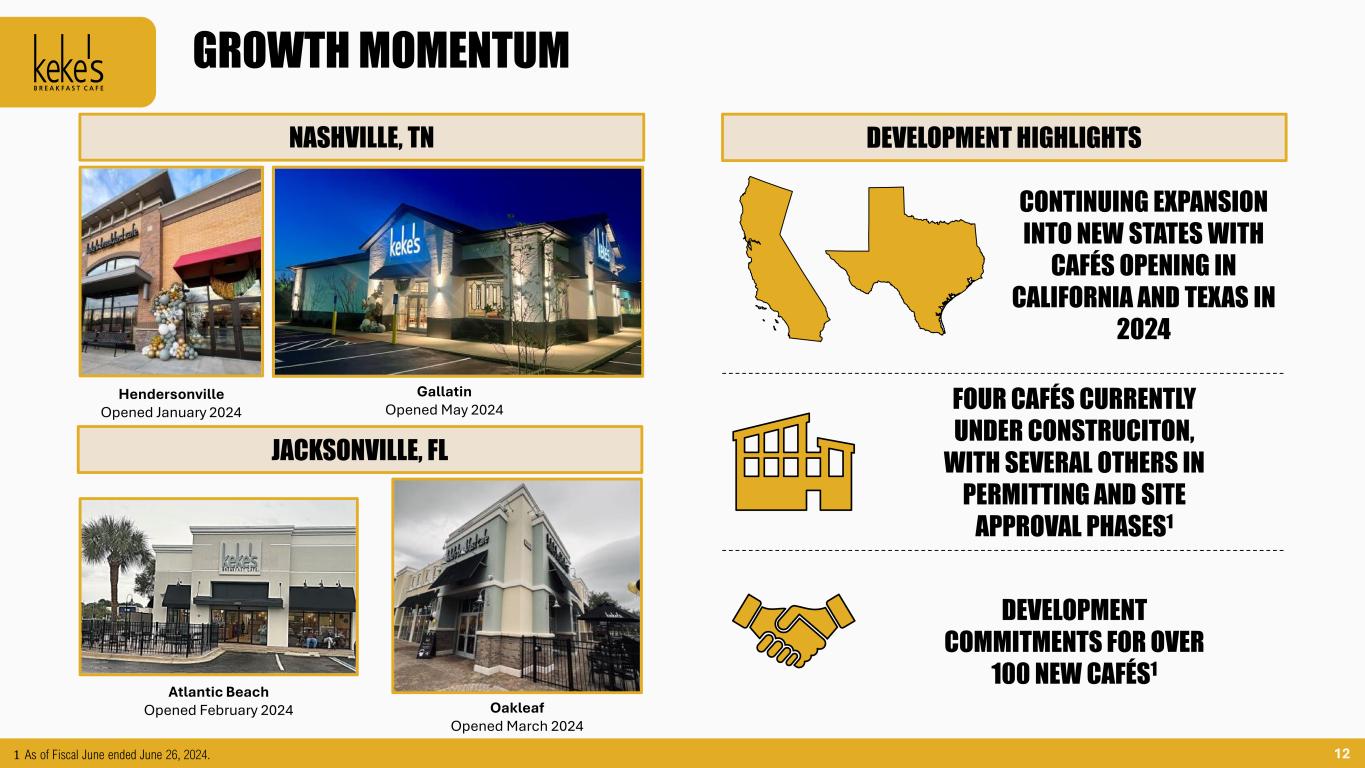 11 KEKE’S HIGHLIGHTS Total of 62 Cafés with Heavy Concentrations in the Orlando and Tampa Areas 1. Opened Second Café Outside of Florida During Q2 2024 in Tennessee. 1 Data through Fiscal June ended June 26, 2024. 2 Keke’s data is annualized based on the reported Average Unit Volumes following acquisition. Ownersh ip o f 51 F r anch i see Res t au r an t s 1 Number of Franchised Units Number of Franchisees Franchisees as % of Total Total Franchised Units Franchised Units as % of Total 1 8 44% 8 16% 2–5 8 44% 28 55% 6–10 2 11% 15 29% Total 18 100% 51 100% $1.6 $1.2 $1.9 $1.8 $1.8 $0.0 $1.0 $2.0 $3.0 2019 2020 2021 2022 2023 $M s Keke’s System Restaurant AUVs 2 Keke ’ s Mar ke t s 1 DMA Number of Restaurants Orlando/Daytona 26 Tampa/St. Petersburg/Sarasota 20 Jacksonville 5 West Palm Beach/Ft Pierce 4 Ft Myers/Naples 3 Nashville 2 Gainesville 1 Tallahassee/Thomasville 1 Total System 62