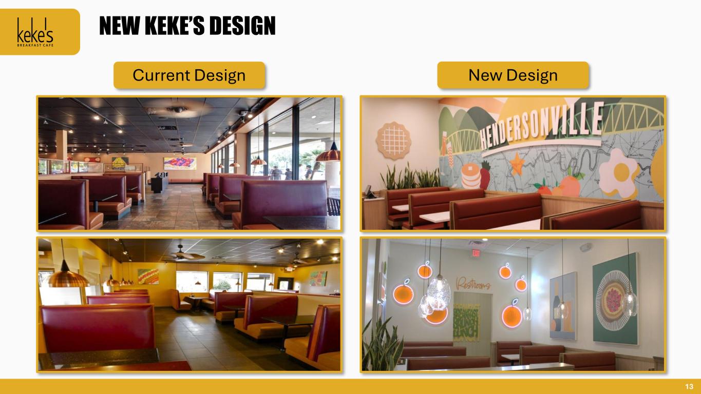 12 GROWTH MOMENTUM DEVELOPMENT HIGHLIGHTS Hendersonville Opened January 2024 NASHVILLE, TN JACKSONVILLE, FL Oakleaf Opened March 2024 Atlantic Beach Opened February 2024 DEVELOPMENT COMMITMENTS FOR OVER 100 NEW CAFÉS1 CONTINUING EXPANSION INTO NEW STATES WITH CAFÉS OPENING IN CALIFORNIA AND TEXAS IN 2024 FOUR CAFÉS CURRENTLY UNDER CONSTRUCITON, WITH SEVERAL OTHERS IN PERMITTING AND SITE APPROVAL PHASES1 1 As of Fiscal June ended June 26, 2024. Gallatin Opened May 2024