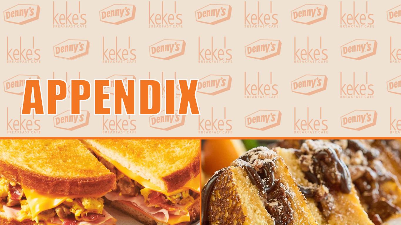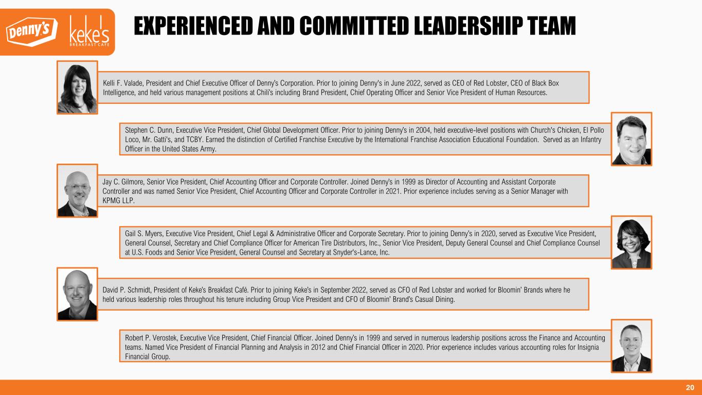 20 Robert P. Verostek, Executive Vice President, Chief Financial Officer. Joined Denny’s in 1999 and served in numerous leadership positions across the Finance and Accounting teams. Named Vice President of Financial Planning and Analysis in 2012 and Chief Financial Officer in 2020. Prior experience includes various accounting roles for Insignia Financial Group. Kelli F. Valade, President and Chief Executive Officer of Denny’s Corporation. Prior to joining Denny's in June 2022, served as CEO of Red Lobster, CEO of Black Box Intelligence, and held various management positions at Chili’s including Brand President, Chief Operating Officer and Senior Vice President of Human Resources. Jay C. Gilmore, Senior Vice President, Chief Accounting Officer and Corporate Controller. Joined Denny’s in 1999 as Director of Accounting and Assistant Corporate Controller and was named Senior Vice President, Chief Accounting Officer and Corporate Controller in 2021. Prior experience includes serving as a Senior Manager with KPMG LLP. Gail S. Myers, Executive Vice President, Chief Legal & Administrative Officer and Corporate Secretary. Prior to joining Denny’s in 2020, served as Executive Vice President, General Counsel, Secretary and Chief Compliance Officer for American Tire Distributors, Inc., Senior Vice President, Deputy General Counsel and Chief Compliance Counsel at U.S. Foods and Senior Vice President, General Counsel and Secretary at Snyder's-Lance, Inc. David P. Schmidt, President of Keke’s Breakfast Café. Prior to joining Keke’s in September 2022, served as CFO of Red Lobster and worked for Bloomin’ Brands where he held various leadership roles throughout his tenure including Group Vice President and CFO of Bloomin’ Brand’s Casual Dining. Stephen C. Dunn, Executive Vice President, Chief Global Development Officer. Prior to joining Denny’s in 2004, held executive-level positions with Church's Chicken, El Pollo Loco, Mr. Gatti's, and TCBY. Earned the distinction of Certified Franchise Executive by the International Franchise Association Educational Foundation. Served as an Infantry Officer in the United States Army. EXPERIENCED AND COMMITTED LEADERSHIP TEAM