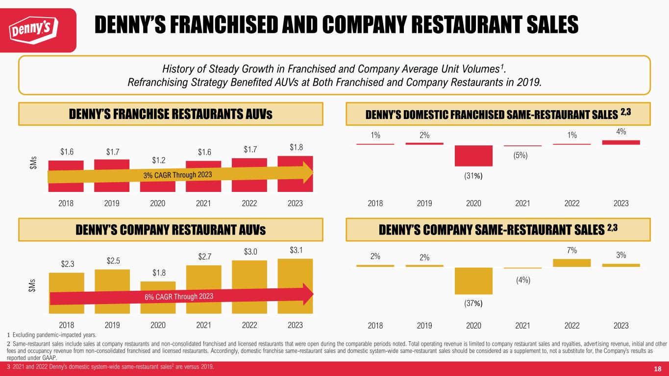 22 $ Millions 2018 2019 20201 2021 2022 2023 YTD Jun 2024 Operating Income $73.6 $165.0 $6.7 $104.1 $60.6 $52.8 $19.1 General and Administrative Expenses 63.8 69.0 55.0 68.7 67.2 77.8 41.7 Depreciation and Amortization 27.0 19.8 16.2 15.4 14.9 14.4 7.3 Goodwill Impairment Charges - - - - - 6.4 0.0 Operating (Gains) Losses and Other Charges, Net 2.6 (91.2) 1.8 (46.1) (1.0) 2.5 1.2 Restaurant-Level Operating Margin $167.1 $162.7 $79.7 $142.1 $141.6 $153.9 $69.4 Restaurant-Level Operating Margin Consists Of: Company Restaurant Operating Margin (2) 63.2 48.0 3.6 28.1 20.3 27.9 11.0 Franchise Operating Margin (3) 104.0 114.7 76.1 114.0 121.3 125.9 58.4 Restaurant-Level Operating Margin $167.1 $162.7 $79.7 $142.1 $141.6 $153.9 $69.4 Adjustments (4) 0.6 1.1 6.4 1.3 4.2 2.5 4.7 Adjusted Restaurant-Level Operating Margin $167.7 $163.7 $86.1 $143.4 $145.8 $156.4 $74.1 Adjusted Restaurant-Level Operating Margin Consists Of: Adjusted Company Restaurant Operating Margin 63.5 49.0 2.6 30.4 24.5 30.5 13.2 Adjusted Franchise Operating Margin 104.1 114.7 83.6 112.9 121.3 125.9 60.9 Adjusted Restaurant-Level Operating Margin $167.7 $163.7 $86.1 $143.4 $145.8 $156.4 $74.1 The Company believes that, in addition to GAAP measures, certain other non-GAAP financial measures are useful information to investors and analysts to assist in the evaluation of restaurant-level operating efficiency and performance of ongoing restaurant-level operations. However, non-GAAP measures should be considered as a supplement to, not a substitute for, operating income, net income, and net income per share, or other financial performance measures prepared in accordance with GAAP. The Company uses restaurant-level operating margin, company restaurant operating margin and franchise operating margin internally as performance measures for planning purposes, including the preparation of annual operating budgets, and for compensation purposes, including incentive compensation for certain employees. Restaurant-level operating margin is the total of company restaurant operating margin and franchise operating margin and excludes: (i) general and administrative expenses, which include primarily non-restaurant-level costs associated with support of company and franchised restaurants and other activities at their corporate office; (ii) depreciation and amortization expense, substantially all of which is related to company restaurant-level assets, because such expenses represent historical sunk costs which do not reflect current cash outlays for the restaurants; (iii) special items, included within operating (gains), losses and other charges, net, to provide investors with a clearer perspective of its ongoing operating performance and a more relevant comparison to prior period results. Company restaurant operating margin is defined as company restaurant sales less costs of company restaurant sales (which include product costs, company restaurant level payroll and benefits, occupancy costs, and other operating costs including utilities, repairs and maintenance, marketing and other expenses) and presents it as a percent of company restaurant sales. Adjusted company operating restaurant margin is defined as company restaurant operating margin less certain items such as legal settlement expenses, pre-opening expenses, and other items the Company does not consider in the evaluation of its ongoing core operating performance. Franchise operating margin is defined as franchise and license revenue (which includes franchise royalties and other non-food and beverage revenue streams such as initial franchise and other fees, advertising revenue and occupancy revenue) less costs of franchise and license revenue and presents it as a percent of franchise and license revenue. Adjusted franchise operating margin is defined as franchise operating margin less certain items the Company does not consider in the evaluation of its ongoing core operating performance. Adjusted restaurant-level operating margin is the total of adjusted company restaurant operating margin and adjusted franchise operating margin and is defined as restaurant-level operating margin adjusted for certain items the Company does not consider in the evaluation of its ongoing core operating performance. These adjustments are either non-recurring in nature or vary from period to period without correlation to the Company's ongoing core operating performance. See most recent press release for a further breakdown of adjusted restaurant-level operating margin. RECONCILIATION OF OPERATING INCOME TO NON-GAAP FINANCIAL MEASURES 1. Includes 53 operating weeks. 2. Company restaurant operating margin is calculated as operating income plus general and administrative expenses; depreciation and amortization; operating (gains), losses and other charges, net; and costs of franchise and license revenue, excluding depreciation and amortization; less franchise and license revenue. 3. Franchise operating margin is calculated as operating income plus general and administrative expenses; depreciation and amortization; operating (gains), losses and other charges, net; and costs of company restaurant sales, excluding depreciation and amortization; less company restaurant sales. 4. Adjustments include legal settlement expenses, pre-opening costs, and other adjustments the Company does not consider in the evaluation of its ongoing core operating performance. Adjustments for the quarter and year-to-date period ended June 26, 2024 include a $2.6 million distribution to franchisees related to a review of advertising costs.