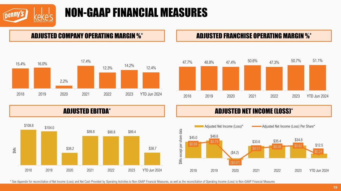 18 History of Steady Growth in Franchised and Company Average Unit Volumes1. Refranchising Strategy Benefited AUVs at Both Franchised and Company Restaurants in 2019. DENNY’S FRANCHISED AND COMPANY RESTAURANT SALES 1 Excluding pandemic-impacted years. 2 Same-restaurant sales include sales at company restaurants and non-consolidated franchised and licensed restaurants that were open during the comparable periods noted. Total operating revenue is limited to company restaurant sales and royalties, advertising revenue, initial and other fees and occupancy revenue from non-consolidated franchised and licensed restaurants. Accordingly, domestic franchise same-restaurant sales and domestic system-wide same-restaurant sales should be considered as a supplement to, not a substitute for, the Company’s results as reported under GAAP. 3 2021 and 2022 Denny’s domestic system-wide same-restaurant sales2 are versus 2019. 2% 2% -23% -1% 7% 3% 2018 2019 2020 2021 2022 2023 (37%) (4 ) 1% 2% -18% -1% 1% 4% 2018 2019 2020 2021 2022 2023 (31%) (5%)$1.6 $1.7 $1.2 $1.6 $1.7 $1.8 2018 2019 2020 2021 2022 2023 $M s $2.3 $2.5 $1.8 $2.7 $3.0 $3.1 2018 2019 2020 2021 2022 2023 $M s DENNY’S FRANCHISE RESTAURANTS AUVs DENNY’S DOMESTIC FRANCHISED SAME-RESTAURANT SALES 2,3 DENNY’S COMPANY RESTAURANT AUVs DENNY’S COMPANY SAME-RESTAURANT SALES 2,3