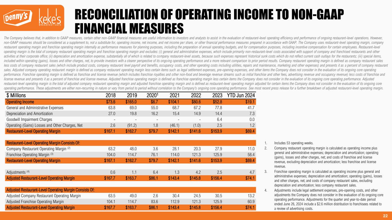 21 $ Millions 2018 2019 20201 2021 2022 2023 YTD Jun 2024 Net Income (Loss) $43.7 $117.4 ($5.1) $78.1 $74.7 $19.9 $8.3 Provision for (Benefit from) Income Taxes 8.6 31.8 (2.0) 26.0 24.7 7.0 2.7 Goodwill Impairment Charges - - - - - 6.4 0.0 Operating (Gains) Losses and Other Charges, Net 2.6 (91.2) 1.8 (46.1) (1.0) 2.5 1.2 Other Nonoperating Expense (Income), Net 0.6 (2.8) (4.2) (15.2) (52.6) 8.3 (0.9) Share‐Based Compensation Expense 6.0 6.7 7.9 13.6 11.4 8.9 5.4 Deferred Compensation Plan Valuation Adjustments (1.0) 2.6 1.6 2.1 (2.2) 1.9 0.9 Interest Expense, Net 20.7 18.5 18.0 15.1 13.8 17.6 9.0 Depreciation and Amortization 27.0 19.8 16.2 15.4 14.9 14.4 7.3 Legal Settlement Expenses 0.3 1.1 0.5 2.1 4.2 2.3 1.7 Pre-Opening Expenses 0.1 0.0 - - - 0.3 0.6 COVID-19 Related Expenses - - 3.5 (1.4) - - - Leadership Transition Costs - - - - 0.3 - - Acquisition Costs - - - - 0.6 - - Other Adjustments 0.2 (0.0) 0.0 - (0.1) (0.1) 2.5 Adjusted EBITDA $108.8 $104.0 $38.2 $89.8 $88.8 $89.4 $38.7 Adjusted EBITDA Margin % 17.3% 19.2% 13.0% 22.6% 19.4% 19.3% 17.1% Net Income (Loss) $43.7 $117.4 ($5.1) $78.1 $74.7 $19.9 $8.3 (Gains) Losses and Amort. on Interest Rate Swap Derivatives, Net - - (2.2) (12.6) (55.0) 11.0 0.3 Losses (Gains) on Sales of Assets and Other, Net (0.5) (93.6) (4.7) (47.8) (3.4) (2.2) (0.1) Impairment Charges2 1.6 - 4.1 0.4 1.0 8.6 0.7 Legal Settlement Expenses 0.3 1.1 0.5 2.1 4.2 2.3 1.7 Pre-Opening Expenses 0.1 0.0 - - - 0.3 0.6 COVID-19 Related Expenses - - 3.5 (1.4) - - - Leadership Transition Costs - - - - 0.3 - - Acquisition Costs - - - - 0.6 - - Other Adjustments 0.2 (0.0) 0.0 - (0.1) (0.1) 2.5 Tax Effect3 (0.3) 23.8 (0.3) 14.8 13.0 (5.0) (1.4) Adjusted Net Income (Loss) $45.0 $48.6 ($4.2) $33.6 $35.4 $34.8 $12.5 Net Income (Loss) Per Share - Diluted $0.67 $1.90 ($0.08) $1.19 $1.23 $0.35 $0.16 Adjustments Per Share $0.02 ($1.11) $0.01 ($0.68) ($0.65) $0.27 $0.08 Adjusted Net Income (Loss) Per Share $0.69 $0.79 ($0.07) $0.51 $0.58 $0.62 $0.24 Diluted Weighted Average Shares Outstanding (000’s) 65,562 61,833 60,812 65,573 60,879 56,196 53,002 RECONCILIATION OF NET INCOME (LOSS) TO NON-GAAP FINANCIAL MEASURES 1. Includes 53 operating weeks. 2. Impairment charges include goodwill impairment charges of $6.4 million and less than $0.1 million for full year 2023 and for year-to-date period ended June 26, 2024, respectively. 3. Tax adjustments for full year 2018, 2019, 2020, 2021, 2022, 2023 and year-to- date period ended June 26, 2024 reflect an effective tax rate of 16.4%, 25.7%, 25.6%, 25.0%, 24.9%, 25.0% and 24.8%, respectively.