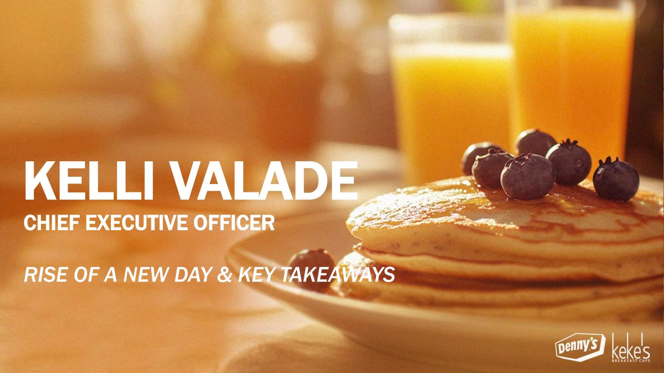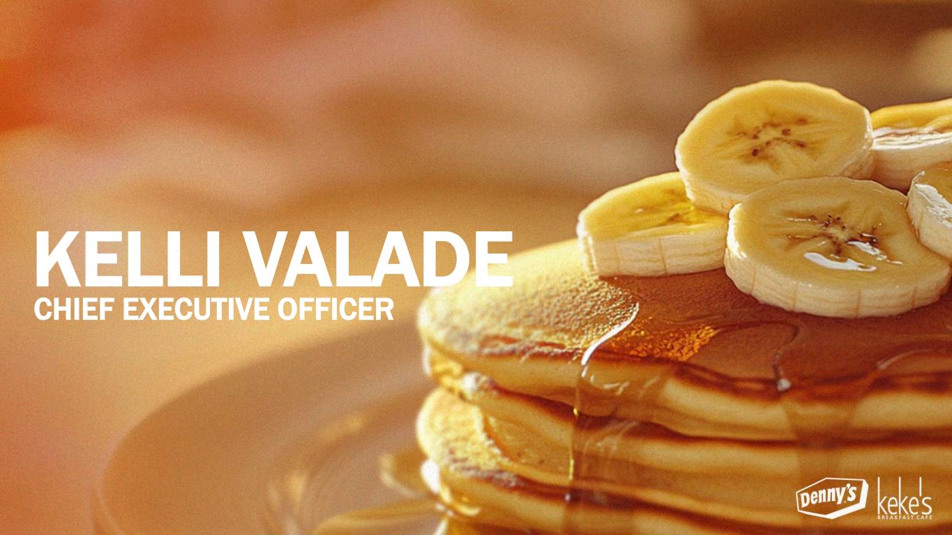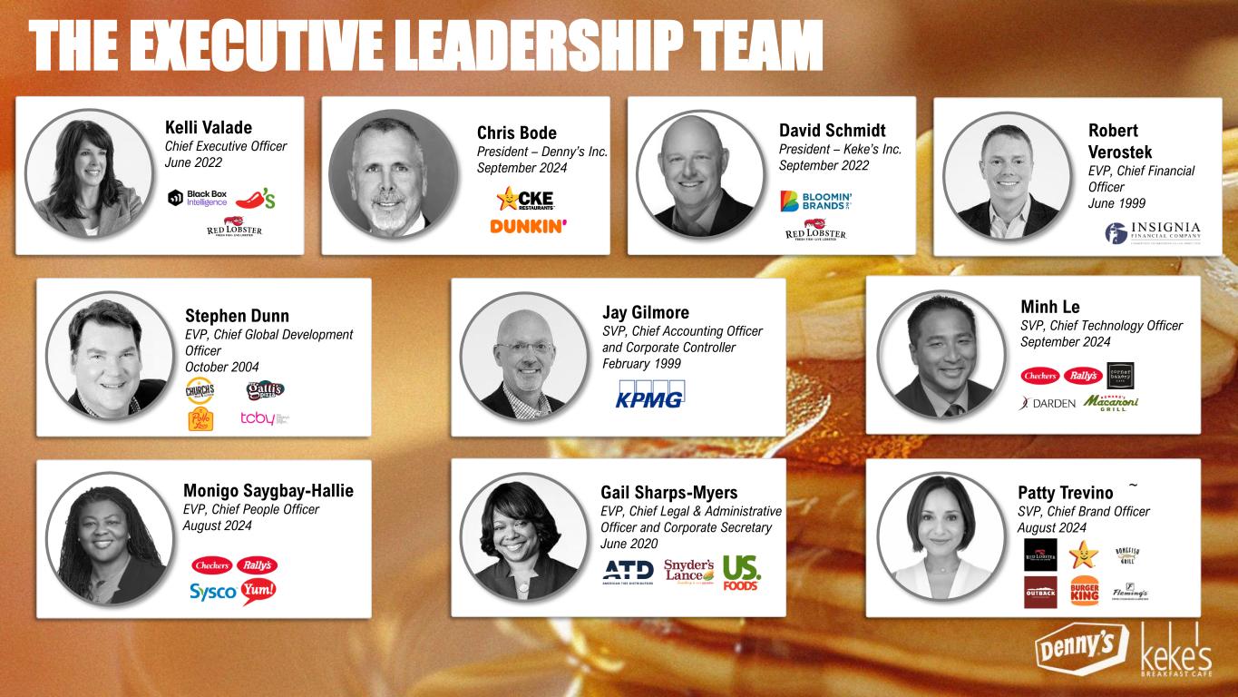 THE EXECUTIVE LEADERSHIP TEAM David Schmidt President – Keke’s Inc. September 2022 Stephen Dunn EVP, Chief Global Development Officer October 2004 Chris Bode President – Denny’s Inc. September 2024 Kelli Valade Chief Executive Officer June 2022 Gail Sharps-Myers EVP, Chief Legal & Administrative Officer and Corporate Secretary June 2020 Robert Verostek EVP, Chief Financial Officer June 1999 Patty Trevino SVP, Chief Brand Officer August 2024 Jay Gilmore SVP, Chief Accounting Officer and Corporate Controller February 1999 Minh Le SVP, Chief Technology Officer September 2024 Monigo Saygbay-Hallie EVP, Chief People Officer August 2024 ~