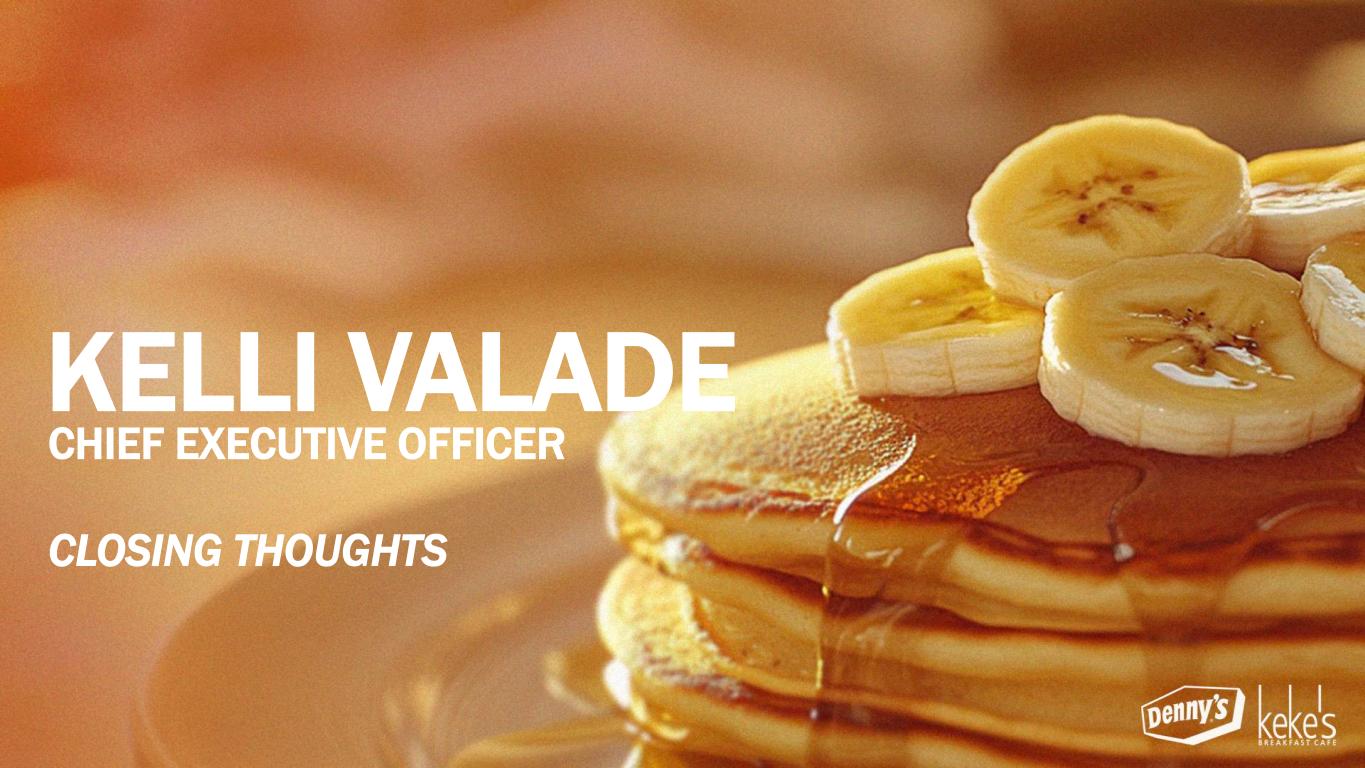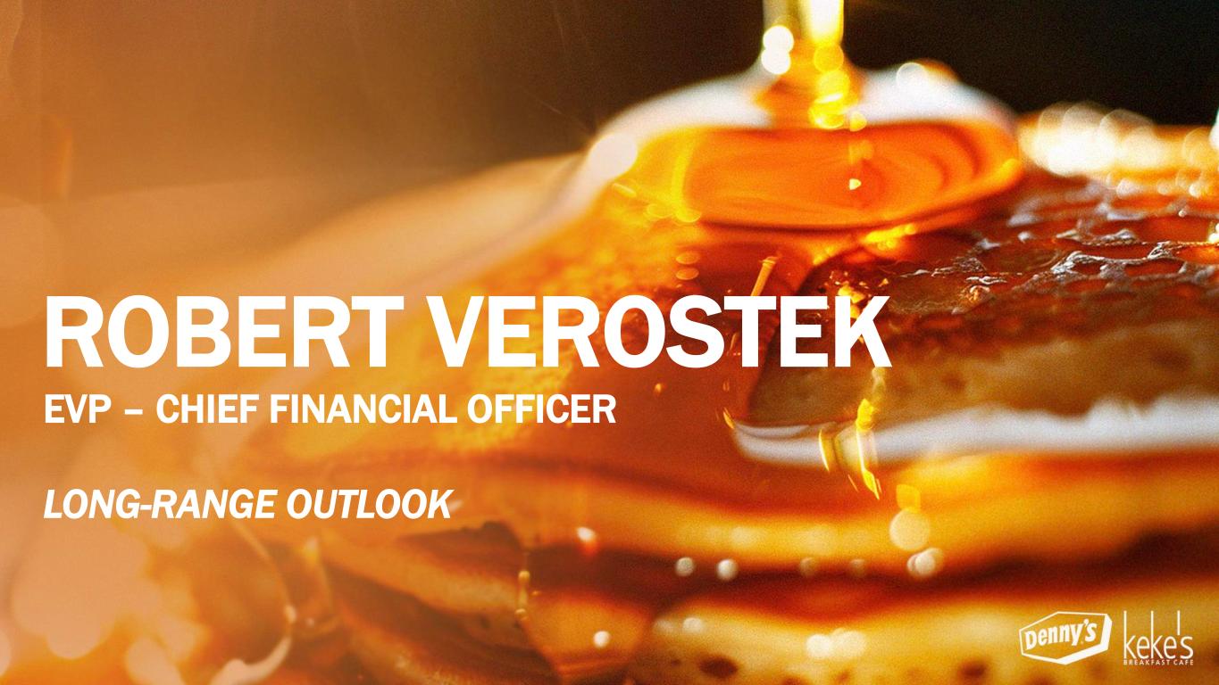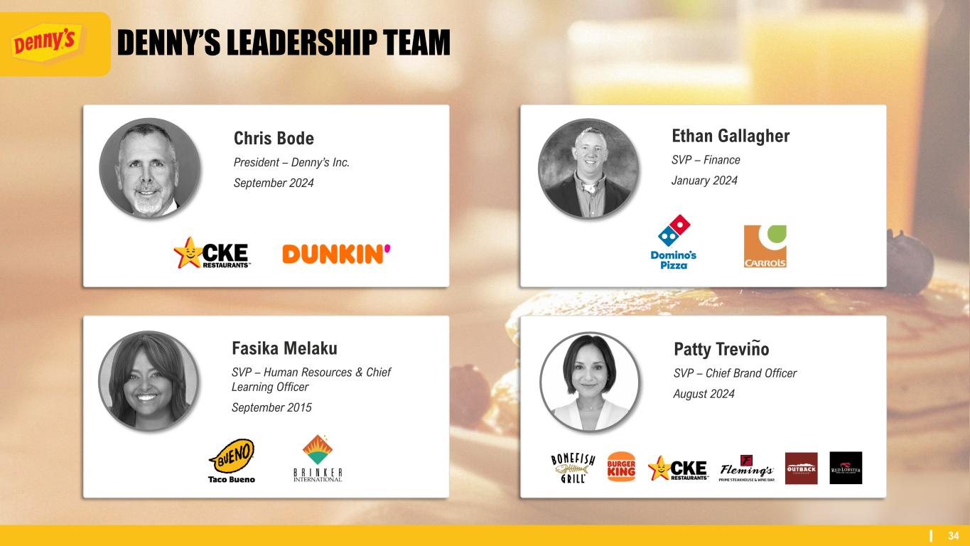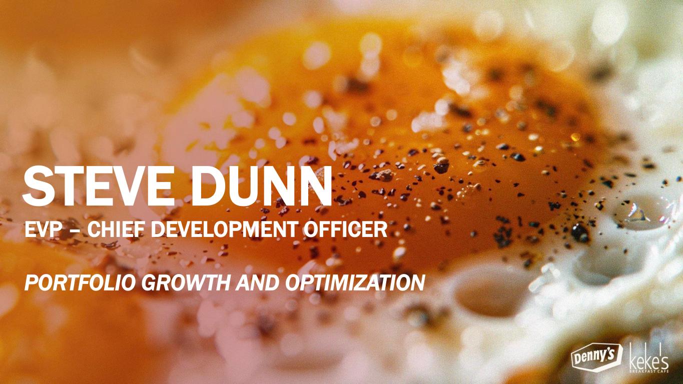 THE EXECUTIVE LEADERSHIP TEAM David Schmidt President – Keke’s Inc. September 2022 Stephen Dunn EVP, Chief Global Development Officer October 2004 Chris Bode President – Denny’s Inc. September 2024 Kelli Valade Chief Executive Officer June 2022 Gail Sharps-Myers EVP, Chief Legal & Administrative Officer and Corporate Secretary June 2020 Robert Verostek EVP, Chief Financial Officer June 1999 Patty Trevino SVP, Chief Brand Officer August 2024 Jay Gilmore SVP, Chief Accounting Officer and Corporate Controller February 1999 Minh Le SVP, Chief Technology Officer September 2024 Monigo Saygbay-Hallie EVP, Chief People Officer August 2024 ~