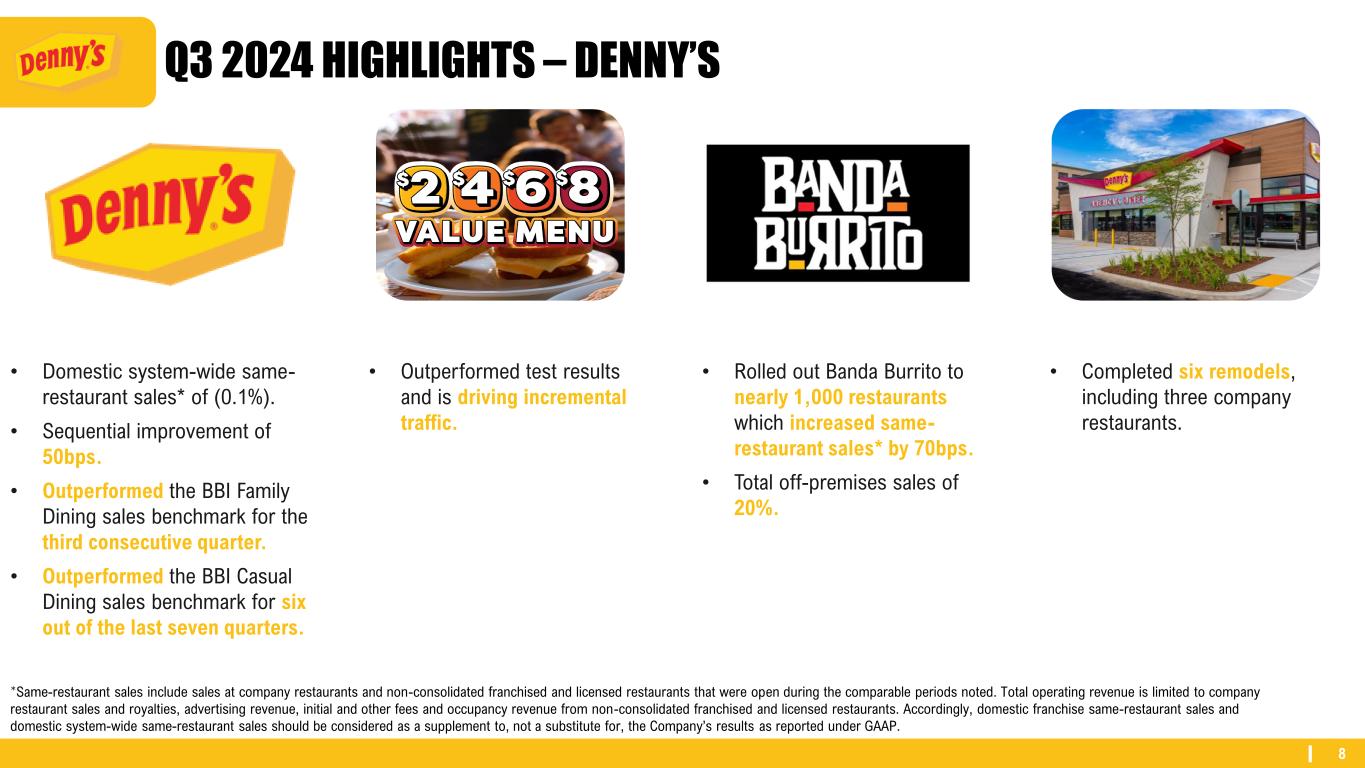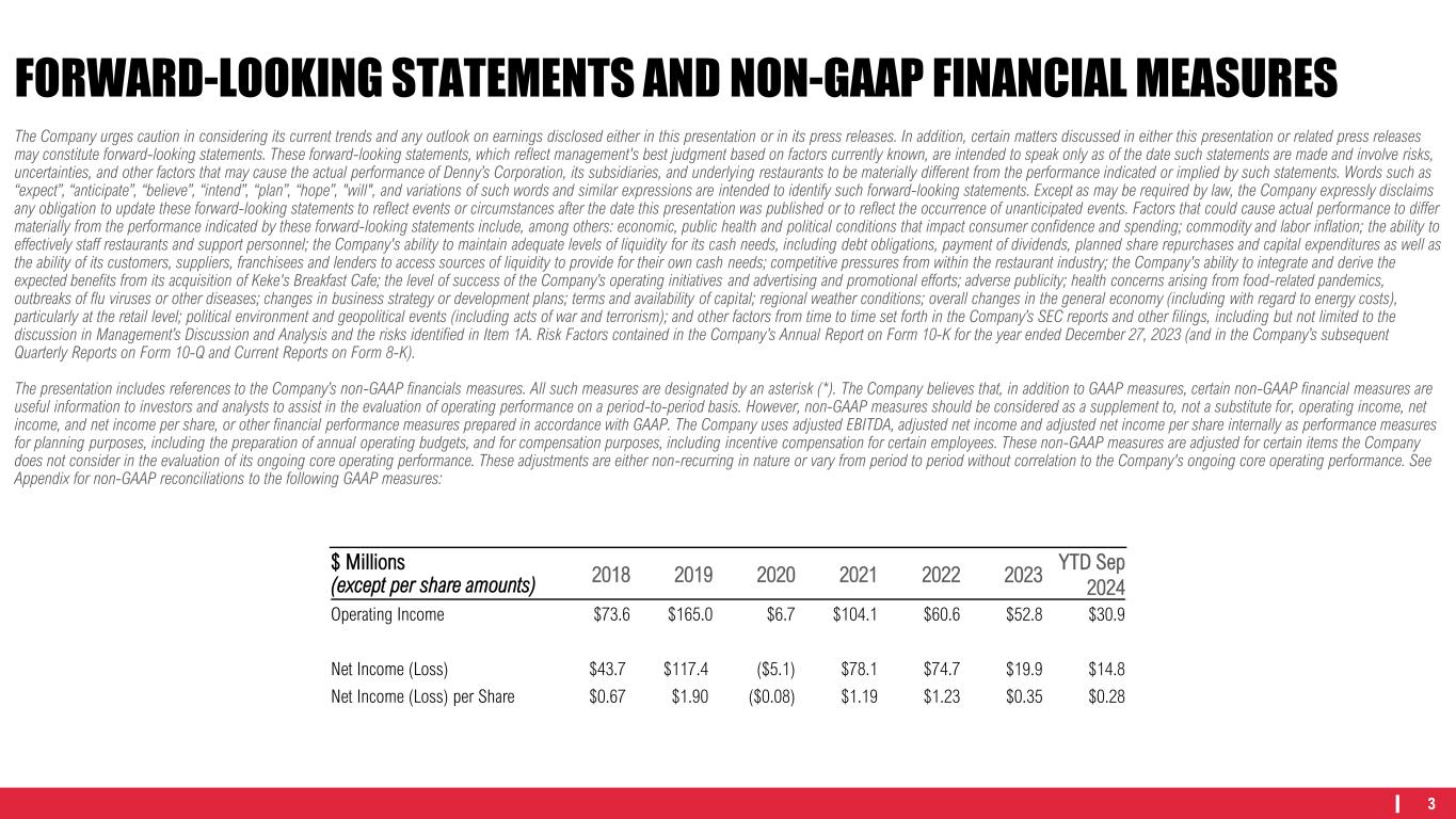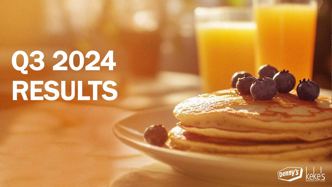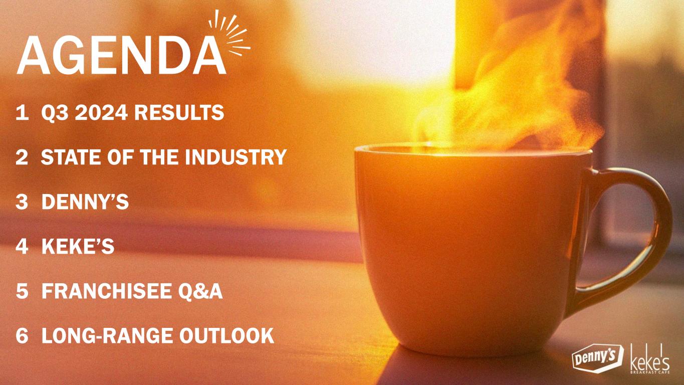 1 Q3 2024 RESULTS 2 STATE OF THE INDUSTRY 3 DENNY’S 4 KEKE’S 5 FRANCHISEE Q&A 6 LONG-RANGE OUTLOOK AGENDA