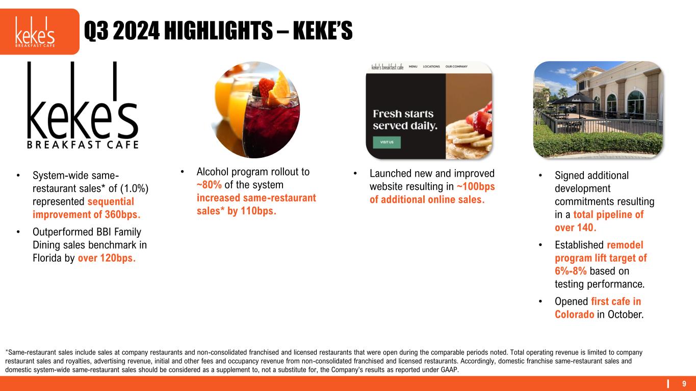 8 Q3 2024 HIGHLIGHTS – DENNY’S • Domestic system-wide same- restaurant sales* of (0.1%). • Sequential improvement of 50bps. • Outperformed the BBI Family Dining sales benchmark for the third consecutive quarter. • Outperformed the BBI Casual Dining sales benchmark for six out of the last seven quarters. • Outperformed test results and is driving incremental traffic. • Rolled out Banda Burrito to nearly 1,000 restaurants which increased same- restaurant sales* by 70bps. • Total off-premises sales of 20%. • Completed six remodels, including three company restaurants. *Same-restaurant sales include sales at company restaurants and non-consolidated franchised and licensed restaurants that were open during the comparable periods noted. Total operating revenue is limited to company restaurant sales and royalties, advertising revenue, initial and other fees and occupancy revenue from non-consolidated franchised and licensed restaurants. Accordingly, domestic franchise same-restaurant sales and domestic system-wide same-restaurant sales should be considered as a supplement to, not a substitute for, the Company’s results as reported under GAAP.