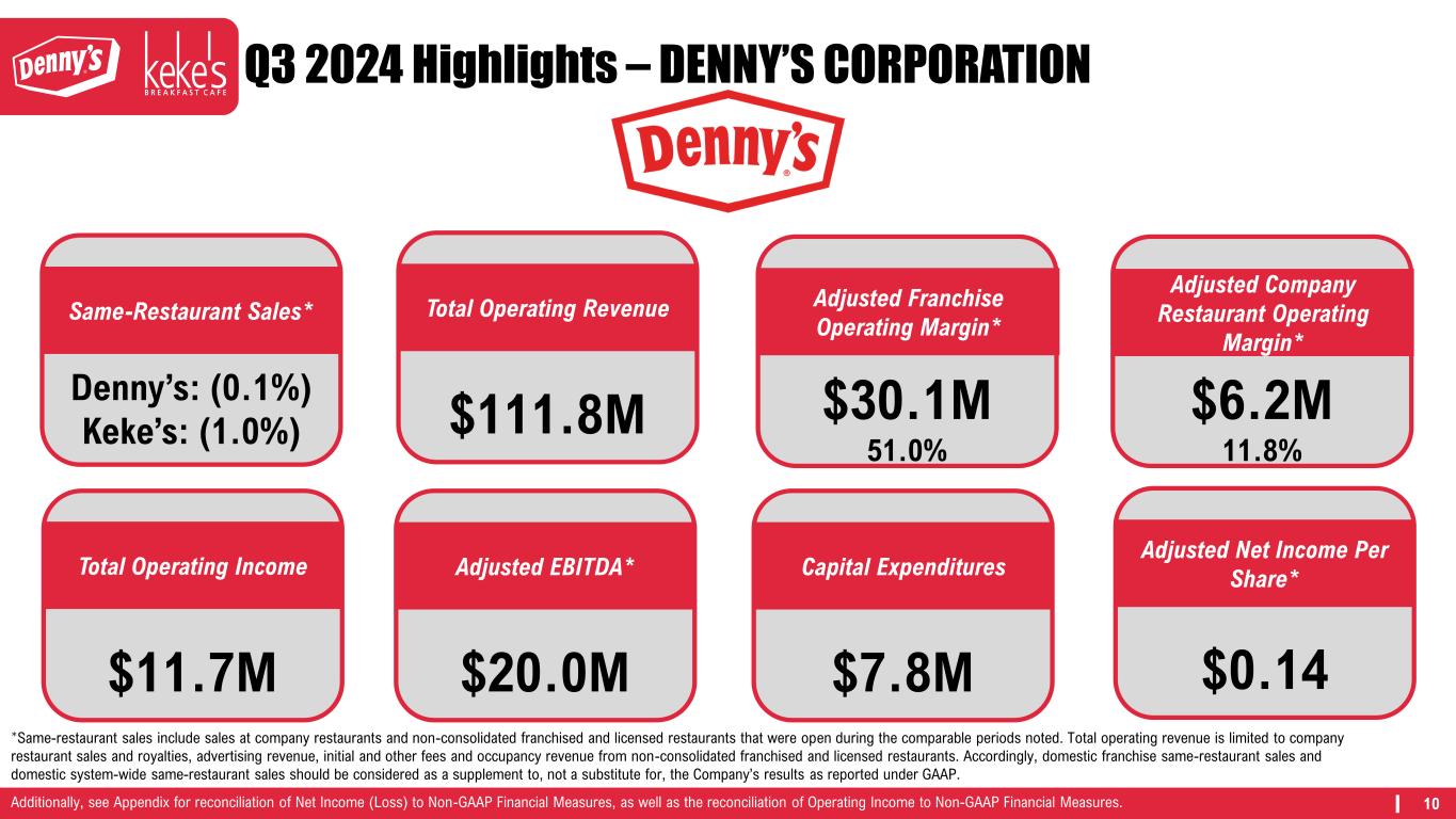 9 Q3 2024 HIGHLIGHTS – KEKE’S • Alcohol program rollout to ~80% of the system increased same-restaurant sales* by 110bps. • Signed additional development commitments resulting in a total pipeline of over 140. • Established remodel program lift target of 6%-8% based on testing performance. • Opened first cafe in Colorado in October. • System-wide same- restaurant sales* of (1.0%) represented sequential improvement of 360bps. • Outperformed BBI Family Dining sales benchmark in Florida by over 120bps. • Launched new and improved website resulting in ~100bps of additional online sales. *Same-restaurant sales include sales at company restaurants and non-consolidated franchised and licensed restaurants that were open during the comparable periods noted. Total operating revenue is limited to company restaurant sales and royalties, advertising revenue, initial and other fees and occupancy revenue from non-consolidated franchised and licensed restaurants. Accordingly, domestic franchise same-restaurant sales and domestic system-wide same-restaurant sales should be considered as a supplement to, not a substitute for, the Company’s results as reported under GAAP.