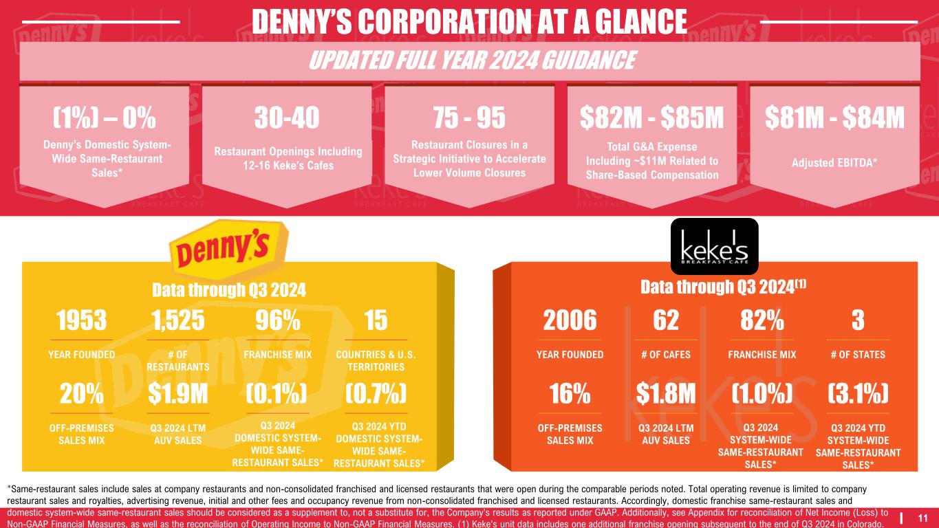 10 Q3 2024 Highlights – DENNY’S CORPORATION $111.8M $11.7M $20.0M Adjusted EBITDA* $0.14 Adjusted Net Income Per Share* $6.2M 11.8% Adjusted Company Restaurant Operating Margin* $30.1M 51.0% Adjusted Franchise Operating Margin* Total Operating Revenue Total Operating Income $7.8M Capital Expenditures Denny’s: (0.1%) Keke’s: (1.0%) Same-Restaurant Sales* Additionally, see Appendix for reconciliation of Net Income (Loss) to Non-GAAP Financial Measures, as well as the reconciliation of Operating Income to Non-GAAP Financial Measures. *Same-restaurant sales include sales at company restaurants and non-consolidated franchised and licensed restaurants that were open during the comparable periods noted. Total operating revenue is limited to company restaurant sales and royalties, advertising revenue, initial and other fees and occupancy revenue from non-consolidated franchised and licensed restaurants. Accordingly, domestic franchise same-restaurant sales and domestic system-wide same-restaurant sales should be considered as a supplement to, not a substitute for, the Company’s results as reported under GAAP.
