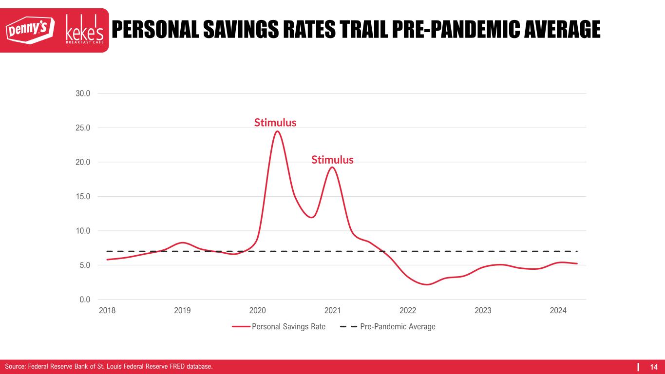 14 PERSONAL SAVINGS RATES TRAIL PRE-PANDEMIC AVERAGE 0.0 5.0 10.0 15.0 20.0 25.0 30.0 2018 2019 2020 2021 2022 2023 2024 Personal Savings Rate Pre-Pandemic Average Stimulus Stimulus Source: Federal Reserve Bank of St. Louis Federal Reserve FRED database.