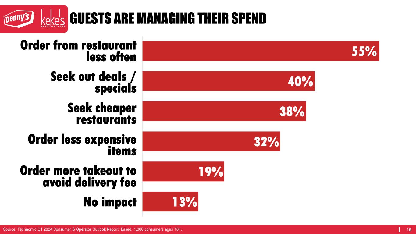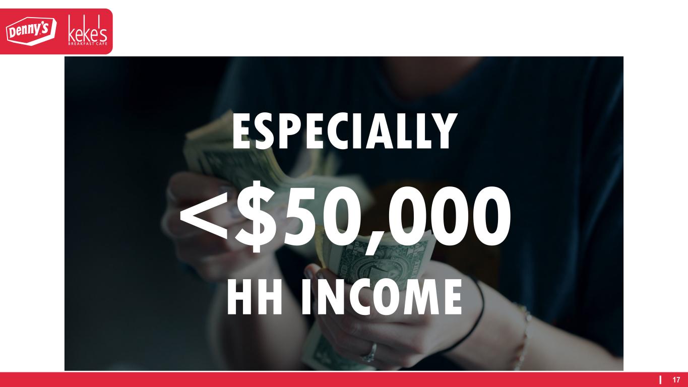 16 GUESTS ARE MANAGING THEIR SPEND Order from restaurant less often Seek out deals / specials Seek cheaper restaurants Order more takeout to avoid delivery fee Order less expensive items No impact 13% 19% 32% 38% 40% 55% Source: Technomic Q1 2024 Consumer & Operator Outlook Report. Based: 1,000 consumers ages 18+.