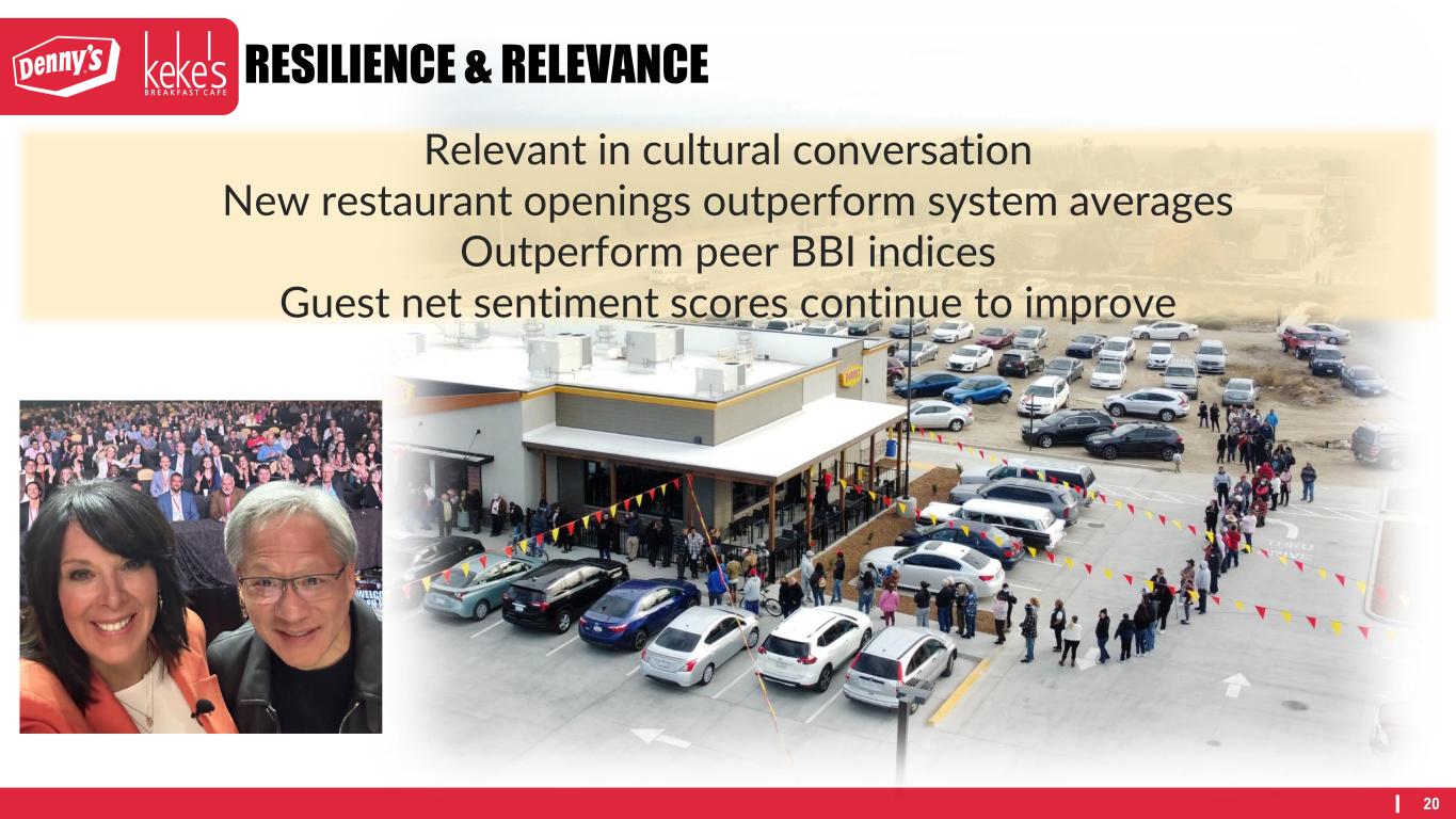 20 RESILIENCE & RELEVANCE Relevant in cultural conversation New restaurant openings outperform system averages Outperform peer BBI indices Guest net sentiment scores continue to improve