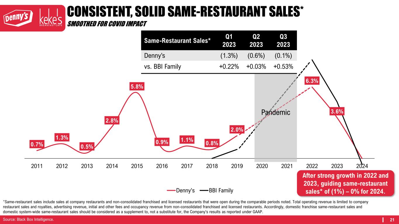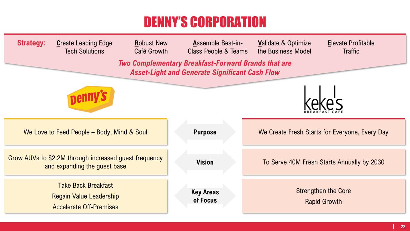 21 0.7% 1.3% 0.5% 2.8% 5.8% 0.9% 1.1% 0.8% 2.0% 6.3% 3.6% 2011 2012 2013 2014 2015 2016 2017 2018 2019 2020 2021 2022 2023 2024 Denny's BBI Family CONSISTENT, SOLID SAME-RESTAURANT SALES* SMOOTHED FOR COVID IMPACT After strong growth in 2022 and 2023, guiding same-restaurant sales* of (1%) – 0% for 2024. Pandemic Same-Restaurant Sales* Q1 2023 Q2 2023 Q3 2023 Denny’s (1.3%) (0.6%) (0.1%) vs. BBI Family +0.22% +0.03% +0.53% *Same-restaurant sales include sales at company restaurants and non-consolidated franchised and licensed restaurants that were open during the comparable periods noted. Total operating revenue is limited to company restaurant sales and royalties, advertising revenue, initial and other fees and occupancy revenue from non-consolidated franchised and licensed restaurants. Accordingly, domestic franchise same-restaurant sales and domestic system-wide same-restaurant sales should be considered as a supplement to, not a substitute for, the Company’s results as reported under GAAP. Source: Black Box Intelligence.