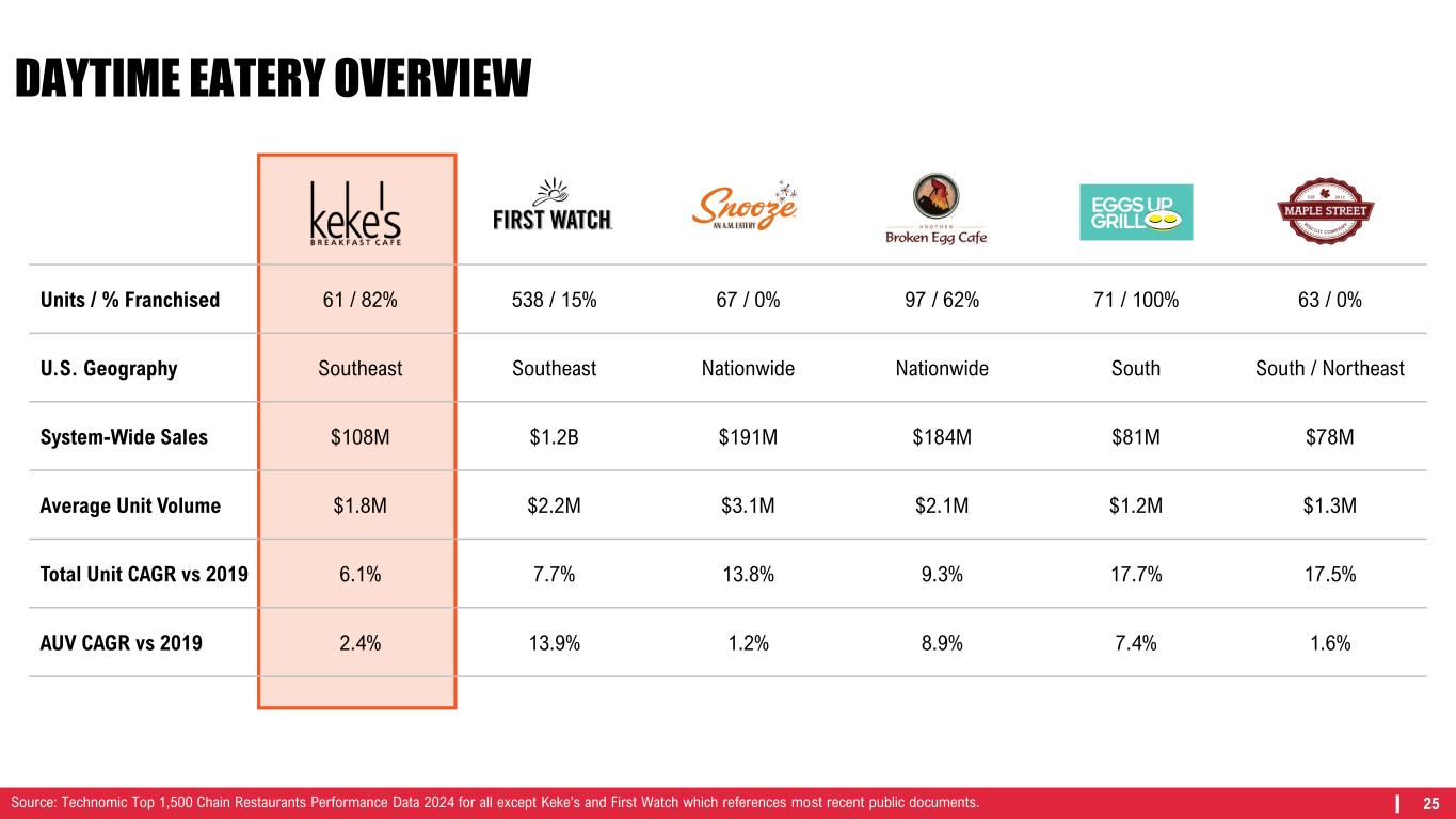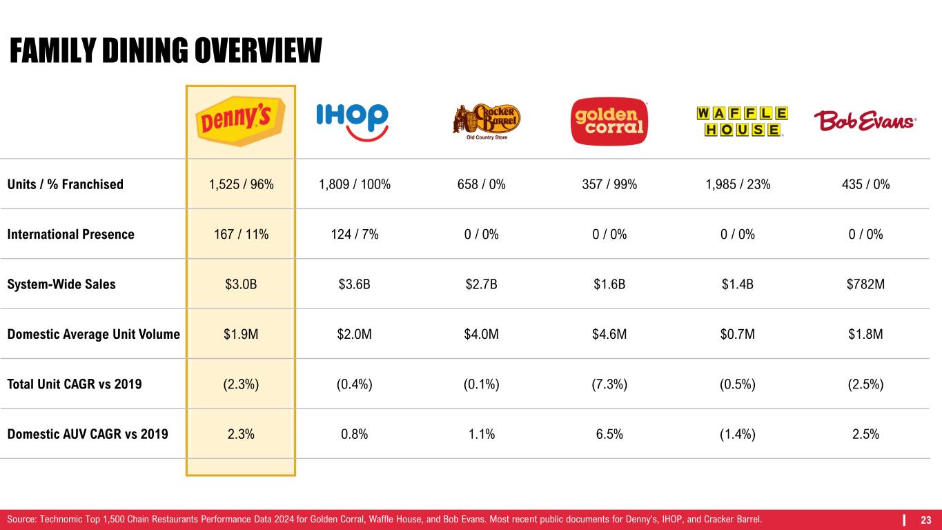 24 (4.2%) (2.6%) (1.9%) (2.4%) (1.0%) (0.5%) (1.3%) 0.2% 0.03% 0.5% (1.4%) (2.0%) (1.9%) 1.0% 1.5% 1.2% 1.1% 2.4% (0.7%) 1.2% (6.0%) (4.0%) (2.0%) 0.0% 2.0% 4.0% Q 2 2 2 Q 3 2 2 Q 4 2 2 Q 1 2 3 Q 2 2 3 Q 3 2 3 Q 4 2 3 Q 1 2 4 Q 2 2 4 Q 3 2 4 Domestic System-Wide Same-Restaurant Sales* Gap vs Family Dining Gap vs Casual Dining FULL-SERVICE DINING OVERVIEW $5,112 $4,784 $4,357 $4,023 $3,958 $3,399 $2,830 $2,808 $2,694 $2,688 Olive Garden Texas Roadhouse Applebee's Chili's Grill & Bar Buffalo Wild Wings IHOP Outback Steakhouse LongHorn Steakhouse Denny's Cracker Barrel Family Dining Accounts for 30% of the Top 10 U.S. Full-Service Restaurants Denny’s has outperformed BBI Family Dining the last three quarters and exceeded BBI Casual Dining in six of the last seven quarters Top 10 U.S. Full Service Restaurants (2023 U.S. System-Wide Sales) ($ in 000’s) 908 638 1,536 1,230 1,264 1,696 688 580 1,407 662 U.S. Units as of 2023# #9 FSR *Same-restaurant sales include sales at company restaurants and non-consolidated franchised and licensed restaurants that were open during the comparable periods noted. Total operating revenue is limited to company restaurant sales and royalties, advertising revenue, initial and other fees and occupancy revenue from non-consolidated franchised and licensed restaurants. Accordingly, domestic franchise same-restaurant sales and domestic system-wide same-restaurant sales should be considered as a supplement to, not a substitute for, the Company’s results as reported under GAAP. Sources: Technomic Top 1,500 Chain Restaurants Performance Data 2024 and Black Box Intelligence.