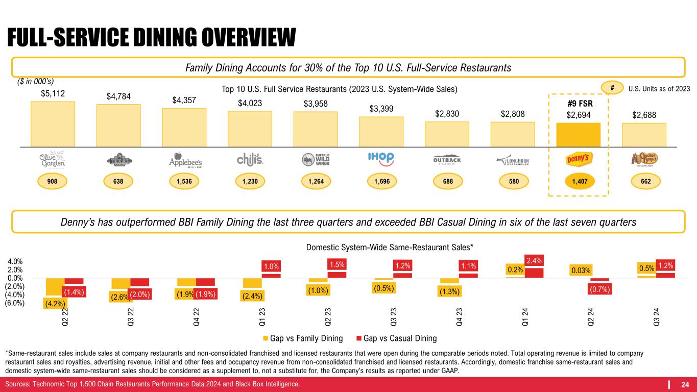 23 FAMILY DINING OVERVIEW Units / % Franchised 1,525 / 96% 1,809 / 100% 658 / 0% 357 / 99% 1,985 / 23% 435 / 0% International Presence 167 / 11% 124 / 7% 0 / 0% 0 / 0% 0 / 0% 0 / 0% System-Wide Sales $3.0B $3.6B $2.7B $1.6B $1.4B $782M Domestic Average Unit Volume $1.9M $2.0M $4.0M $4.6M $0.7M $1.8M Total Unit CAGR vs 2019 (2.3%) (0.4%) (0.1%) (7.3%) (0.5%) (2.5%) Domestic AUV CAGR vs 2019 2.3% 0.8% 1.1% 6.5% (1.4%) 2.5% Source: Technomic Top 1,500 Chain Restaurants Performance Data 2024 for Golden Corral, Waffle House, and Bob Evans. Most recent public documents for Denny’s, IHOP, and Cracker Barrel.
