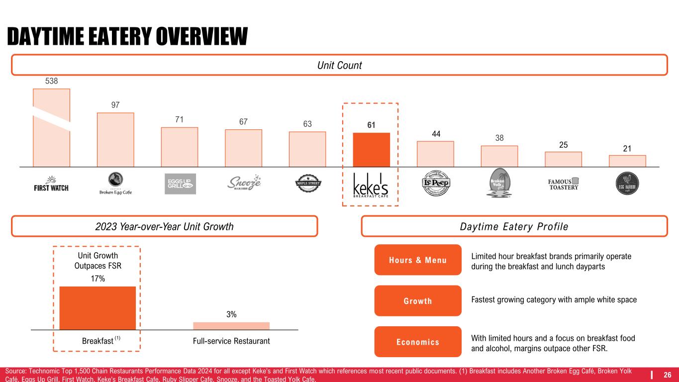 25 DAYTIME EATERY OVERVIEW Units / % Franchised 61 / 82% 538 / 15% 67 / 0% 97 / 62% 71 / 100% 63 / 0% U.S. Geography Southeast Southeast Nationwide Nationwide South South / Northeast System-Wide Sales $108M $1.2B $191M $184M $81M $78M Average Unit Volume $1.8M $2.2M $3.1M $2.1M $1.2M $1.3M Total Unit CAGR vs 2019 6.1% 7.7% 13.8% 9.3% 17.7% 17.5% AUV CAGR vs 2019 2.4% 13.9% 1.2% 8.9% 7.4% 1.6% Source: Technomic Top 1,500 Chain Restaurants Performance Data 2024 for all except Keke’s and First Watch which references most recent public documents.